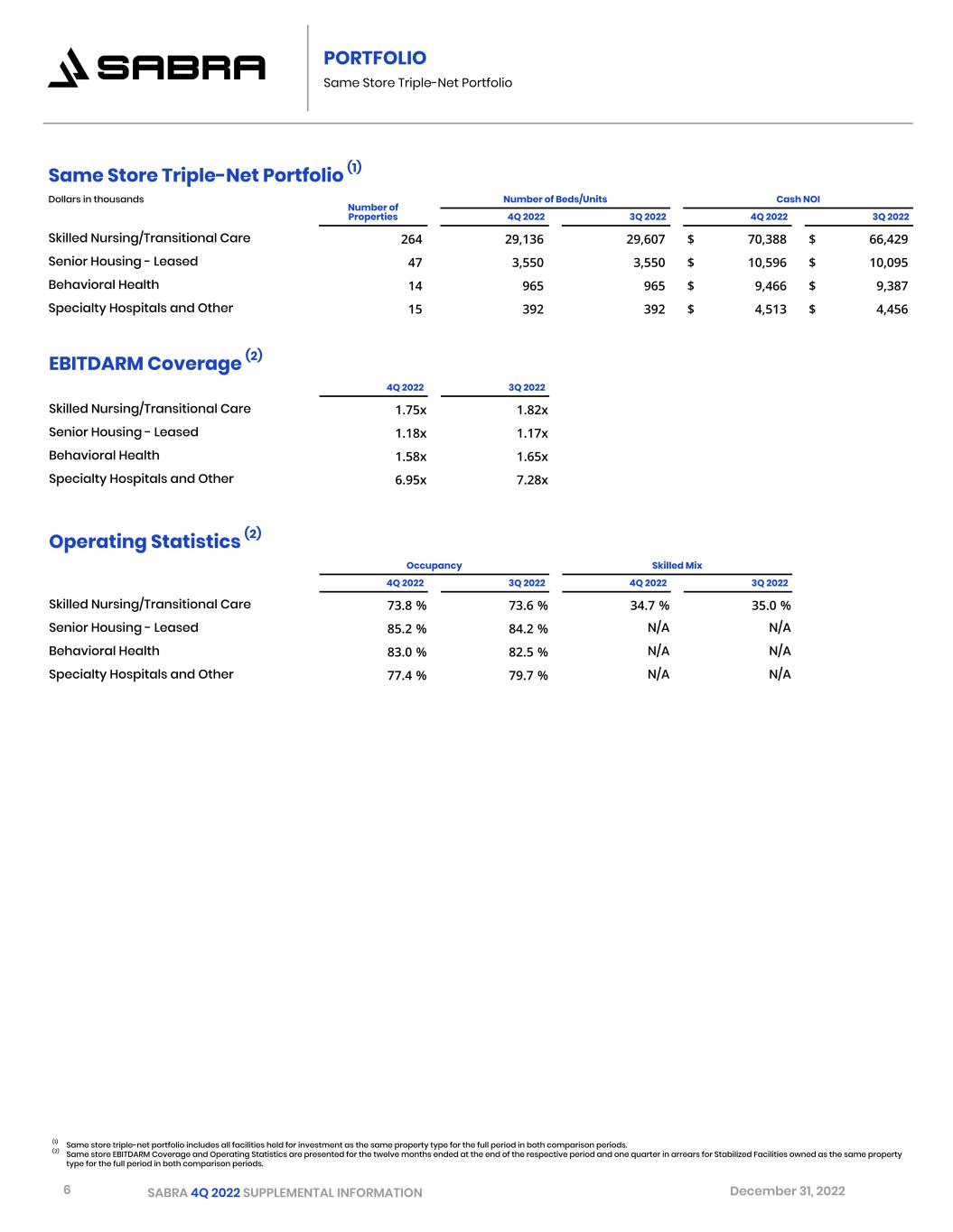 5 SABRA 4Q 2022 SUPPLEMENTAL INFORMATION December 31, 2022 Operating Statistics (2) Dollars in thousands 4Q 2021 1Q 2022 2Q 2022 3Q 2022 4Q 2022 Skilled Nursing/Transitional Care Number of Properties 279 279 272 270 264 Number of Beds 30,920 30,920 30,251 30,205 29,136 Cash NOI $ 71,726 $ 75,500 $ 70,399 $ 68,120 $ 70,998 Occupancy 71.4 % 71.8 % 72.8 % 72.9 % 73.5 % Skilled Mix 39.8 % 38.2 % 37.8 % 33.9 % 34.3 % Senior Housing - Leased Number of Properties 60 59 55 52 47 Number of Units 4,099 4,072 3,965 3,822 3,550 Cash NOI $ 12,097 $ 11,578 $ 10,673 $ 10,166 $ 10,947 Occupancy 78.1 % 78.5 % 79.7 % 81.8 % 84.4 % Behavioral Health Number of Properties 13 13 14 16 17 Number of Beds (3) 795 795 795 965 965 Cash NOI $ 9,522 $ 8,889 $ 9,229 $ 9,397 $ 9,453 Occupancy 84.2 % 84.6 % 83.3 % 83.1 % 84.0 % Specialty Hospitals and Other Number of Properties 15 15 15 15 15 Number of Beds 392 392 392 392 392 Cash NOI $ 4,560 $ 4,456 $ 4,452 $ 4,464 $ 4,518 Occupancy 80.6 % 80.5 % 80.0 % 79.7 % 77.4 % PORTFOLIO Triple-Net Portfolio (1) Triple-Net Portfolio Dollars in thousands As of December 31, 2022 Skilled Nursing/ Transitional Care Senior Housing - Leased Behavioral Health Specialty Hospitals and Other Total Number of Properties 264 47 17 15 343 Number of Beds/Units 29,136 3,550 965 392 34,043 Investment $ 3,385,221 $ 590,694 $ 465,143 $ 225,443 $ 4,666,501 (1) All metrics, except Cash NOI, exclude properties held for sale as of the end of the respective period. (2) Occupancy Percentage and Skilled Mix (together, “Operating Statistics”) and EBITDARM Coverage for each period presented include only Stabilized Facilities owned by the Company as of the end of such period and only for the duration such facilities were owned by the Company and classified as Stabilized Facilities. In addition, EBITDARM Coverage and Operating Statistics are presented for the twelve months ended at the end of the respective period and one quarter in arrears, and therefore, EBITDARM Coverage and Operating Statistics exclude assets acquired after September 30, 2022. 3Q 2022 and 4Q 2022 Operating Statistics exclude our North American Health Care portfolio due to the February 1, 2023 transition to Ensign (20 real estate properties) and Avamere (four real estate properties). Including our North American Health Care portfolio, Skilled Nursing/Transitional Care Occupancy Percentage and Skilled Mix for 3Q 2022 would have been 73.5% and 37.6%, respectively, and for 4Q 2022 would have been 74.1% and 37.9%, respectively. (3) In 2Q 2022 and 4Q 2022, we transitioned one facility to Behavioral Health with zero beds and acquired one facility with zero beds, respectively, and upon completion of construction, these facilities are expected to have 60 beds and 80 beds, respectively. EBITDARM Coverage (2) 4Q 2021 1Q 2022 2Q 2022 3Q 2022 4Q 2022 Skilled Nursing/Transitional Care 1.77x 1.80x 1.80x 1.83x 1.77x Senior Housing - Leased 1.04x 1.02x 1.09x 1.13x 1.19x Behavioral Health 2.06x 1.98x 1.83x 1.72x 1.71x Specialty Hospitals and Other 7.52x 7.52x 7.07x 7.30x 6.95x