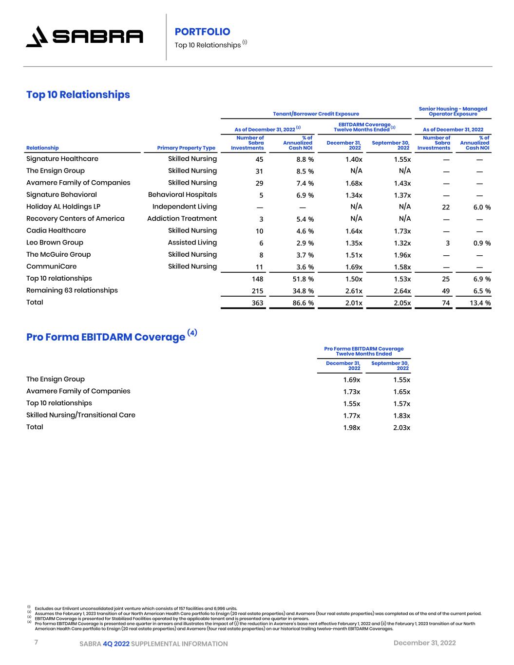 6 SABRA 4Q 2022 SUPPLEMENTAL INFORMATION December 31, 2022 PORTFOLIO Same Store Triple-Net Portfolio (1) Same store triple-net portfolio includes all facilities held for investment as the same property type for the full period in both comparison periods. (2) Same store EBITDARM Coverage and Operating Statistics are presented for the twelve months ended at the end of the respective period and one quarter in arrears for Stabilized Facilities owned as the same property type for the full period in both comparison periods. Same Store Triple-Net Portfolio (1) Dollars in thousands Number of Properties Number of Beds/Units Cash NOI 4Q 2022 3Q 2022 4Q 2022 3Q 2022 Skilled Nursing/Transitional Care 264 29,136 29,607 $ 70,388 $ 66,429 Senior Housing - Leased 47 3,550 3,550 $ 10,596 $ 10,095 Behavioral Health 14 965 965 $ 9,466 $ 9,387 Specialty Hospitals and Other 15 392 392 $ 4,513 $ 4,456 EBITDARM Coverage (2) 4Q 2022 3Q 2022 Skilled Nursing/Transitional Care 1.75x 1.82x Senior Housing - Leased 1.18x 1.17x Behavioral Health 1.58x 1.65x Specialty Hospitals and Other 6.95x 7.28x Operating Statistics (2) Occupancy Skilled Mix 4Q 2022 3Q 2022 4Q 2022 3Q 2022 Skilled Nursing/Transitional Care 73.8 % 73.6 % 34.7 % 35.0 % Senior Housing - Leased 85.2 % 84.2 % N/A N/A Behavioral Health 83.0 % 82.5 % N/A N/A Specialty Hospitals and Other 77.4 % 79.7 % N/A N/A
