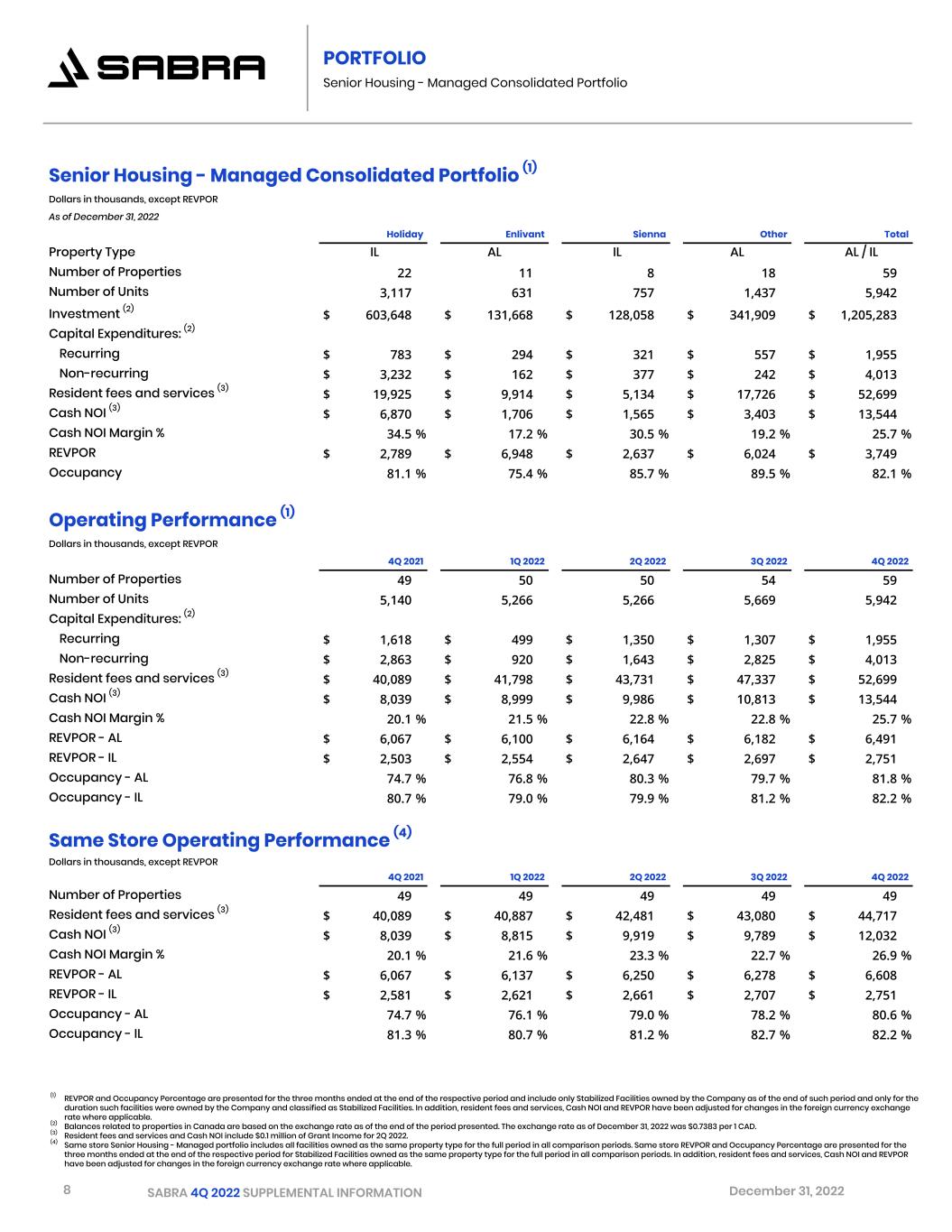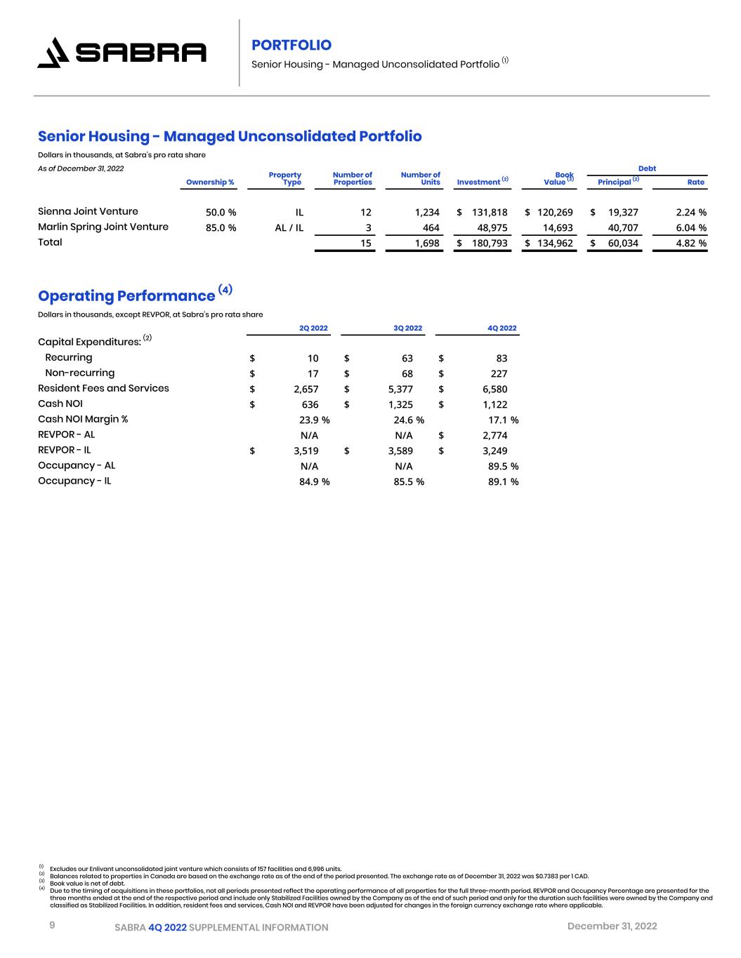 8 SABRA 4Q 2022 SUPPLEMENTAL INFORMATION December 31, 2022 PORTFOLIO Senior Housing - Managed Consolidated Portfolio (1) REVPOR and Occupancy Percentage are presented for the three months ended at the end of the respective period and include only Stabilized Facilities owned by the Company as of the end of such period and only for the duration such facilities were owned by the Company and classified as Stabilized Facilities. In addition, resident fees and services, Cash NOI and REVPOR have been adjusted for changes in the foreign currency exchange rate where applicable. (2) Balances related to properties in Canada are based on the exchange rate as of the end of the period presented. The exchange rate as of December 31, 2022 was $0.7383 per 1 CAD. (3) Resident fees and services and Cash NOI include $0.1 million of Grant Income for 2Q 2022. (4) Same store Senior Housing - Managed portfolio includes all facilities owned as the same property type for the full period in all comparison periods. Same store REVPOR and Occupancy Percentage are presented for the three months ended at the end of the respective period for Stabilized Facilities owned as the same property type for the full period in all comparison periods. In addition, resident fees and services, Cash NOI and REVPOR have been adjusted for changes in the foreign currency exchange rate where applicable. Senior Housing - Managed Consolidated Portfolio (1) Dollars in thousands, except REVPOR As of December 31, 2022 Holiday Enlivant Sienna Other Total Property Type IL AL IL AL AL / IL Number of Properties 22 11 8 18 59 Number of Units 3,117 631 757 1,437 5,942 Investment (2) $ 603,648 $ 131,668 $ 128,058 $ 341,909 $ 1,205,283 Capital Expenditures: (2) Recurring $ 783 $ 294 $ 321 $ 557 $ 1,955 Non-recurring $ 3,232 $ 162 $ 377 $ 242 $ 4,013 Resident fees and services (3) $ 19,925 $ 9,914 $ 5,134 $ 17,726 $ 52,699 Cash NOI (3) $ 6,870 $ 1,706 $ 1,565 $ 3,403 $ 13,544 Cash NOI Margin % 34.5 % 17.2 % 30.5 % 19.2 % 25.7 % REVPOR $ 2,789 $ 6,948 $ 2,637 $ 6,024 $ 3,749 Occupancy 81.1 % 75.4 % 85.7 % 89.5 % 82.1 % Operating Performance (1) Dollars in thousands, except REVPOR 4Q 2021 1Q 2022 2Q 2022 3Q 2022 4Q 2022 Number of Properties 49 50 50 54 59 Number of Units 5,140 5,266 5,266 5,669 5,942 Capital Expenditures: (2) Recurring $ 1,618 $ 499 $ 1,350 $ 1,307 $ 1,955 Non-recurring $ 2,863 $ 920 $ 1,643 $ 2,825 $ 4,013 Resident fees and services (3) $ 40,089 $ 41,798 $ 43,731 $ 47,337 $ 52,699 Cash NOI (3) $ 8,039 $ 8,999 $ 9,986 $ 10,813 $ 13,544 Cash NOI Margin % 20.1 % 21.5 % 22.8 % 22.8 % 25.7 % REVPOR - AL $ 6,067 $ 6,100 $ 6,164 $ 6,182 $ 6,491 REVPOR - IL $ 2,503 $ 2,554 $ 2,647 $ 2,697 $ 2,751 Occupancy - AL 74.7 % 76.8 % 80.3 % 79.7 % 81.8 % Occupancy - IL 80.7 % 79.0 % 79.9 % 81.2 % 82.2 % Same Store Operating Performance (4) Dollars in thousands, except REVPOR 4Q 2021 1Q 2022 2Q 2022 3Q 2022 4Q 2022 Number of Properties 49 49 49 49 49 Resident fees and services (3) $ 40,089 $ 40,887 $ 42,481 $ 43,080 $ 44,717 Cash NOI (3) $ 8,039 $ 8,815 $ 9,919 $ 9,789 $ 12,032 Cash NOI Margin % 20.1 % 21.6 % 23.3 % 22.7 % 26.9 % REVPOR - AL $ 6,067 $ 6,137 $ 6,250 $ 6,278 $ 6,608 REVPOR - IL $ 2,581 $ 2,621 $ 2,661 $ 2,707 $ 2,751 Occupancy - AL 74.7 % 76.1 % 79.0 % 78.2 % 80.6 % Occupancy - IL 81.3 % 80.7 % 81.2 % 82.7 % 82.2 %