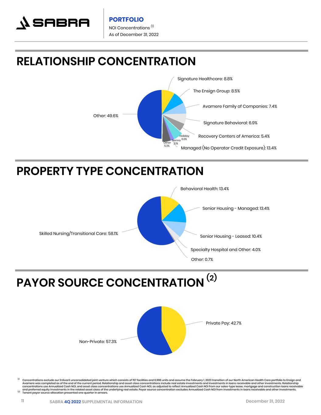 10 SABRA 4Q 2022 SUPPLEMENTAL INFORMATION December 31, 2022 PORTFOLIO Loans and Other Investments Loans Receivable and Other Investments Dollars in thousands As of December 31, 2022 Loan Type Number of Loans Property Type Principal Balance Book Value Weighted Average Contractual Interest Rate Weighted Average Annualized Effective Interest Rate Interest Income Three Months Ended December 31, 2022 (1) Maturity Date Mortgage 2 Behavioral Health $ 319,000 $ 319,000 7.6 % 7.6 % $ 6,048 11/01/26 - 01/31/27 Other 10 Multiple 51,364 47,936 7.1 % 6.6 % 747 02/03/23 - 08/31/28 12 370,364 366,936 7.6 % 7.5 % $ 6,795 Allowance for loan losses — (6,611) $ 370,364 $ 360,325 Other Investment Type Number of Investments Property Type Total Funding Commitments Total Amount Funded Book Value Rate of Return Other Income Three Months Ended December 31, 2022 (1) Preferred Equity 7 Skilled Nursing / Senior Housing $ 80,291 $ 46,729 $ 51,071 10.8 % $ 1,325 (1) Includes income related to loans receivable and other investments held as of December 31, 2022.