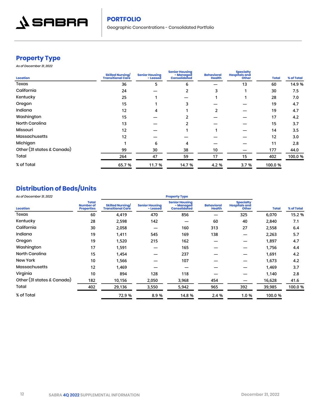 12 SABRA 4Q 2022 SUPPLEMENTAL INFORMATION December 31, 2022 PORTFOLIO Geographic Concentrations - Consolidated Portfolio Property Type As of December 31, 2022 Location Skilled Nursing/ Transitional Care Senior Housing - Leased Senior Housing - Managed Consolidated    Behavioral Health Specialty Hospitals and Other Total % of Total Texas 36 5 6 — 13 60 14.9 % California 24 — 2 3 1 30 7.5 Kentucky 25 1 — 1 1 28 7.0 Oregon 15 1 3 — — 19 4.7 Indiana 12 4 1 2 — 19 4.7 Washington 15 — 2 — — 17 4.2 North Carolina 13 — 2 — — 15 3.7 Missouri 12 — 1 1 — 14 3.5 Massachusetts 12 — — — — 12 3.0 Michigan 1 6 4 — — 11 2.8 Other (31 states & Canada) 99 30 38 10 — 177 44.0 Total 264 47 59 17 15 402 100.0 % % of Total 65.7 % 11.7 % 14.7 % 4.2 % 3.7 % 100.0 % Distribution of Beds/Units As of December 31, 2022   Property Type Location Total Number of Properties Skilled Nursing/ Transitional Care Senior Housing - Leased Senior Housing - Managed Consolidated    Behavioral Health Specialty Hospitals and Other Total % of Total Texas 60 4,419 470 856 — 325 6,070 15.2 % Kentucky 28 2,598 142 — 60 40 2,840 7.1 California 30 2,058 — 160 313 27 2,558 6.4 Indiana 19 1,411 545 169 138 — 2,263 5.7 Oregon 19 1,520 215 162 — — 1,897 4.7 Washington 17 1,591 — 165 — — 1,756 4.4 North Carolina 15 1,454 — 237 — — 1,691 4.2 New York 10 1,566 — 107 — — 1,673 4.2 Massachusetts 12 1,469 — — — — 1,469 3.7 Virginia 10 894 128 118 — — 1,140 2.8 Other (31 states & Canada) 182 10,156 2,050 3,968 454 — 16,628 41.6 Total 402 29,136 3,550 5,942 965 392 39,985 100.0 % % of Total 72.9 % 8.9 % 14.8 % 2.4 % 1.0 % 100.0 %