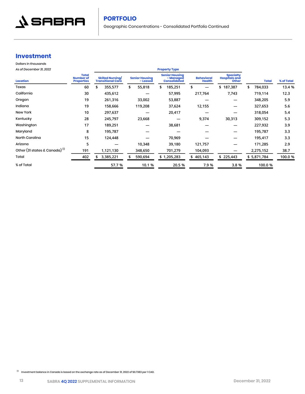 13 SABRA 4Q 2022 SUPPLEMENTAL INFORMATION December 31, 2022 PORTFOLIO Geographic Concentrations - Consolidated Portfolio Continued Investment Dollars in thousands As of December 31, 2022   Property Type Location Total Number of Properties Skilled Nursing/ Transitional Care Senior Housing - Leased Senior Housing - Managed Consolidated    Behavioral Health Specialty Hospitals and Other    Total % of Total Texas 60 $ 355,577 $ 55,818 $ 185,251 $ — $ 187,387 $ 784,033 13.4 % California 30 435,612 — 57,995 217,764 7,743 719,114 12.3 Oregon 19 261,316 33,002 53,887 — — 348,205 5.9 Indiana 19 158,666 119,208 37,624 12,155 — 327,653 5.6 New York 10 297,637 — 20,417 — — 318,054 5.4 Kentucky 28 245,797 23,668 — 9,374 30,313 309,152 5.3 Washington 17 189,251 — 38,681 — — 227,932 3.9 Maryland 8 195,787 — — — — 195,787 3.3 North Carolina 15 124,448 — 70,969 — — 195,417 3.3 Arizona 5 — 10,348 39,180 121,757 — 171,285 2.9 Other (31 states & Canada) (1) 191 1,121,130 348,650 701,279 104,093 — 2,275,152 38.7 Total 402 $ 3,385,221 $ 590,694 $ 1,205,283 $ 465,143 $ 225,443 $ 5,871,784 100.0 % % of Total 57.7 % 10.1 % 20.5 % 7.9 % 3.8 % 100.0 % (1) Investment balance in Canada is based on the exchange rate as of December 31, 2022 of $0.7383 per 1 CAD.