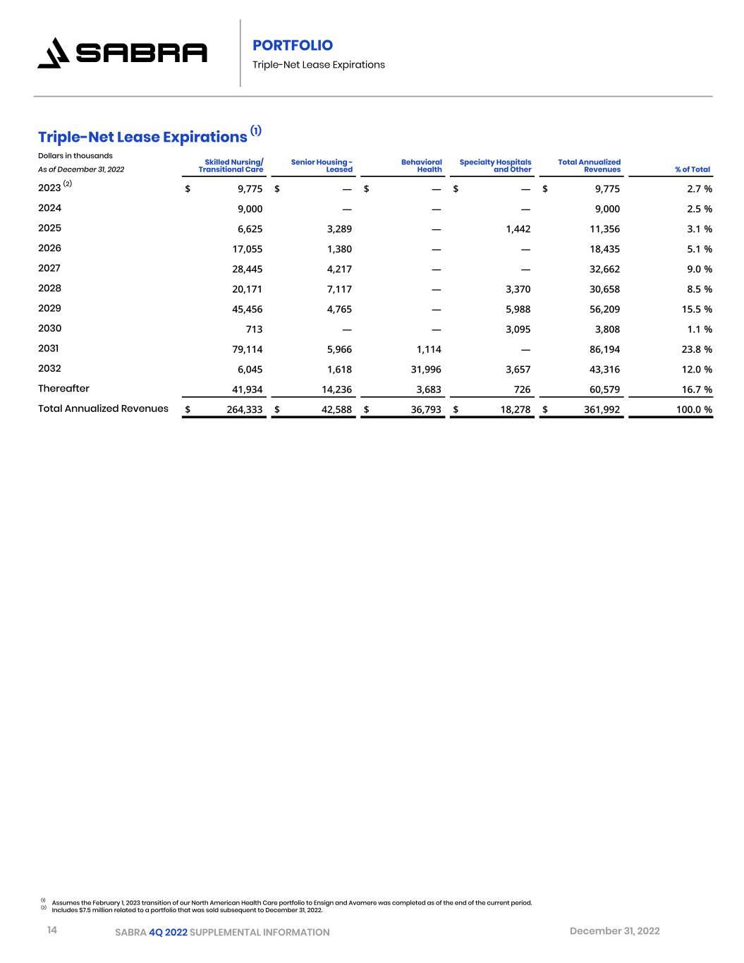 14 SABRA 4Q 2022 SUPPLEMENTAL INFORMATION December 31, 2022 PORTFOLIO Triple-Net Lease Expirations Triple-Net Lease Expirations (1) Dollars in thousands Skilled Nursing/ Transitional Care Senior Housing - Leased Behavioral Health Specialty Hospitals and Other Total Annualized RevenuesAs of December 31, 2022   % of Total 2023 (2) $ 9,775 $ — $ — $ — $ 9,775 2.7 % 2024 9,000 — — — 9,000 2.5 % 2025 6,625 3,289 — 1,442 11,356 3.1 % 2026 17,055 1,380 — — 18,435 5.1 % 2027 28,445 4,217 — — 32,662 9.0 % 2028 20,171 7,117 — 3,370 30,658 8.5 % 2029 45,456 4,765 — 5,988 56,209 15.5 % 2030 713 — — 3,095 3,808 1.1 % 2031 79,114 5,966 1,114 — 86,194 23.8 % 2032 6,045 1,618 31,996 3,657 43,316 12.0 % Thereafter 41,934 14,236 3,683 726 60,579 16.7 % Total Annualized Revenues $ 264,333 $ 42,588 $ 36,793 $ 18,278 $ 361,992 100.0 % (1) Assumes the February 1, 2023 transition of our North American Health Care portfolio to Ensign and Avamere was completed as of the end of the current period. (2) Includes $7.5 million related to a portfolio that was sold subsequent to December 31, 2022.