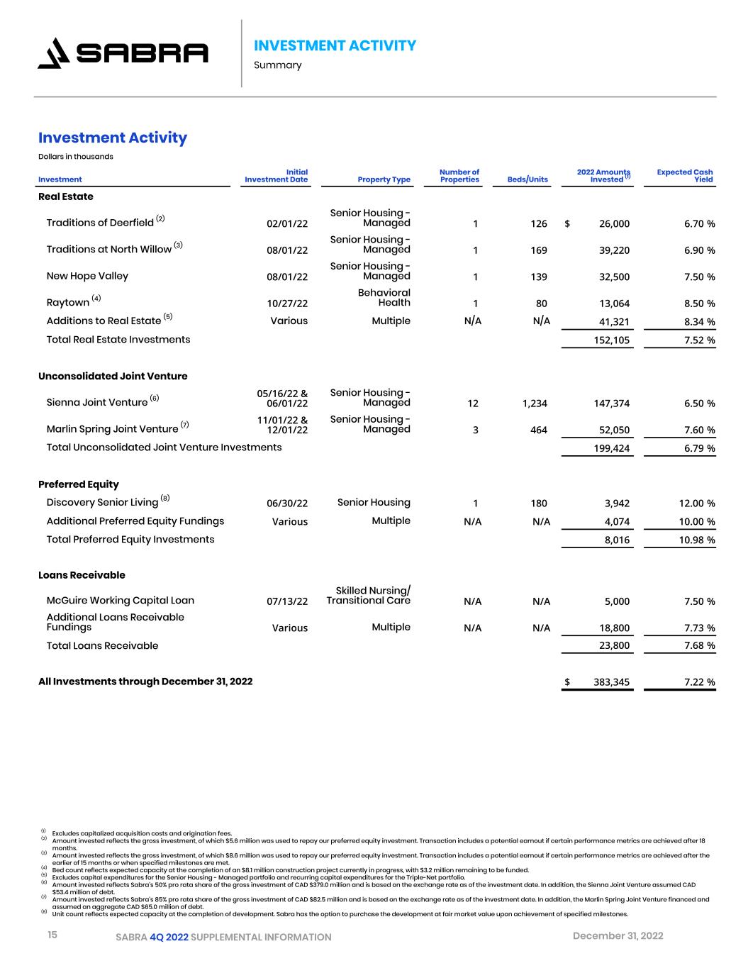 15 SABRA 4Q 2022 SUPPLEMENTAL INFORMATION December 31, 2022 INVESTMENT ACTIVITY Summary Investment Activity Dollars in thousands Investment Initial Investment Date Property Type Number of Properties Beds/Units 2022 Amounts Invested (1) Expected Cash Yield Real Estate Traditions of Deerfield (2) 02/01/22 Senior Housing - Managed 1 126 $ 26,000 6.70 % Traditions at North Willow (3) 08/01/22 Senior Housing - Managed 1 169 39,220 6.90 % New Hope Valley 08/01/22 Senior Housing - Managed 1 139 32,500 7.50 % Raytown (4) 10/27/22 Behavioral Health 1 80 13,064 8.50 % Additions to Real Estate (5) Various Multiple N/A N/A 41,321 8.34 % Total Real Estate Investments 152,105 7.52 % Unconsolidated Joint Venture Sienna Joint Venture (6) 05/16/22 & 06/01/22 Senior Housing - Managed 12 1,234 147,374 6.50 % Marlin Spring Joint Venture (7) 11/01/22 & 12/01/22 Senior Housing - Managed 3 464 52,050 7.60 % Total Unconsolidated Joint Venture Investments 199,424 6.79 % Preferred Equity Discovery Senior Living (8) 06/30/22 Senior Housing 1 180 3,942 12.00 % Additional Preferred Equity Fundings Various Multiple N/A N/A 4,074 10.00 % Total Preferred Equity Investments 8,016 10.98 % Loans Receivable McGuire Working Capital Loan 07/13/22 Skilled Nursing/ Transitional Care N/A N/A 5,000 7.50 % Additional Loans Receivable Fundings Various Multiple N/A N/A 18,800 7.73 % Total Loans Receivable 23,800 7.68 % All Investments through December 31, 2022 $ 383,345 7.22 % (1) Excludes capitalized acquisition costs and origination fees. (2) Amount invested reflects the gross investment, of which $5.6 million was used to repay our preferred equity investment. Transaction includes a potential earnout if certain performance metrics are achieved after 18 months. (3) Amount invested reflects the gross investment, of which $8.6 million was used to repay our preferred equity investment. Transaction includes a potential earnout if certain performance metrics are achieved after the earlier of 15 months or when specified milestones are met. (4) Bed count reflects expected capacity at the completion of an $8.1 million construction project currently in progress, with $3.2 million remaining to be funded. (5) Excludes capital expenditures for the Senior Housing - Managed portfolio and recurring capital expenditures for the Triple-Net portfolio. (6) Amount invested reflects Sabra's 50% pro rata share of the gross investment of CAD $379.0 million and is based on the exchange rate as of the investment date. In addition, the Sienna Joint Venture assumed CAD $53.4 million of debt. (7) Amount invested reflects Sabra's 85% pro rata share of the gross investment of CAD $82.5 million and is based on the exchange rate as of the investment date. In addition, the Marlin Spring Joint Venture financed and assumed an aggregate CAD $65.0 million of debt. (8) Unit count reflects expected capacity at the completion of development. Sabra has the option to purchase the development at fair market value upon achievement of specified milestones.