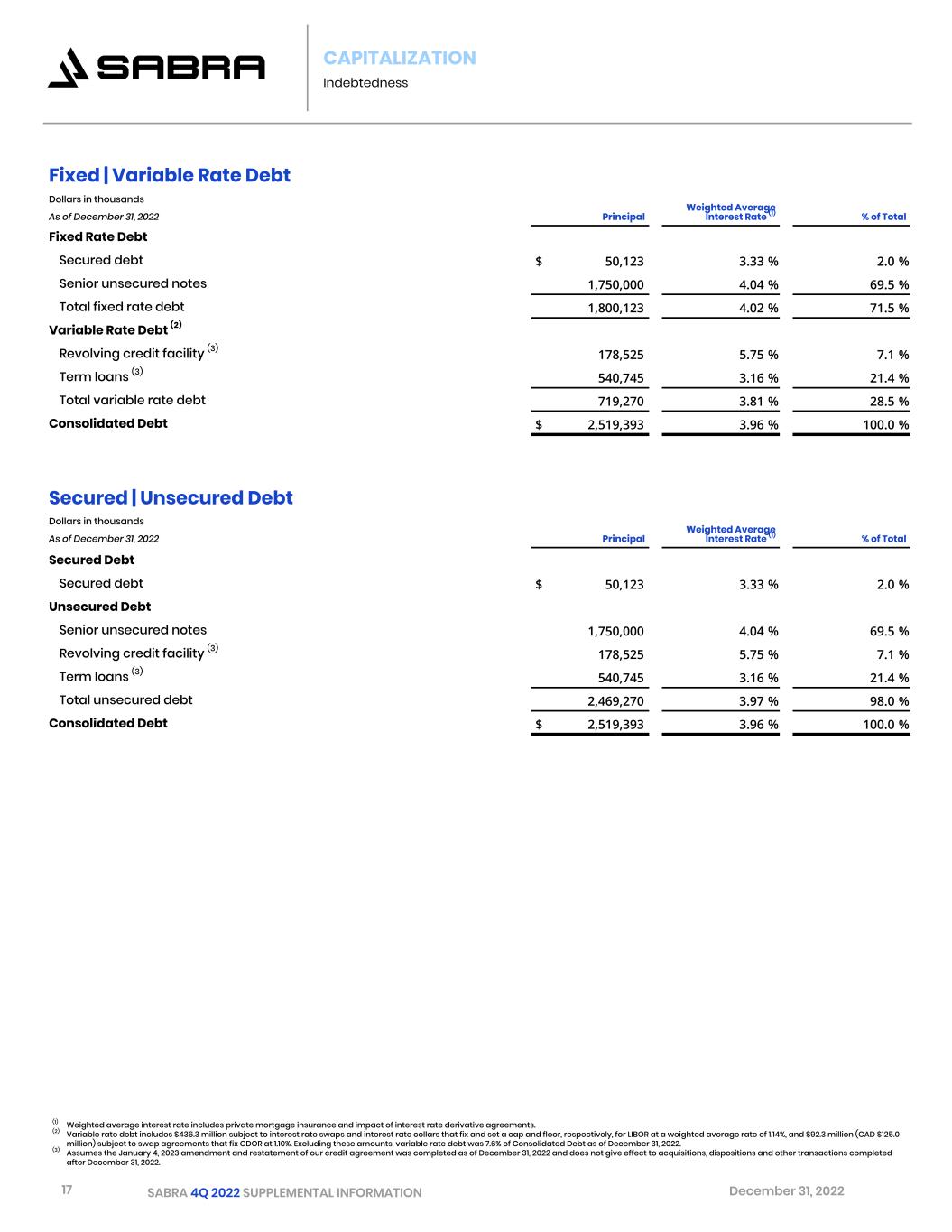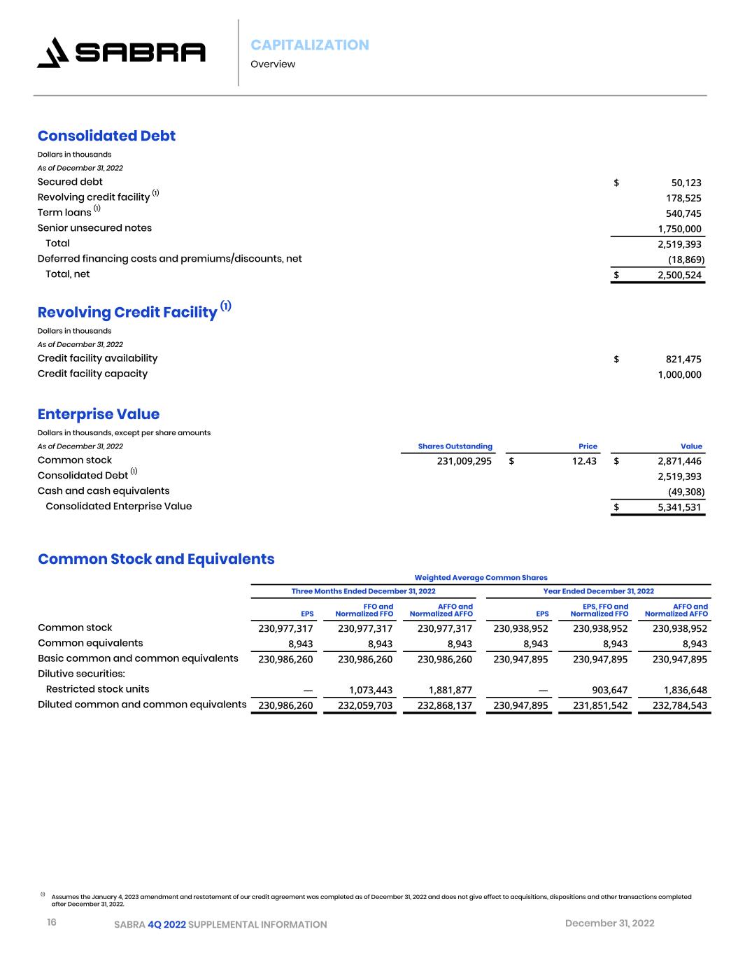 16 SABRA 4Q 2022 SUPPLEMENTAL INFORMATION December 31, 2022 CAPITALIZATION Overview Consolidated Debt Dollars in thousands As of December 31, 2022 Secured debt $ 50,123 Revolving credit facility (1) 178,525 Term loans (1) 540,745 Senior unsecured notes 1,750,000 Total 2,519,393 Deferred financing costs and premiums/discounts, net (18,869) Total, net $ 2,500,524 Revolving Credit Facility (1) Dollars in thousands As of December 31, 2022 Credit facility availability $ 821,475 Credit facility capacity 1,000,000 Enterprise Value Dollars in thousands, except per share amounts As of December 31, 2022 Shares Outstanding   Price   Value Common stock 231,009,295 $ 12.43 $ 2,871,446 Consolidated Debt (1) 2,519,393 Cash and cash equivalents (49,308) Consolidated Enterprise Value $ 5,341,531 Common Stock and Equivalents Weighted Average Common Shares Three Months Ended December 31, 2022 Year Ended December 31, 2022 EPS FFO and Normalized FFO AFFO and Normalized AFFO EPS EPS, FFO and Normalized FFO AFFO and Normalized AFFO Common stock 230,977,317 230,977,317 230,977,317 230,938,952 230,938,952 230,938,952 Common equivalents 8,943 8,943 8,943 8,943 8,943 8,943 Basic common and common equivalents 230,986,260 230,986,260 230,986,260 230,947,895 230,947,895 230,947,895 Dilutive securities: Restricted stock units — 1,073,443 1,881,877 — 903,647 1,836,648 Diluted common and common equivalents 230,986,260 232,059,703 232,868,137 230,947,895 231,851,542 232,784,543 (1) Assumes the January 4, 2023 amendment and restatement of our credit agreement was completed as of December 31, 2022 and does not give effect to acquisitions, dispositions and other transactions completed after December 31, 2022.