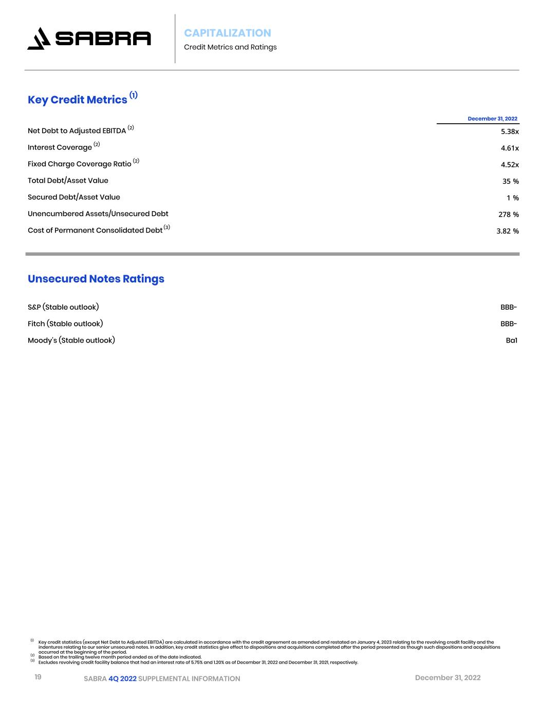 18 SABRA 4Q 2022 SUPPLEMENTAL INFORMATION December 31, 2022 CAPITALIZATION Debt Maturity Debt Maturity Schedule Dollars in thousands Secured Debt Senior Unsecured Notes   Term Loans (1)     Revolving Credit Facility (1) Consolidated Debt As of December 31, 2022 Principal Rate (2) Principal Rate (2)   Principal Rate (2)     Principal Rate (2) Principal Rate (2) 2023 $ 1,979   2.84 %   $ —   —     $ —   —     $ — — $ 1,979   2.84 % 2024 2,034   2.85 %   —   —     —   —     — — 2,034   2.85 % 2025 2,089   2.86 %   —   —     —   —     — — 2,089   2.86 % 2026 2,147   2.86 %   500,000   5.13 % —   —     — — 502,147   5.12 % 2027 2,206   2.87 %   100,000   5.88 % —   —     178,525 5.75 % 280,731   5.77 % 2028 2,266   2.88 %   —   —     540,745   5.72 %     — — 543,011   5.71 % 2029 2,328   2.89 %   350,000 3.90 % —   —     — — 352,328   3.89 % 2030 2,392   2.90 %   —   —     —   —     — — 2,392   2.90 % 2031 2,093   2.92 %   800,000   3.20 %     —   —     — — 802,093   3.20 % 2032 1,887   2.92 % — — — — — — 1,887 2.92 % Thereafter 28,702   3.09 %   —   —     —   —     — — 28,702   3.09 % Total 50,123   1,750,000 540,745     178,525 2,519,393 Discount, net — (3,545) — — (3,545) Deferred financing costs, net (891) (12,024) (2,409) — (15,324) Total, net $ 49,232 $ 1,734,431 $ 538,336     $ 178,525 $ 2,500,524 Wtd. avg. maturity/years 21.9   6.7 5.0     4.0 6.5 Wtd. avg. interest rate (3) 3.33 %   4.04 % 3.16 %     5.75 % 3.96 % (1) Assumes the January 4, 2023 amendment and restatement of our credit agreement was completed as of December 31, 2022 and does not give effect to acquisitions, dispositions and other transactions completed after December 31, 2022. Revolving Credit Facility is subject to two six-month extension options. (2) Represents actual contractual interest rates excluding private mortgage insurance and impact of interest rate derivative agreements. (3) Weighted average interest rate includes private mortgage insurance and impact of interest rate derivative agreements.