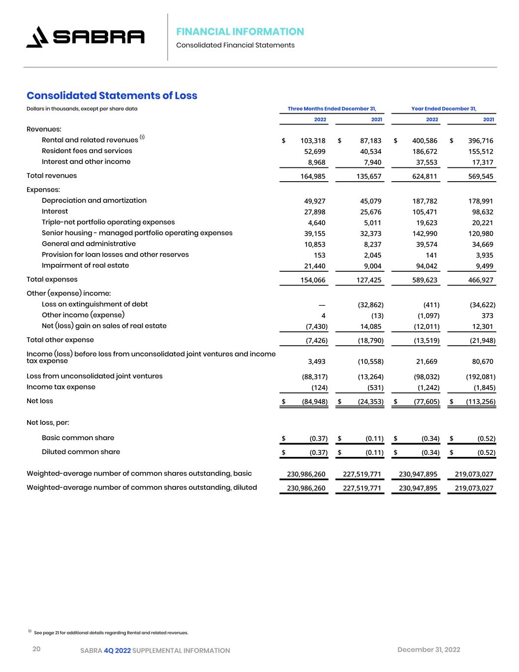 20 SABRA 4Q 2022 SUPPLEMENTAL INFORMATION December 31, 2022 FINANCIAL INFORMATION Consolidated Financial Statements Consolidated Statements of Loss Dollars in thousands, except per share data Three Months Ended December 31, Year Ended December 31,   2022 2021 2022 2021 Revenues: Rental and related revenues (1) $ 103,318 $ 87,183 $ 400,586 $ 396,716 Resident fees and services 52,699 40,534 186,672 155,512 Interest and other income 8,968 7,940 37,553 17,317       Total revenues 164,985 135,657 624,811 569,545     Expenses: Depreciation and amortization 49,927 45,079 187,782 178,991 Interest 27,898 25,676 105,471 98,632 Triple-net portfolio operating expenses 4,640 5,011 19,623 20,221 Senior housing - managed portfolio operating expenses 39,155 32,373 142,990 120,980 General and administrative 10,853 8,237 39,574 34,669 Provision for loan losses and other reserves 153 2,045 141 3,935 Impairment of real estate 21,440 9,004 94,042 9,499       Total expenses 154,066 127,425 589,623 466,927     Other (expense) income: Loss on extinguishment of debt — (32,862) (411) (34,622) Other income (expense) 4 (13) (1,097) 373 Net (loss) gain on sales of real estate (7,430) 14,085 (12,011) 12,301 Total other expense (7,426) (18,790) (13,519) (21,948) Income (loss) before loss from unconsolidated joint ventures and income tax expense 3,493 (10,558) 21,669 80,670 Loss from unconsolidated joint ventures (88,317) (13,264) (98,032) (192,081) Income tax expense (124) (531) (1,242) (1,845) Net loss $ (84,948) $ (24,353) $ (77,605) $ (113,256)     Net loss, per: Basic common share $ (0.37) $ (0.11) $ (0.34) $ (0.52)         Diluted common share $ (0.37) $ (0.11) $ (0.34) $ (0.52)         Weighted-average number of common shares outstanding, basic 230,986,260 227,519,771 230,947,895 219,073,027   Weighted-average number of common shares outstanding, diluted 230,986,260 227,519,771 230,947,895 219,073,027 (1) See page 21 for additional details regarding Rental and related revenues.