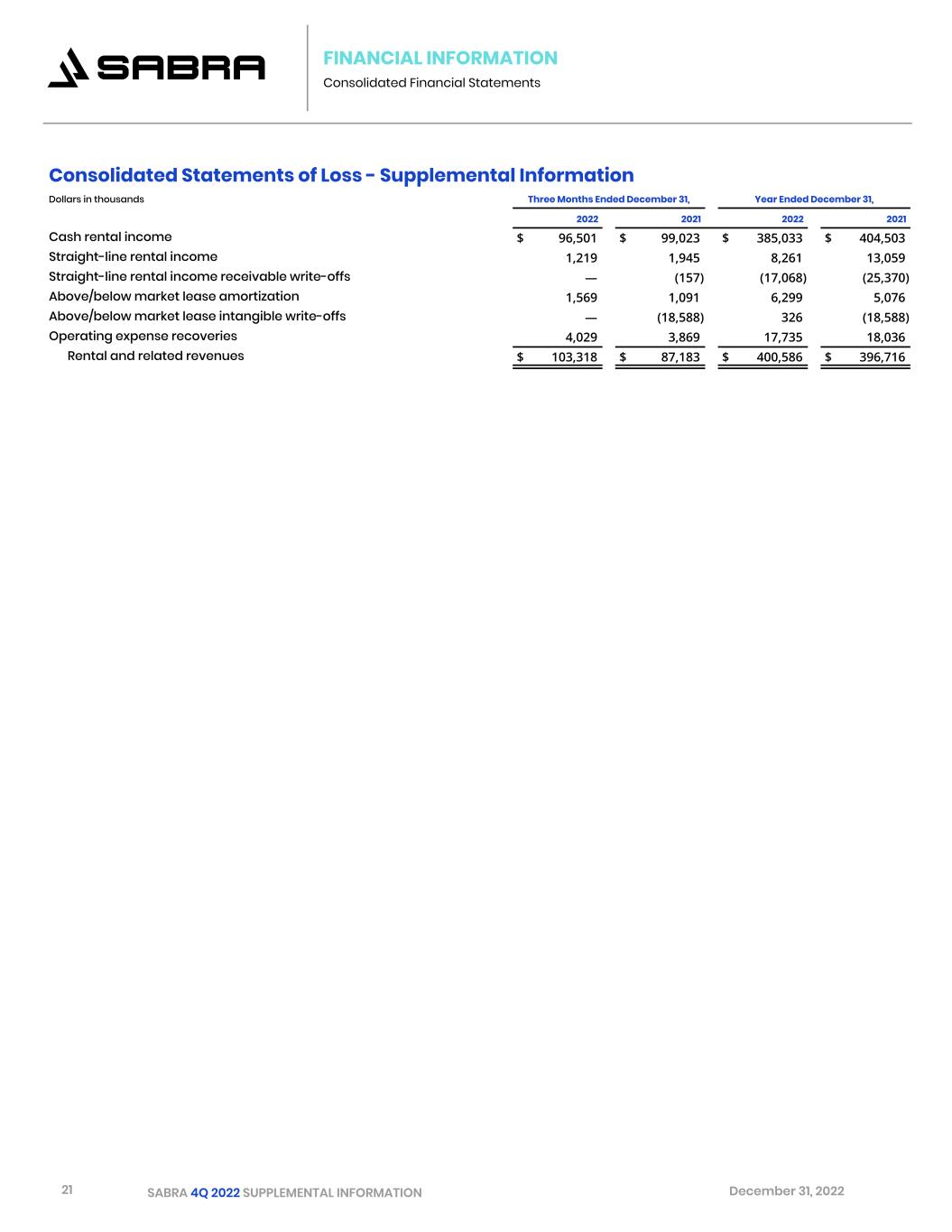 21 SABRA 4Q 2022 SUPPLEMENTAL INFORMATION December 31, 2022 FINANCIAL INFORMATION Consolidated Financial Statements Consolidated Statements of Loss - Supplemental Information Dollars in thousands Three Months Ended December 31, Year Ended December 31,   2022 2021 2022 2021 Cash rental income $ 96,501 $ 99,023 $ 385,033 $ 404,503 Straight-line rental income 1,219 1,945 8,261 13,059 Straight-line rental income receivable write-offs — (157) (17,068) (25,370) Above/below market lease amortization 1,569 1,091 6,299 5,076 Above/below market lease intangible write-offs — (18,588) 326 (18,588) Operating expense recoveries 4,029 3,869 17,735 18,036 Rental and related revenues $ 103,318 $ 87,183 $ 400,586 $ 396,716