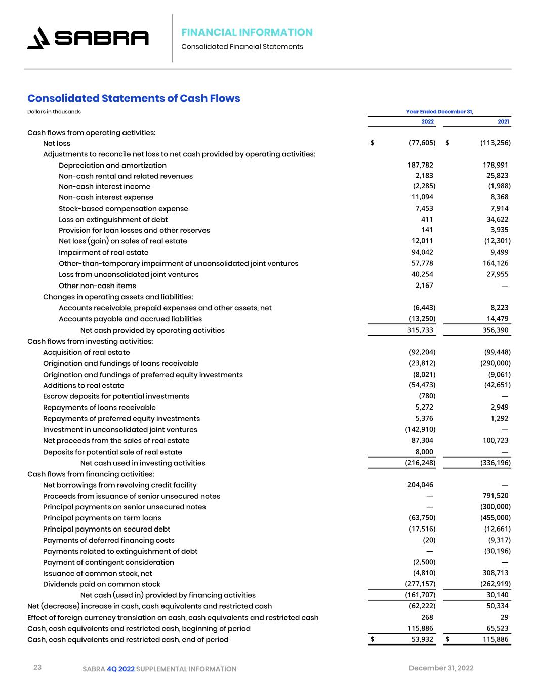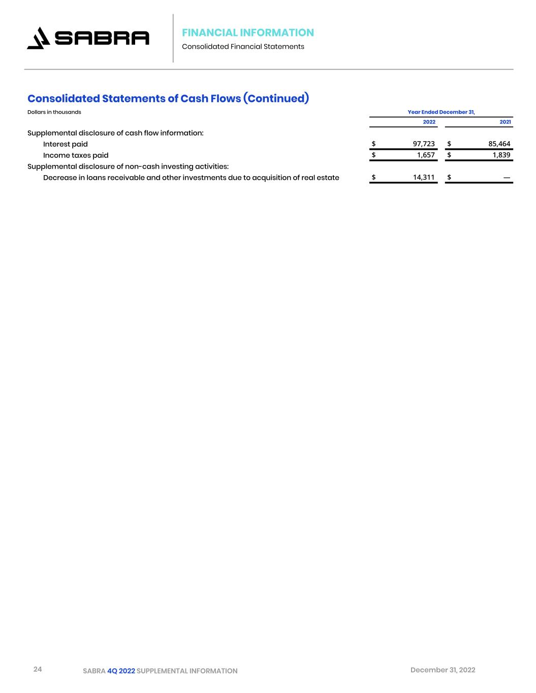23 SABRA 4Q 2022 SUPPLEMENTAL INFORMATION December 31, 2022 FINANCIAL INFORMATION Consolidated Financial Statements Consolidated Statements of Cash Flows Dollars in thousands Year Ended December 31, 2022 2021 Cash flows from operating activities: Net loss $ (77,605) $ (113,256) Adjustments to reconcile net loss to net cash provided by operating activities: Depreciation and amortization 187,782 178,991 Non-cash rental and related revenues 2,183 25,823 Non-cash interest income (2,285) (1,988) Non-cash interest expense 11,094 8,368 Stock-based compensation expense 7,453 7,914 Loss on extinguishment of debt 411 34,622 Provision for loan losses and other reserves 141 3,935 Net loss (gain) on sales of real estate 12,011 (12,301) Impairment of real estate 94,042 9,499 Other-than-temporary impairment of unconsolidated joint ventures 57,778 164,126 Loss from unconsolidated joint ventures 40,254 27,955 Other non-cash items 2,167 — Changes in operating assets and liabilities: Accounts receivable, prepaid expenses and other assets, net (6,443) 8,223 Accounts payable and accrued liabilities (13,250) 14,479 Net cash provided by operating activities 315,733 356,390 Cash flows from investing activities: Acquisition of real estate (92,204) (99,448) Origination and fundings of loans receivable (23,812) (290,000) Origination and fundings of preferred equity investments (8,021) (9,061) Additions to real estate (54,473) (42,651) Escrow deposits for potential investments (780) — Repayments of loans receivable 5,272 2,949 Repayments of preferred equity investments 5,376 1,292 Investment in unconsolidated joint ventures (142,910) — Net proceeds from the sales of real estate 87,304 100,723 Deposits for potential sale of real estate 8,000 — Net cash used in investing activities (216,248) (336,196) Cash flows from financing activities: Net borrowings from revolving credit facility 204,046 — Proceeds from issuance of senior unsecured notes — 791,520 Principal payments on senior unsecured notes — (300,000) Principal payments on term loans (63,750) (455,000) Principal payments on secured debt (17,516) (12,661) Payments of deferred financing costs (20) (9,317) Payments related to extinguishment of debt — (30,196) Payment of contingent consideration (2,500) — Issuance of common stock, net (4,810) 308,713 Dividends paid on common stock (277,157) (262,919) Net cash (used in) provided by financing activities (161,707) 30,140 Net (decrease) increase in cash, cash equivalents and restricted cash (62,222) 50,334 Effect of foreign currency translation on cash, cash equivalents and restricted cash 268 29 Cash, cash equivalents and restricted cash, beginning of period 115,886 65,523 Cash, cash equivalents and restricted cash, end of period $ 53,932 $ 115,886