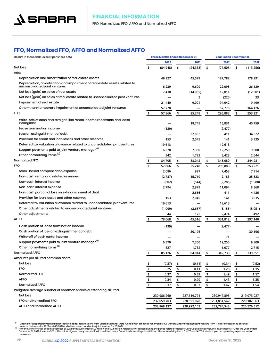25 SABRA 4Q 2022 SUPPLEMENTAL INFORMATION December 31, 2022 FINANCIAL INFORMATION FFO, Normalized FFO, AFFO and Normalized AFFO (1) Funding for support payments did not require capital contributions from Sabra but rather were funded with proceeds received by our Enlivant unconsolidated joint venture from TPG for the issuance of senior preferred interests for 2022 and 4Q 2021 and with cash on hand at the joint venture for 2Q 2021. (2) FFO and AFFO for year ended December 31, 2022 and 2021 includes $1.2 million and $0.4 million, respectively, earned during the period related to legacy Care Capital Properties, Inc. investments. FFO for the year ended December 31, 2022, includes $2.2 million of foreign currency transaction loss related to our Canadian borrowings. In addition, other normalizing items for FFO and AFFO include triple-net operating expenses, net of recoveries. FFO, Normalized FFO, AFFO and Normalized AFFO Dollars in thousands, except per share data Three Months Ended December 31, Year Ended December 31,   2022 2021 2022 2021 Net loss $ (84,948) $ (24,353) $ (77,605) $ (113,256) Add: Depreciation and amortization of real estate assets 49,927 45,079 187,782 178,991 Depreciation, amortization and impairment of real estate assets related to unconsolidated joint ventures 6,239 9,600 22,095 26,129 Net loss (gain) on sales of real estate 7,430 (14,085) 12,011 (12,301) Net loss (gain) on sales of real estate related to unconsolidated joint ventures — 3 (220) 33 Impairment of real estate 21,440 9,004 94,042 9,499 Other-than-temporary impairment of unconsolidated joint ventures 57,778 — 57,778 164,126 FFO $ 57,866 $ 25,248 $ 295,883 $ 253,221 Write-offs of cash and straight-line rental income receivable and lease intangibles — 18,745 15,831 40,759 Lease termination income (139) — (2,477) — Loss on extinguishment of debt — 32,862 411 34,622 Provision for credit and loan losses and other reserves 153 2,045 141 3,935 Deferred tax valuation allowance related to unconsolidated joint ventures 19,613 — 19,613 — Support payments paid to joint venture manager (1) 6,370 7,350 12,250 9,800 Other normalizing items (2) 842 1,792 3,428 2,644 Normalized FFO $ 84,705 $ 88,042 $ 345,080 $ 344,981 FFO $ 57,866 $ 25,248 $ 295,883 $ 253,221 Stock-based compensation expense 2,086 927 7,453 7,914 Non-cash rental and related revenues (2,787) 15,710 2,183 25,823 Non-cash interest income (602) (544) (2,285) (1,988) Non-cash interest expense 2,794 2,979 11,094 8,368 Non-cash portion of loss on extinguishment of debt — 2,666 411 4,426 Provision for loan losses and other reserves 153 2,045 141 3,935 Deferred tax valuation allowance related to unconsolidated joint ventures 19,613 — 19,613 — Other adjustments related to unconsolidated joint ventures (1,099) (3,687) (5,155) (5,051) Other adjustments 44 172 2,474 492 AFFO $ 78,068 $ 45,516 $ 331,812 $ 297,140 Cash portion of lease termination income (139) — (2,477) — Cash portion of loss on extinguishment of debt — 30,196 — 30,196 Write-off of cash rental income — — 71 — Support payments paid to joint venture manager (1) 6,370 7,350 12,250 9,800 Other normalizing items (2) 827 1,752 1,077 2,715 Normalized AFFO $ 85,126 $ 84,814 $ 342,733 $ 339,851 Amounts per diluted common share: Net loss $ (0.37) $ (0.11) $ (0.34) $ (0.52) FFO $ 0.25 $ 0.11 $ 1.28 $ 1.15 Normalized FFO $ 0.37 $ 0.39 $ 1.49 $ 1.57 AFFO $ 0.34 $ 0.20 $ 1.43 $ 1.35 Normalized AFFO $ 0.37 $ 0.37 $ 1.47 $ 1.54 Weighted average number of common shares outstanding, diluted: Net loss 230,986,260 227,519,771 230,947,895 219,073,027 FFO and Normalized FFO 232,059,703 228,591,078 231,851,542 220,102,563 AFFO and Normalized AFFO 232,868,137 228,992,103 232,784,543 220,526,512