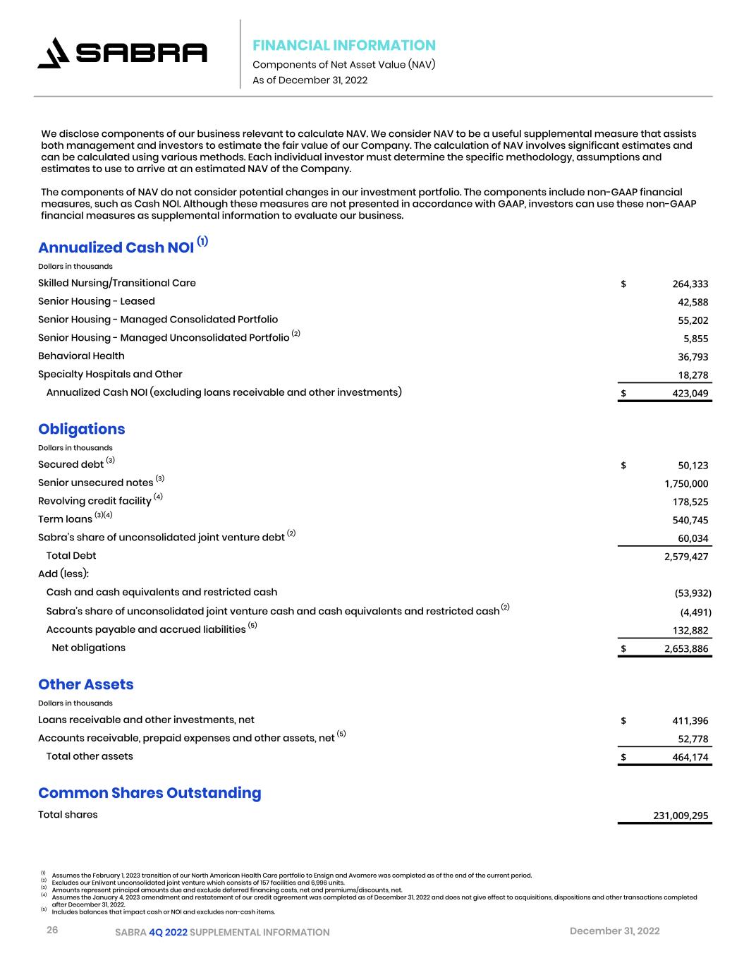 26 SABRA 4Q 2022 SUPPLEMENTAL INFORMATION December 31, 2022 FINANCIAL INFORMATION Components of Net Asset Value (NAV) As of December 31, 2022 (1) Assumes the February 1, 2023 transition of our North American Health Care portfolio to Ensign and Avamere was completed as of the end of the current period. (2) Excludes our Enlivant unconsolidated joint venture which consists of 157 facilities and 6,996 units. (3) Amounts represent principal amounts due and exclude deferred financing costs, net and premiums/discounts, net. (4) Assumes the January 4, 2023 amendment and restatement of our credit agreement was completed as of December 31, 2022 and does not give effect to acquisitions, dispositions and other transactions completed after December 31, 2022. (5) Includes balances that impact cash or NOI and excludes non-cash items. Annualized Cash NOI (1) Dollars in thousands Skilled Nursing/Transitional Care $ 264,333 Senior Housing - Leased 42,588 Senior Housing - Managed Consolidated Portfolio 55,202 Senior Housing - Managed Unconsolidated Portfolio (2) 5,855 Behavioral Health 36,793 Specialty Hospitals and Other 18,278 Annualized Cash NOI (excluding loans receivable and other investments) $ 423,049 Obligations Dollars in thousands Secured debt (3) $ 50,123 Senior unsecured notes (3) 1,750,000 Revolving credit facility (4) 178,525 Term loans (3)(4) 540,745 Sabra’s share of unconsolidated joint venture debt (2) 60,034 Total Debt 2,579,427 Add (less): Cash and cash equivalents and restricted cash (53,932) Sabra’s share of unconsolidated joint venture cash and cash equivalents and restricted cash (2) (4,491) Accounts payable and accrued liabilities (5) 132,882 Net obligations $ 2,653,886 Other Assets Dollars in thousands Loans receivable and other investments, net $ 411,396 Accounts receivable, prepaid expenses and other assets, net (5) 52,778 Total other assets $ 464,174 Common Shares Outstanding Total shares 231,009,295 We disclose components of our business relevant to calculate NAV. We consider NAV to be a useful supplemental measure that assists both management and investors to estimate the fair value of our Company. The calculation of NAV involves significant estimates and can be calculated using various methods. Each individual investor must determine the specific methodology, assumptions and estimates to use to arrive at an estimated NAV of the Company. The components of NAV do not consider potential changes in our investment portfolio. The components include non-GAAP financial measures, such as Cash NOI. Although these measures are not presented in accordance with GAAP, investors can use these non-GAAP financial measures as supplemental information to evaluate our business.