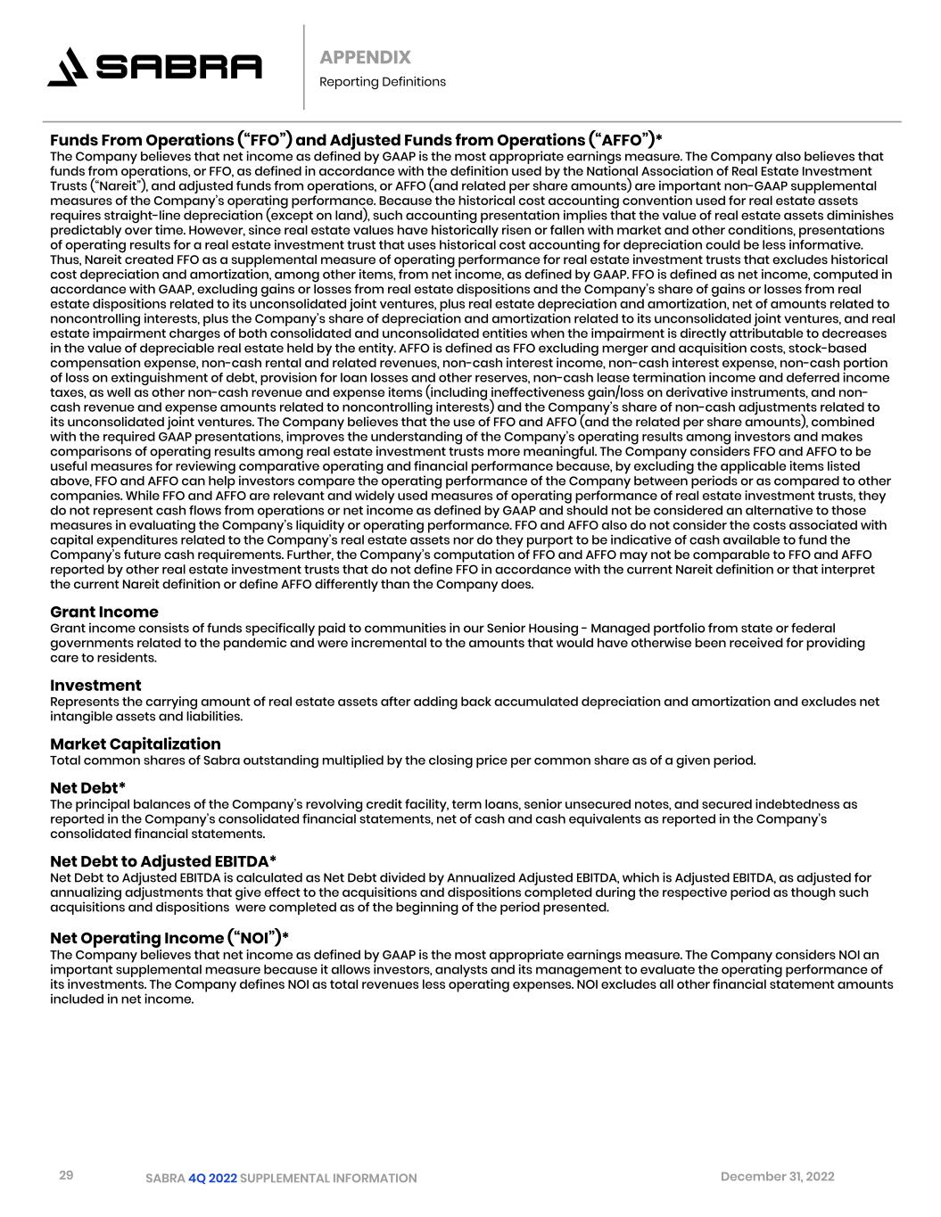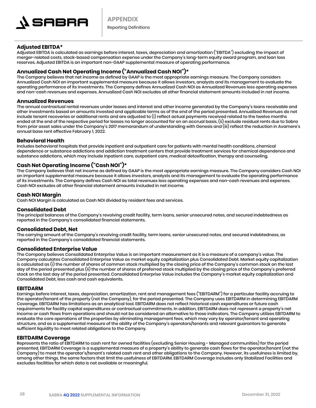 28 SABRA 4Q 2022 SUPPLEMENTAL INFORMATION December 31, 2022 APPENDIX Reporting Definitions Adjusted EBITDA* Adjusted EBITDA is calculated as earnings before interest, taxes, depreciation and amortization (“EBITDA”) excluding the impact of merger-related costs, stock-based compensation expense under the Company's long-term equity award program, and loan loss reserves. Adjusted EBITDA is an important non-GAAP supplemental measure of operating performance. Annualized Cash Net Operating Income (“Annualized Cash NOI”)* The Company believes that net income as defined by GAAP is the most appropriate earnings measure. The Company considers Annualized Cash NOI an important supplemental measure because it allows investors, analysts and its management to evaluate the operating performance of its investments. The Company defines Annualized Cash NOI as Annualized Revenues less operating expenses and non-cash revenues and expenses. Annualized Cash NOI excludes all other financial statement amounts included in net income. Annualized Revenues  The annual contractual rental revenues under leases and interest and other income generated by the Company’s loans receivable and other investments based on amounts invested and applicable terms as of the end of the period presented. Annualized Revenues do not include tenant recoveries or additional rents and are adjusted to (i) reflect actual payments received related to the twelve months ended at the end of the respective period for leases no longer accounted for on an accrual basis, (ii) exclude residual rents due to Sabra from prior asset sales under the Company’s 2017 memorandum of understanding with Genesis and (iii) reflect the reduction in Avamere’s annual base rent effective February 1, 2022. Behavioral Health Includes behavioral hospitals that provide inpatient and outpatient care for patients with mental health conditions, chemical dependence or substance addictions and addiction treatment centers that provide treatment services for chemical dependence and substance addictions, which may include inpatient care, outpatient care, medical detoxification, therapy and counseling. Cash Net Operating Income (“Cash NOI”)*    The Company believes that net income as defined by GAAP is the most appropriate earnings measure. The Company considers Cash NOI an important supplemental measure because it allows investors, analysts and its management to evaluate the operating performance of its investments. The Company defines Cash NOI as total revenues less operating expenses and non-cash revenues and expenses. Cash NOI excludes all other financial statement amounts included in net income. Cash NOI Margin Cash NOI Margin is calculated as Cash NOI divided by resident fees and services. Consolidated Debt  The principal balances of the Company’s revolving credit facility, term loans, senior unsecured notes, and secured indebtedness as reported in the Company’s consolidated financial statements. Consolidated Debt, Net The carrying amount of the Company’s revolving credit facility, term loans, senior unsecured notes, and secured indebtedness, as reported in the Company’s consolidated financial statements. Consolidated Enterprise Value The Company believes Consolidated Enterprise Value is an important measurement as it is a measure of a company’s value. The Company calculates Consolidated Enterprise Value as market equity capitalization plus Consolidated Debt. Market equity capitalization is calculated as (i) the number of shares of common stock multiplied by the closing price of the Company’s common stock on the last day of the period presented plus (ii) the number of shares of preferred stock multiplied by the closing price of the Company’s preferred stock on the last day of the period presented. Consolidated Enterprise Value includes the Company’s market equity capitalization and Consolidated Debt, less cash and cash equivalents. EBITDARM  Earnings before interest, taxes, depreciation, amortization, rent and management fees (“EBITDARM”) for a particular facility accruing to the operator/tenant of the property (not the Company), for the period presented. The Company uses EBITDARM in determining EBITDARM Coverage. EBITDARM has limitations as an analytical tool. EBITDARM does not reflect historical cash expenditures or future cash requirements for facility capital expenditures or contractual commitments. In addition, EBITDARM does not represent a property’s net income or cash flows from operations and should not be considered an alternative to those indicators. The Company utilizes EBITDARM to evaluate the core operations of the properties by eliminating management fees, which may vary by operator/tenant and operating structure, and as a supplemental measure of the ability of the Company’s operators/tenants and relevant guarantors to generate sufficient liquidity to meet related obligations to the Company. EBITDARM Coverage  Represents the ratio of EBITDARM to cash rent for owned facilities (excluding Senior Housing - Managed communities) for the period presented. EBITDARM Coverage is a supplemental measure of a property’s ability to generate cash flows for the operator/tenant (not the Company) to meet the operator’s/tenant’s related cash rent and other obligations to the Company. However, its usefulness is limited by, among other things, the same factors that limit the usefulness of EBITDARM. EBITDARM Coverage includes only Stabilized Facilities and excludes facilities for which data is not available or meaningful.