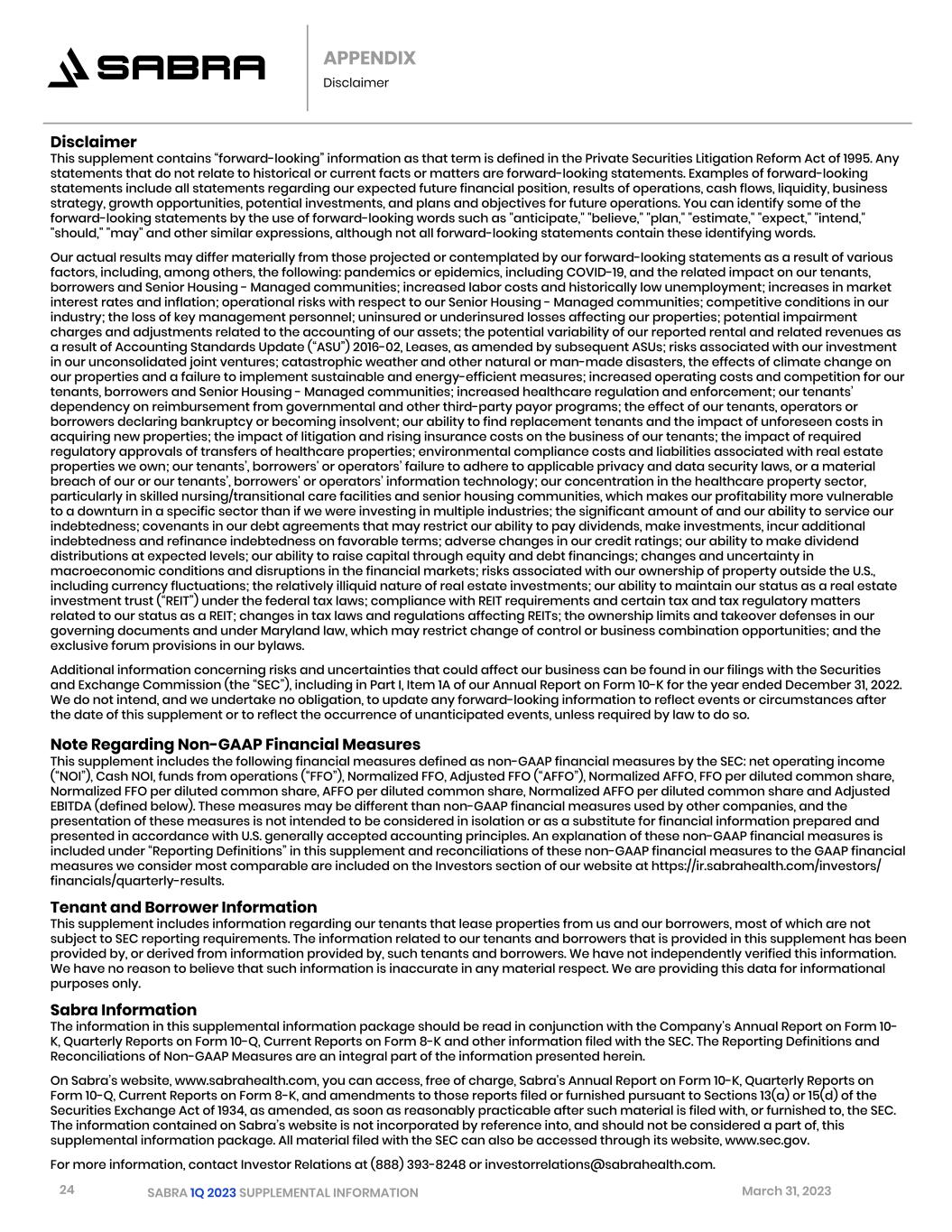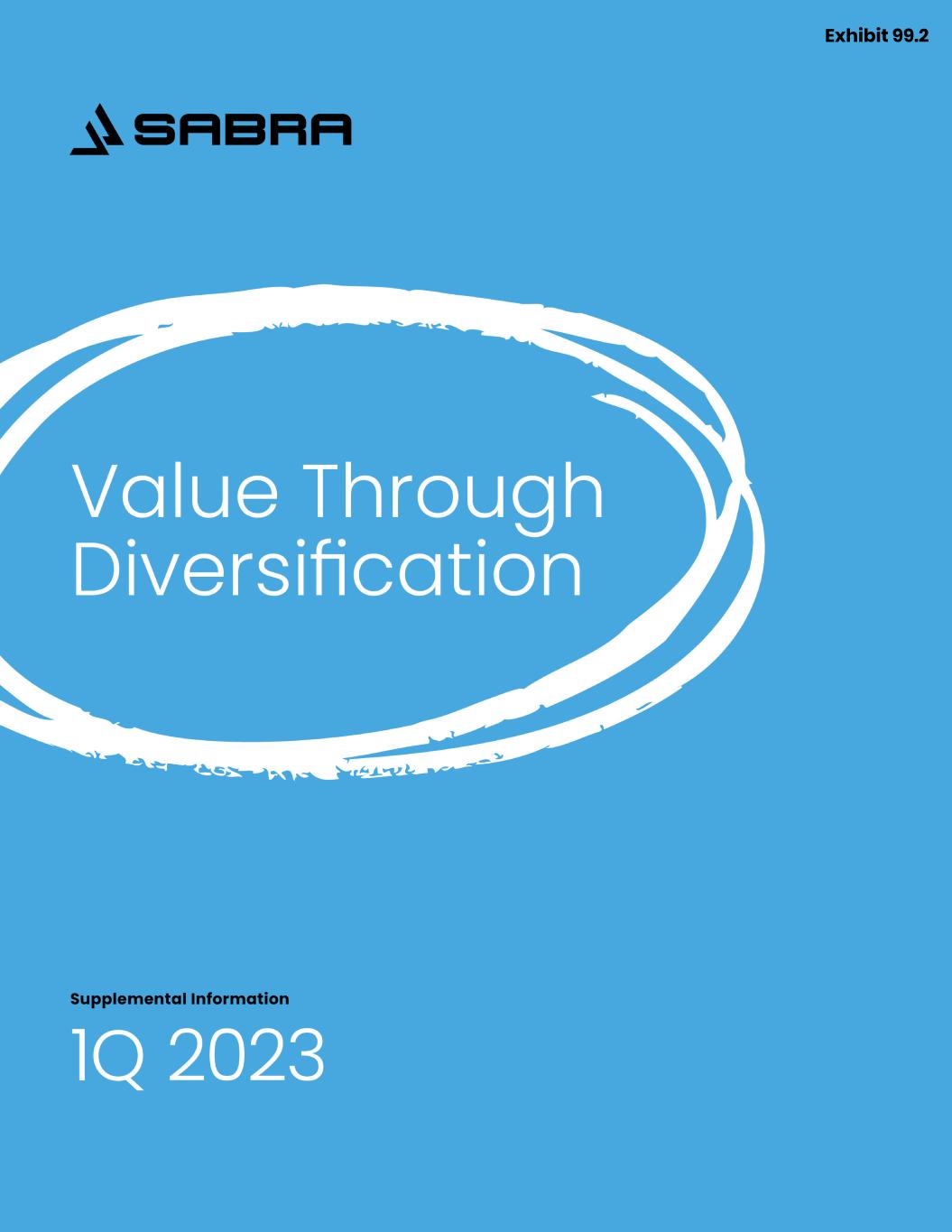 24 SABRA 1Q 2023 SUPPLEMENTAL INFORMATION March 31, 2023 APPENDIX Disclaimer Disclaimer This supplement contains “forward-looking” information as that term is defined in the Private Securities Litigation Reform Act of 1995. Any statements that do not relate to historical or current facts or matters are forward-looking statements. Examples of forward-looking statements include all statements regarding our expected future financial position, results of operations, cash flows, liquidity, business strategy, growth opportunities, potential investments, and plans and objectives for future operations. You can identify some of the forward-looking statements by the use of forward-looking words such as "anticipate," "believe," "plan," "estimate," "expect," "intend," "should," "may" and other similar expressions, although not all forward-looking statements contain these identifying words. Our actual results may differ materially from those projected or contemplated by our forward-looking statements as a result of various factors, including, among others, the following: pandemics or epidemics, including COVID-19, and the related impact on our tenants, borrowers and Senior Housing - Managed communities; increased labor costs and historically low unemployment; increases in market interest rates and inflation; operational risks with respect to our Senior Housing - Managed communities; competitive conditions in our industry; the loss of key management personnel; uninsured or underinsured losses affecting our properties; potential impairment charges and adjustments related to the accounting of our assets; the potential variability of our reported rental and related revenues as a result of Accounting Standards Update (“ASU”) 2016-02, Leases, as amended by subsequent ASUs; risks associated with our investment in our unconsolidated joint ventures; catastrophic weather and other natural or man-made disasters, the effects of climate change on our properties and a failure to implement sustainable and energy-efficient measures; increased operating costs and competition for our tenants, borrowers and Senior Housing - Managed communities; increased healthcare regulation and enforcement; our tenants’ dependency on reimbursement from governmental and other third-party payor programs; the effect of our tenants, operators or borrowers declaring bankruptcy or becoming insolvent; our ability to find replacement tenants and the impact of unforeseen costs in acquiring new properties; the impact of litigation and rising insurance costs on the business of our tenants; the impact of required regulatory approvals of transfers of healthcare properties; environmental compliance costs and liabilities associated with real estate properties we own; our tenants’, borrowers' or operators’ failure to adhere to applicable privacy and data security laws, or a material breach of our or our tenants’, borrowers' or operators’ information technology; our concentration in the healthcare property sector, particularly in skilled nursing/transitional care facilities and senior housing communities, which makes our profitability more vulnerable to a downturn in a specific sector than if we were investing in multiple industries; the significant amount of and our ability to service our indebtedness; covenants in our debt agreements that may restrict our ability to pay dividends, make investments, incur additional indebtedness and refinance indebtedness on favorable terms; adverse changes in our credit ratings; our ability to make dividend distributions at expected levels; our ability to raise capital through equity and debt financings; changes and uncertainty in macroeconomic conditions and disruptions in the financial markets; risks associated with our ownership of property outside the U.S., including currency fluctuations; the relatively illiquid nature of real estate investments; our ability to maintain our status as a real estate investment trust (“REIT”) under the federal tax laws; compliance with REIT requirements and certain tax and tax regulatory matters related to our status as a REIT; changes in tax laws and regulations affecting REITs; the ownership limits and takeover defenses in our governing documents and under Maryland law, which may restrict change of control or business combination opportunities; and the exclusive forum provisions in our bylaws. Additional information concerning risks and uncertainties that could affect our business can be found in our filings with the Securities and Exchange Commission (the “SEC”), including in Part I, Item 1A of our Annual Report on Form 10-K for the year ended December 31, 2022. We do not intend, and we undertake no obligation, to update any forward-looking information to reflect events or circumstances after the date of this supplement or to reflect the occurrence of unanticipated events, unless required by law to do so. Note Regarding Non-GAAP Financial Measures This supplement includes the following financial measures defined as non-GAAP financial measures by the SEC: net operating income (“NOI”), Cash NOI, funds from operations (“FFO”), Normalized FFO, Adjusted FFO (“AFFO”), Normalized AFFO, FFO per diluted common share, Normalized FFO per diluted common share, AFFO per diluted common share, Normalized AFFO per diluted common share and Adjusted EBITDA (defined below). These measures may be different than non-GAAP financial measures used by other companies, and the presentation of these measures is not intended to be considered in isolation or as a substitute for financial information prepared and presented in accordance with U.S. generally accepted accounting principles. An explanation of these non-GAAP financial measures is included under “Reporting Definitions” in this supplement and reconciliations of these non-GAAP financial measures to the GAAP financial measures we consider most comparable are included on the Investors section of our website 