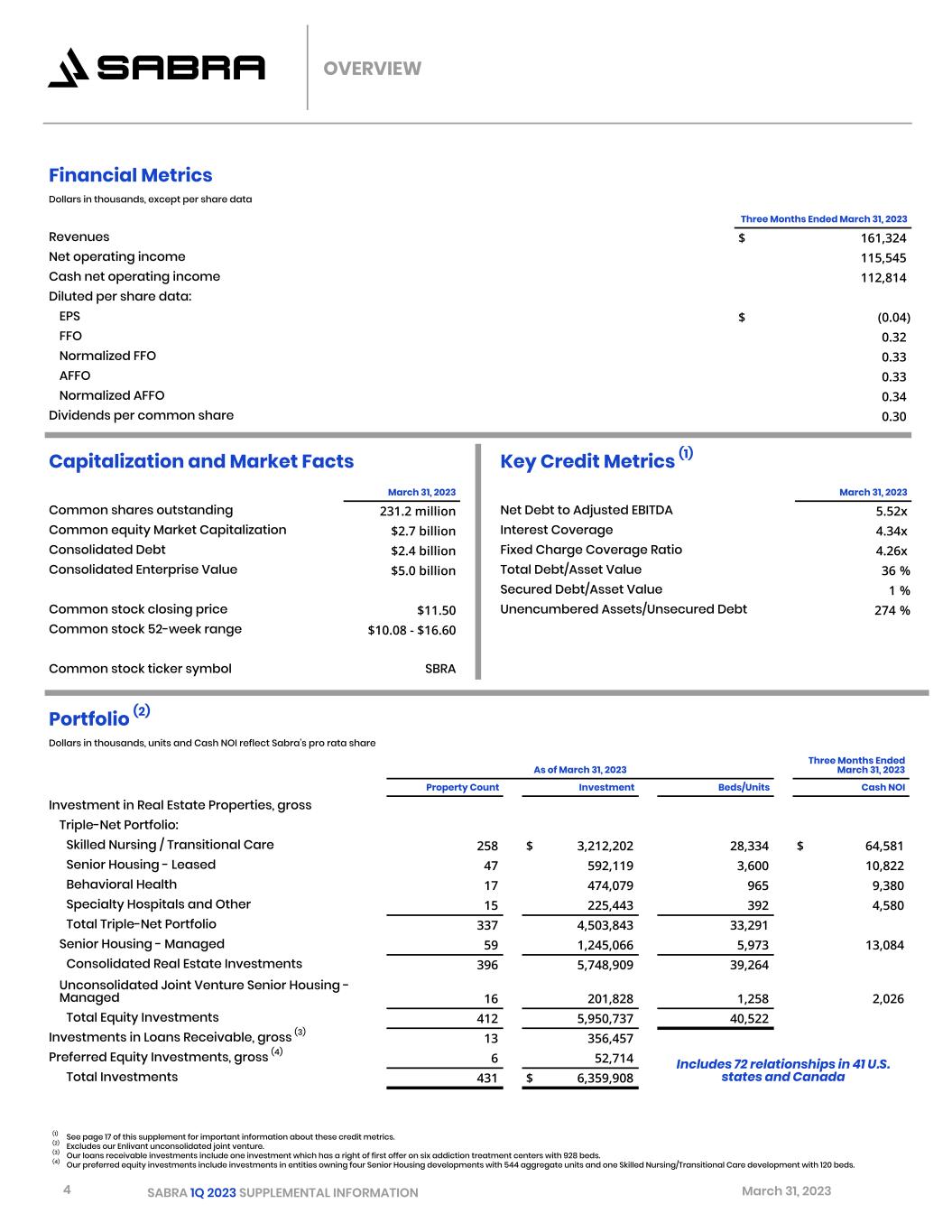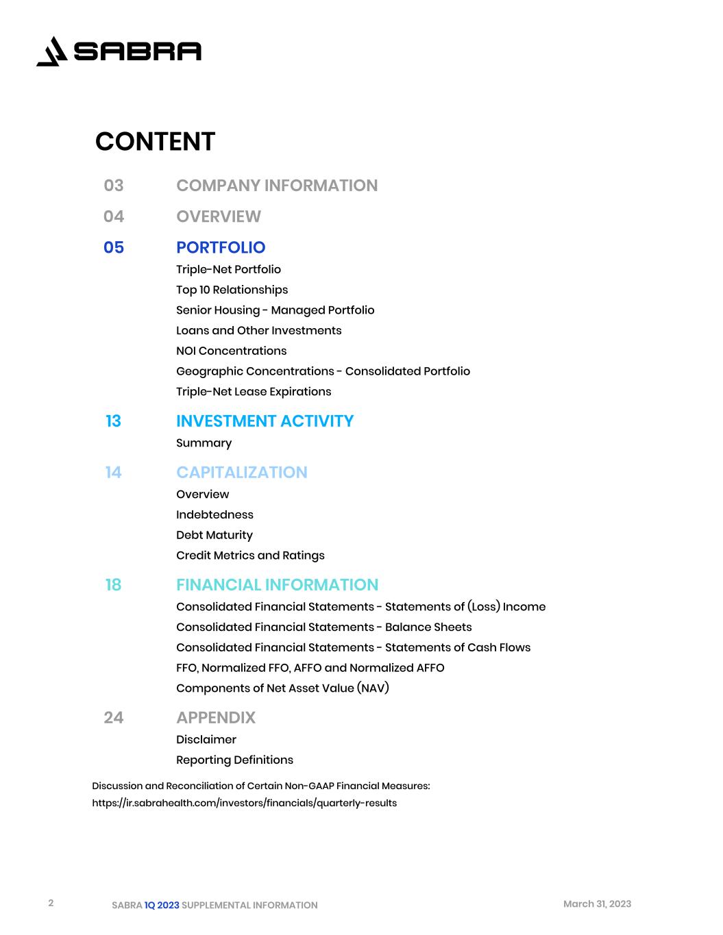 2 SABRA 1Q 2023 SUPPLEMENTAL INFORMATION March 31, 2023 03 COMPANY INFORMATION 04 OVERVIEW 05 PORTFOLIO Triple-Net Portfolio Top 10 Relationships Senior Housing - Managed Portfolio Loans and Other Investments NOI Concentrations Geographic Concentrations - Consolidated Portfolio Triple-Net Lease Expirations 13 INVESTMENT ACTIVITY Summary 14 CAPITALIZATION Overview Indebtedness Debt Maturity Credit Metrics and Ratings 18 FINANCIAL INFORMATION Consolidated Financial Statements - Statements of (Loss) Income Consolidated Financial Statements - Balance Sheets Consolidated Financial Statements - Statements of Cash Flows FFO, Normalized FFO, AFFO and Normalized AFFO Components of Net Asset Value (NAV) 24 APPENDIX Disclaimer Reporting Definitions Discussion and Reconciliation of Certain Non-GAAP Financial Measures: CONTENT https://ir.sabrahealth.com/investors/financials/quarterly-results