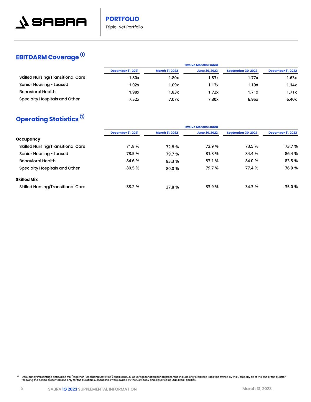 4 SABRA 1Q 2023 SUPPLEMENTAL INFORMATION March 31, 2023 Financial Metrics Dollars in thousands, except per share data Three Months Ended March 31, 2023 Revenues $ 161,324 Net operating income 115,545 Cash net operating income 112,814 Diluted per share data: EPS $ (0.04) FFO 0.32 Normalized FFO 0.33 AFFO 0.33 Normalized AFFO 0.34 Dividends per common share 0.30 Capitalization and Market Facts Key Credit Metrics (1) March 31, 2023 March 31, 2023 Common shares outstanding 231.2 million Net Debt to Adjusted EBITDA 5.52x Common equity Market Capitalization $2.7 billion Interest Coverage 4.34x Consolidated Debt $2.4 billion Fixed Charge Coverage Ratio 4.26x Consolidated Enterprise Value $5.0 billion Total Debt/Asset Value 36 % Secured Debt/Asset Value 1 % Common stock closing price $11.50 Unencumbered Assets/Unsecured Debt 274 % Common stock 52-week range $10.08 - $16.60 Common stock ticker symbol SBRA Portfolio (2) Dollars in thousands, units and Cash NOI reflect Sabra's pro rata share Three Months Ended March 31, 2023As of March 31, 2023 Property Count Investment Beds/Units Cash NOI Investment in Real Estate Properties, gross Triple-Net Portfolio: Skilled Nursing / Transitional Care 258 $ 3,212,202 28,334 $ 64,581 Senior Housing - Leased 47 592,119 3,600 10,822 Behavioral Health 17 474,079 965 9,380 Specialty Hospitals and Other 15 225,443 392 4,580 Total Triple-Net Portfolio 337 4,503,843 33,291 Senior Housing - Managed 59 1,245,066 5,973 13,084 Consolidated Real Estate Investments 396 5,748,909 39,264 Unconsolidated Joint Venture Senior Housing - Managed 16 201,828 1,258 2,026 Total Equity Investments 412 5,950,737 40,522 Investments in Loans Receivable, gross (3) 13 356,457 Preferred Equity Investments, gross (4) 6 52,714 Includes 72 relationships in 41 U.S. states and CanadaTotal Investments 431 $ 6,359,908 (1) See page 17 of this supplement for important information about these credit metrics. (2) Excludes our Enlivant unconsolidated joint venture. (3) Our loans receivable investments include one investment which has a right of first offer on six addiction treatment centers with 928 beds. (4) Our preferred equity investments include investments in entities owning four Senior Housing developments with 544 aggregate units and one Skilled Nursing/Transitional Care development with 120 beds. OVERVIEW