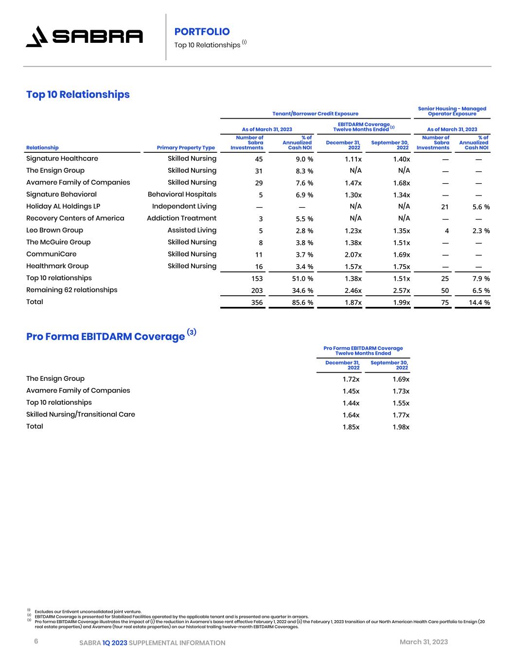 5 SABRA 1Q 2023 SUPPLEMENTAL INFORMATION March 31, 2023 Operating Statistics (1) Twelve Months Ended December 31, 2021 March 31, 2022 June 30, 2022 September 30, 2022 December 31, 2022 Occupancy Skilled Nursing/Transitional Care 71.8 % 72.8 % 72.9 % 73.5 % 73.7 % Senior Housing - Leased 78.5 % 79.7 % 81.8 % 84.4 % 86.4 % Behavioral Health 84.6 % 83.3 % 83.1 % 84.0 % 83.5 % Specialty Hospitals and Other 80.5 % 80.0 % 79.7 % 77.4 % 76.9 % Skilled Mix Skilled Nursing/Transitional Care 38.2 % 37.8 % 33.9 % 34.3 % 35.0 % PORTFOLIO Triple-Net Portfolio (1) Occupancy Percentage and Skilled Mix (together, “Operating Statistics”) and EBITDARM Coverage for each period presented include only Stabilized Facilities owned by the Company as of the end of the quarter following the period presented and only for the duration such facilities were owned by the Company and classified as Stabilized Facilities. EBITDARM Coverage (1) Twelve Months Ended December 31, 2021 March 31, 2022 June 30, 2022 September 30, 2022 December 31, 2022 Skilled Nursing/Transitional Care 1.80x 1.80x 1.83x 1.77x 1.63x Senior Housing - Leased 1.02x 1.09x 1.13x 1.19x 1.14x Behavioral Health 1.98x 1.83x 1.72x 1.71x 1.71x Specialty Hospitals and Other 7.52x 7.07x 7.30x 6.95x 6.40x