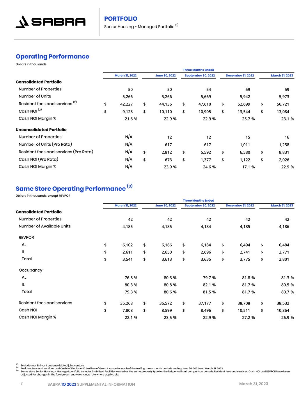 6 SABRA 1Q 2023 SUPPLEMENTAL INFORMATION March 31, 2023 PORTFOLIO Top 10 Relationships (1) Top 10 Relationships Tenant/Borrower Credit Exposure Senior Housing - Managed Operator Exposure As of March 31, 2023 EBITDARM Coverage Twelve Months Ended (2) As of March 31, 2023 Relationship Primary Property Type Number of Sabra Investments % of Annualized Cash NOI December 31, 2022 September 30, 2022 Number of Sabra Investments % of Annualized Cash NOI Signature Healthcare Skilled Nursing 45 9.0 % 1.11x 1.40x — — The Ensign Group Skilled Nursing 31 8.3 % N/A N/A — — Avamere Family of Companies Skilled Nursing 29 7.6 % 1.47x 1.68x — — Signature Behavioral Behavioral Hospitals 5 6.9 % 1.30x 1.34x — — Holiday AL Holdings LP Independent Living — — N/A N/A 21 5.6 % Recovery Centers of America Addiction Treatment 3 5.5 % N/A N/A — — Leo Brown Group Assisted Living 5 2.8 % 1.23x 1.35x 4 2.3 % The McGuire Group Skilled Nursing 8 3.8 % 1.38x 1.51x — — CommuniCare Skilled Nursing 11 3.7 % 2.07x 1.69x — — Healthmark Group Skilled Nursing 16 3.4 % 1.57x 1.75x — — Top 10 relationships 153 51.0 % 1.38x 1.51x 25 7.9 % Remaining 62 relationships 203 34.6 % 2.46x 2.57x 50 6.5 % Total 356 85.6 % 1.87x 1.99x 75 14.4 % (1) Excludes our Enlivant unconsolidated joint venture. (2) EBITDARM Coverage is presented for Stabilized Facilities operated by the applicable tenant and is presented one quarter in arrears. (3) Pro forma EBITDARM Coverage illustrates the impact of (i) the reduction in Avamere's base rent effective February 1, 2022 and (ii) the February 1, 2023 transition of our North American Health Care portfolio to Ensign (20 real estate properties) and Avamere (four real estate properties) on our historical trailing twelve-month EBITDARM Coverages. Pro Forma EBITDARM Coverage (3) Pro Forma EBITDARM Coverage Twelve Months Ended December 31, 2022 September 30, 2022 The Ensign Group 1.72x 1.69x Avamere Family of Companies 1.45x 1.73x Top 10 relationships 1.44x 1.55x Skilled Nursing/Transitional Care 1.64x 1.77x Total 1.85x 1.98x