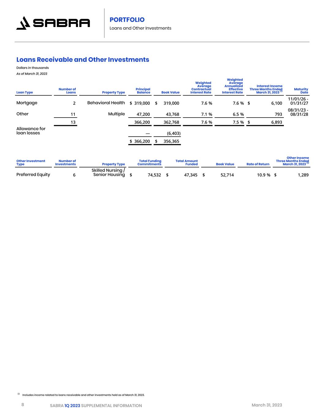 8 SABRA 1Q 2023 SUPPLEMENTAL INFORMATION March 31, 2023 PORTFOLIO Loans and Other Investments Loans Receivable and Other Investments Dollars in thousands As of March 31, 2023 Loan Type Number of Loans Property Type Principal Balance Book Value Weighted Average Contractual Interest Rate Weighted Average Annualized Effective Interest Rate Interest Income Three Months Ended March 31, 2023 (1) Maturity Date Mortgage 2 Behavioral Health $ 319,000 $ 319,000 7.6 % 7.6 % $ 6,100 11/01/26 - 01/31/27 Other 11 Multiple 47,200 43,768 7.1 % 6.5 % 793 08/31/23 - 08/31/28 13 366,200 362,768 7.6 % 7.5 % $ 6,893 Allowance for loan losses — (6,403) $ 366,200 $ 356,365 Other Investment Type Number of Investments Property Type Total Funding Commitments Total Amount Funded Book Value Rate of Return Other Income Three Months Ended March 31, 2023 (1) Preferred Equity 6 Skilled Nursing / Senior Housing $ 74,532 $ 47,345 $ 52,714 10.9 % $ 1,289 (1) Includes income related to loans receivable and other investments held as of March 31, 2023.