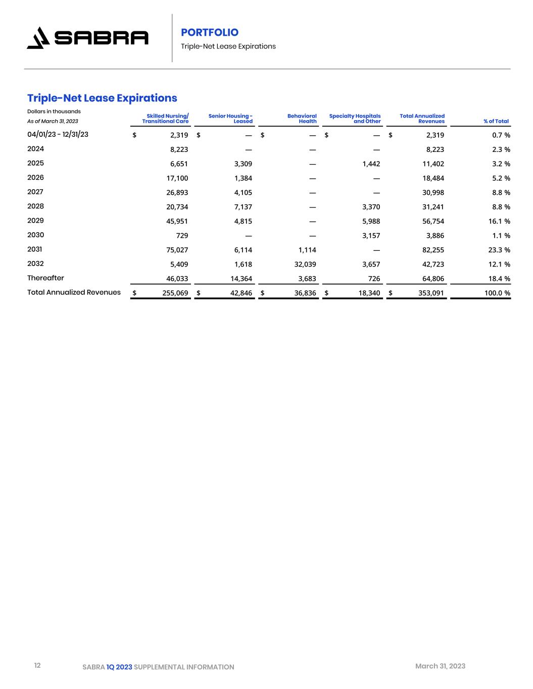 12 SABRA 1Q 2023 SUPPLEMENTAL INFORMATION March 31, 2023 PORTFOLIO Triple-Net Lease Expirations Triple-Net Lease Expirations Dollars in thousands Skilled Nursing/ Transitional Care Senior Housing - Leased Behavioral Health Specialty Hospitals and Other Total Annualized RevenuesAs of March 31, 2023   % of Total 04/01/23 - 12/31/23 $ 2,319 $ — $ — $ — $ 2,319 0.7 % 2024 8,223 — — — 8,223 2.3 % 2025 6,651 3,309 — 1,442 11,402 3.2 % 2026 17,100 1,384 — — 18,484 5.2 % 2027 26,893 4,105 — — 30,998 8.8 % 2028 20,734 7,137 — 3,370 31,241 8.8 % 2029 45,951 4,815 — 5,988 56,754 16.1 % 2030 729 — — 3,157 3,886 1.1 % 2031 75,027 6,114 1,114 — 82,255 23.3 % 2032 5,409 1,618 32,039 3,657 42,723 12.1 % Thereafter 46,033 14,364 3,683 726 64,806 18.4 % Total Annualized Revenues $ 255,069 $ 42,846 $ 36,836 $ 18,340 $ 353,091 100.0 %