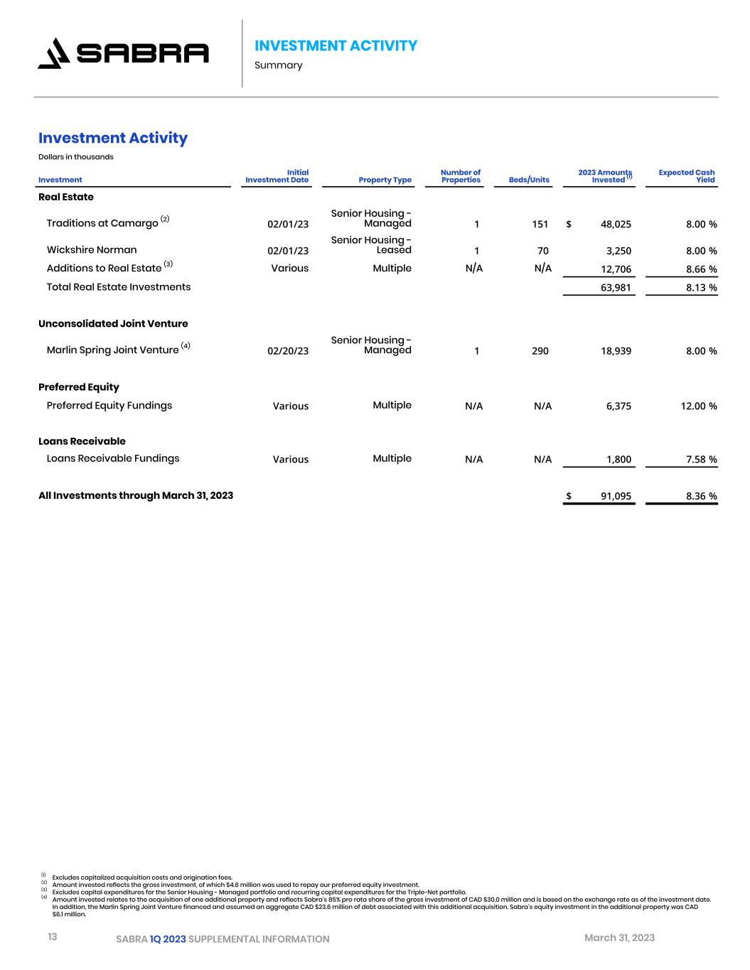 13 SABRA 1Q 2023 SUPPLEMENTAL INFORMATION March 31, 2023 INVESTMENT ACTIVITY Summary Investment Activity Dollars in thousands Investment Initial Investment Date Property Type Number of Properties Beds/Units 2023 Amounts Invested (1) Expected Cash Yield Real Estate Traditions at Camargo (2) 02/01/23 Senior Housing - Managed 1 151 $ 48,025 8.00 % Wickshire Norman 02/01/23 Senior Housing - Leased 1 70 3,250 8.00 % Additions to Real Estate (3) Various Multiple N/A N/A 12,706 8.66 % Total Real Estate Investments 63,981 8.13 % Unconsolidated Joint Venture Marlin Spring Joint Venture (4) 02/20/23 Senior Housing - Managed 1 290 18,939 8.00 % Preferred Equity Preferred Equity Fundings Various Multiple N/A N/A 6,375 12.00 % Loans Receivable Loans Receivable Fundings Various Multiple N/A N/A 1,800 7.58 % All Investments through March 31, 2023 $ 91,095 8.36 % (1) Excludes capitalized acquisition costs and origination fees. (2) Amount invested reflects the gross investment, of which $4.6 million was used to repay our preferred equity investment. (3) Excludes capital expenditures for the Senior Housing - Managed portfolio and recurring capital expenditures for the Triple-Net portfolio. (4) Amount invested relates to the acquisition of one additional property and reflects Sabra's 85% pro rata share of the gross investment of CAD $30.0 million and is based on the exchange rate as of the investment date. In addition, the Marlin Spring Joint Venture financed and assumed an aggregate CAD $23.6 million of debt associated with this additional acquisition. Sabra's equity investment in the additional property was CAD $6.1 million.