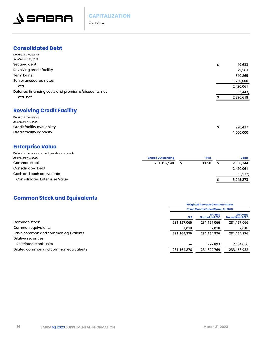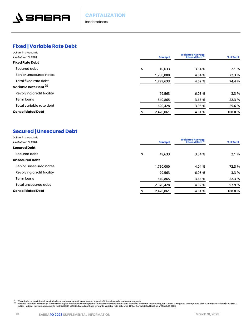 14 SABRA 1Q 2023 SUPPLEMENTAL INFORMATION March 31, 2023 CAPITALIZATION Overview Consolidated Debt Dollars in thousands As of March 31, 2023 Secured debt $ 49,633 Revolving credit facility 79,563 Term loans 540,865 Senior unsecured notes 1,750,000 Total 2,420,061 Deferred financing costs and premiums/discounts, net (23,443) Total, net $ 2,396,618 Revolving Credit Facility Dollars in thousands As of March 31, 2023 Credit facility availability $ 920,437 Credit facility capacity 1,000,000 Enterprise Value Dollars in thousands, except per share amounts As of March 31, 2023 Shares Outstanding   Price   Value Common stock 231,195,148 $ 11.50 $ 2,658,744 Consolidated Debt 2,420,061 Cash and cash equivalents (33,532) Consolidated Enterprise Value $ 5,045,273 Common Stock and Equivalents Weighted Average Common Shares Three Months Ended March 31, 2023 EPS FFO and Normalized FFO AFFO and Normalized AFFO Common stock 231,157,066 231,157,066 231,157,066 Common equivalents 7,810 7,810 7,810 Basic common and common equivalents 231,164,876 231,164,876 231,164,876 Dilutive securities: Restricted stock units — 727,893 2,004,056 Diluted common and common equivalents 231,164,876 231,892,769 233,168,932