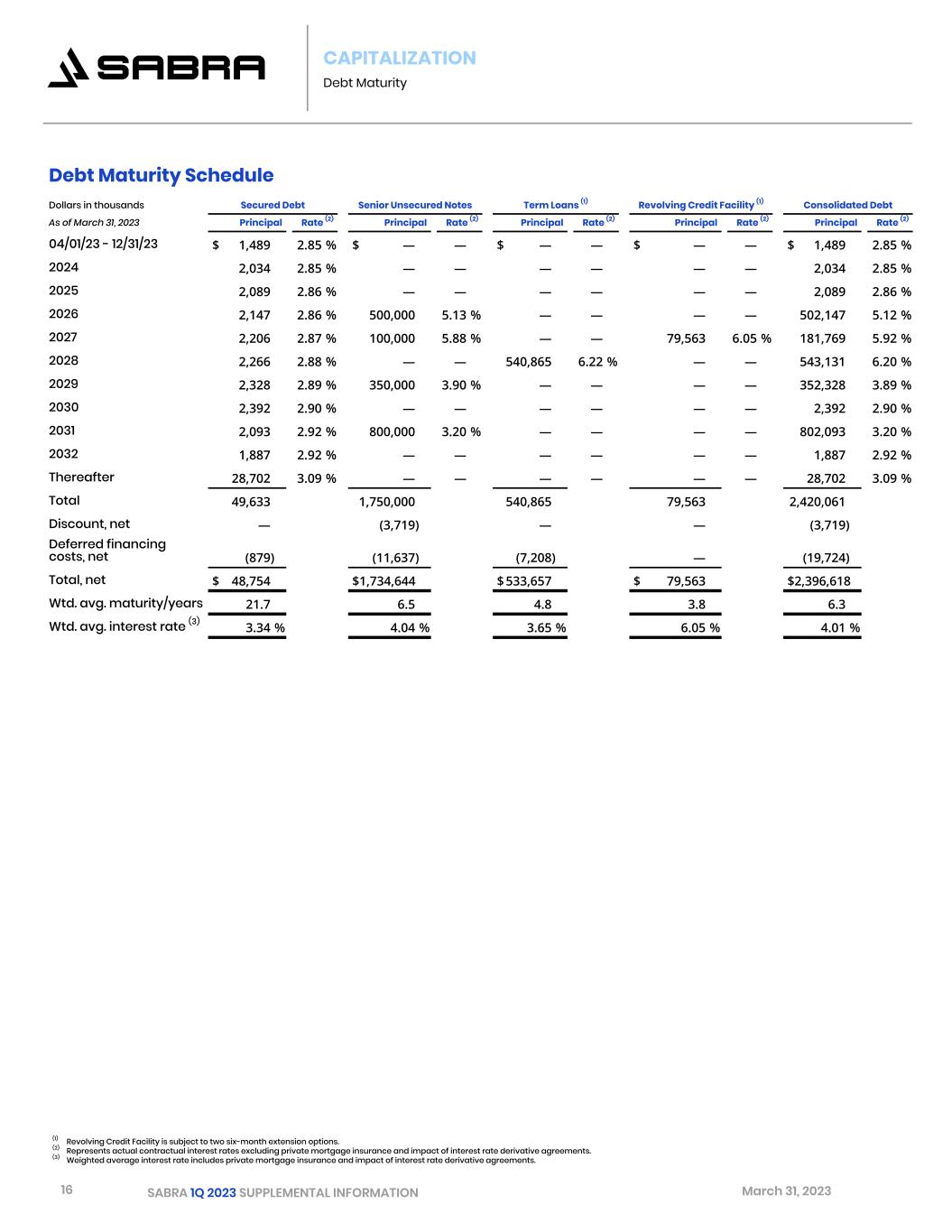 15 SABRA 1Q 2023 SUPPLEMENTAL INFORMATION March 31, 2023 CAPITALIZATION Indebtedness Fixed | Variable Rate Debt Dollars in thousands Weighted Average Interest Rate (1)As of March 31, 2023 Principal     % of Total Fixed Rate Debt   Secured debt $ 49,633     3.34 %   2.1 % Senior unsecured notes 1,750,000     4.04 %   72.3 % Total fixed rate debt 1,799,633     4.02 %   74.4 % Variable Rate Debt (2)   Revolving credit facility 79,563     6.05 %   3.3 % Term loans 540,865 3.65 % 22.3 % Total variable rate debt 620,428     3.96 %   25.6 % Consolidated Debt $ 2,420,061     4.01 %   100.0 % Secured | Unsecured Debt Dollars in thousands Weighted Average Interest Rate (1)As of March 31, 2023 Principal     % of Total Secured Debt   Secured debt $ 49,633     3.34 %   2.1 % Unsecured Debt Senior unsecured notes 1,750,000     4.04 %   72.3 % Revolving credit facility 79,563     6.05 %   3.3 % Term loans 540,865 3.65 % 22.3 % Total unsecured debt 2,370,428     4.02 %   97.9 % Consolidated Debt $ 2,420,061     4.01 %   100.0 % (1) Weighted average interest rate includes private mortgage insurance and impact of interest rate derivative agreements. (2) Variable rate debt includes $430.0 million subject to interest rate swaps and interest rate collars that fix and set a cap and floor, respectively, for SOFR at a weighted average rate of 1.51%, and $110.9 million (CAD $150.0 million) subject to swap agreements that fix CDOR at 1.63%. Excluding these amounts, variable rate debt was 3.3% of Consolidated Debt as of March 31, 2023.