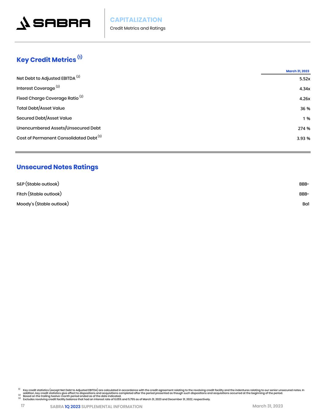 16 SABRA 1Q 2023 SUPPLEMENTAL INFORMATION March 31, 2023 CAPITALIZATION Debt Maturity Debt Maturity Schedule Dollars in thousands Secured Debt Senior Unsecured Notes   Term Loans (1)     Revolving Credit Facility (1) Consolidated Debt As of March 31, 2023 Principal Rate (2) Principal Rate (2)   Principal Rate (2)     Principal Rate (2) Principal Rate (2) 04/01/23 - 12/31/23 $ 1,489   2.85 %   $ —   —     $ —   —     $ — — $ 1,489   2.85 % 2024 2,034   2.85 %   —   —     —   —     — — 2,034   2.85 % 2025 2,089   2.86 %   —   —     —   —     — — 2,089   2.86 % 2026 2,147   2.86 %   500,000   5.13 % —   —     — — 502,147   5.12 % 2027 2,206   2.87 %   100,000   5.88 % —   —     79,563 6.05 % 181,769   5.92 % 2028 2,266   2.88 %   —   —     540,865   6.22 %     — — 543,131   6.20 % 2029 2,328   2.89 %   350,000 3.90 % —   —     — — 352,328   3.89 % 2030 2,392   2.90 %   —   —     —   —     — — 2,392   2.90 % 2031 2,093   2.92 %   800,000   3.20 %     —   —     — — 802,093   3.20 % 2032 1,887   2.92 % — — — — — — 1,887 2.92 % Thereafter 28,702   3.09 %   —   —     —   —     — — 28,702   3.09 % Total 49,633   1,750,000 540,865     79,563 2,420,061 Discount, net — (3,719) — — (3,719) Deferred financing costs, net (879) (11,637) (7,208) — (19,724) Total, net $ 48,754 $ 1,734,644 $ 533,657     $ 79,563 $ 2,396,618 Wtd. avg. maturity/years 21.7   6.5 4.8     3.8 6.3 Wtd. avg. interest rate (3) 3.34 %   4.04 % 3.65 %     6.05 % 4.01 % (1) Revolving Credit Facility is subject to two six-month extension options. (2) Represents actual contractual interest rates excluding private mortgage insurance and impact of interest rate derivative agreements. (3) Weighted average interest rate includes private mortgage insurance and impact of interest rate derivative agreements.