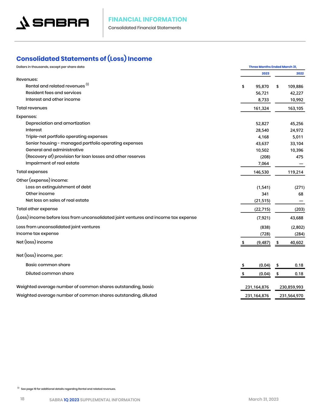 18 SABRA 1Q 2023 SUPPLEMENTAL INFORMATION March 31, 2023 FINANCIAL INFORMATION Consolidated Financial Statements Consolidated Statements of (Loss) Income Dollars in thousands, except per share data Three Months Ended March 31,   2023 2022 Revenues: Rental and related revenues (1) $ 95,870 $ 109,886 Resident fees and services 56,721 42,227 Interest and other income 8,733 10,992     Total revenues 161,324 163,105     Expenses: Depreciation and amortization 52,827 45,256 Interest 28,540 24,972 Triple-net portfolio operating expenses 4,168 5,011 Senior housing - managed portfolio operating expenses 43,637 33,104 General and administrative 10,502 10,396 (Recovery of) provision for loan losses and other reserves (208) 475 Impairment of real estate 7,064 —     Total expenses 146,530 119,214     Other (expense) income: Loss on extinguishment of debt (1,541) (271) Other income 341 68 Net loss on sales of real estate (21,515) — Total other expense (22,715) (203) (Loss) income before loss from unconsolidated joint ventures and income tax expense (7,921) 43,688 Loss from unconsolidated joint ventures (838) (2,802) Income tax expense (728) (284) Net (loss) income $ (9,487) $ 40,602     Net (loss) income, per: Basic common share $ (0.04) $ 0.18     Diluted common share $ (0.04) $ 0.18     Weighted average number of common shares outstanding, basic 231,164,876 230,859,993   Weighted average number of common shares outstanding, diluted 231,164,876 231,564,970 (1) See page 19 for additional details regarding Rental and related revenues.