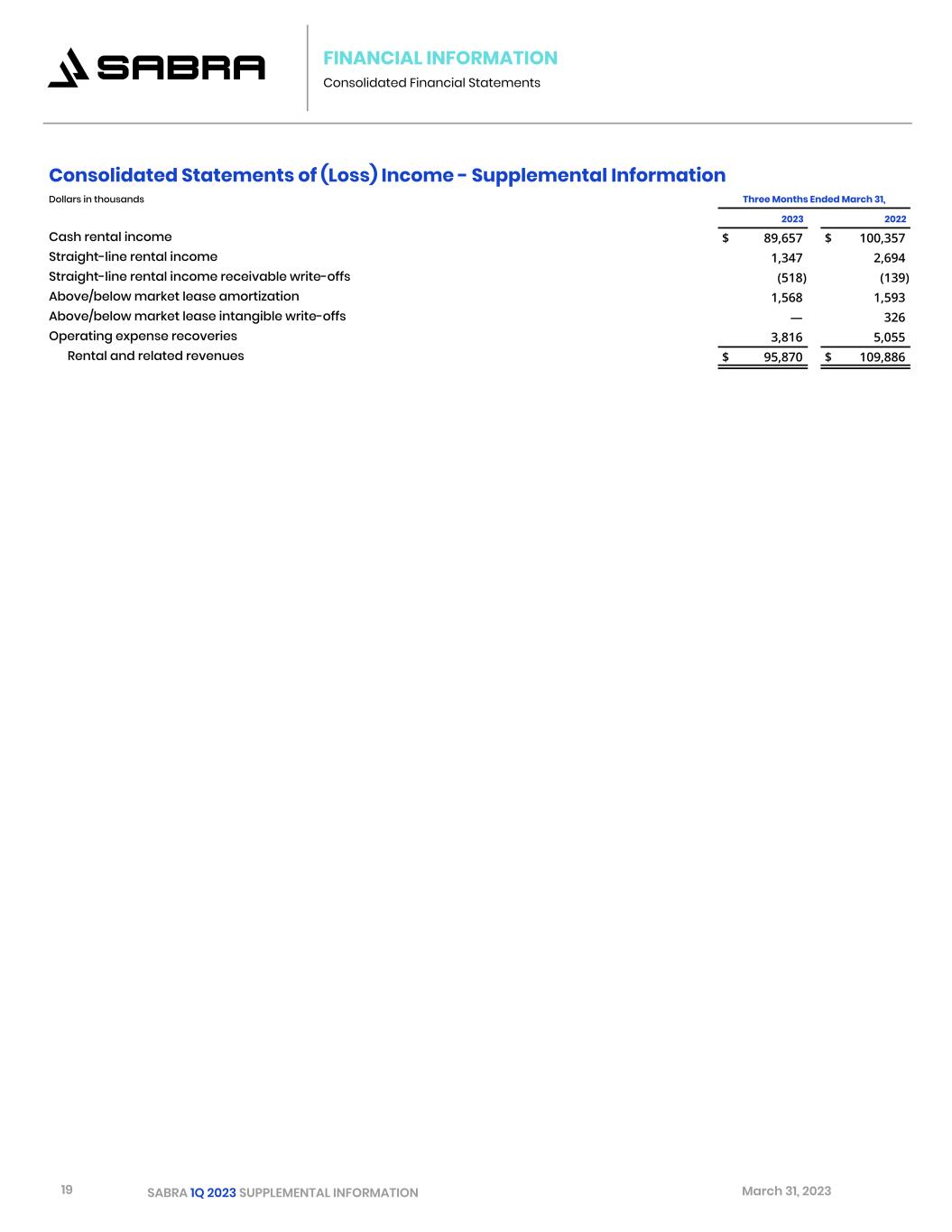 19 SABRA 1Q 2023 SUPPLEMENTAL INFORMATION March 31, 2023 FINANCIAL INFORMATION Consolidated Financial Statements Consolidated Statements of (Loss) Income - Supplemental Information Dollars in thousands Three Months Ended March 31,   2023 2022 Cash rental income $ 89,657 $ 100,357 Straight-line rental income 1,347 2,694 Straight-line rental income receivable write-offs (518) (139) Above/below market lease amortization 1,568 1,593 Above/below market lease intangible write-offs — 326 Operating expense recoveries 3,816 5,055 Rental and related revenues $ 95,870 $ 109,886