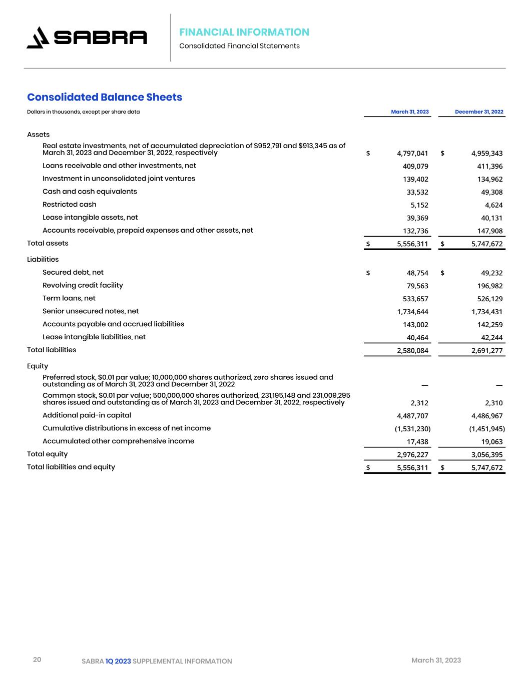 20 SABRA 1Q 2023 SUPPLEMENTAL INFORMATION March 31, 2023 FINANCIAL INFORMATION Consolidated Financial Statements Consolidated Balance Sheets Dollars in thousands, except per share data March 31, 2023 December 31, 2022   (unaudited)   Assets Real estate investments, net of accumulated depreciation of $952,791 and $913,345 as of March 31, 2023 and December 31, 2022, respectively $ 4,797,041 $ 4,959,343 Loans receivable and other investments, net 409,079 411,396 Investment in unconsolidated joint ventures 139,402 134,962 Cash and cash equivalents 33,532 49,308 Restricted cash 5,152 4,624 Lease intangible assets, net 39,369 40,131 Accounts receivable, prepaid expenses and other assets, net 132,736 147,908 Total assets $ 5,556,311 $ 5,747,672 Liabilities Secured debt, net $ 48,754 $ 49,232 Revolving credit facility 79,563 196,982 Term loans, net 533,657 526,129 Senior unsecured notes, net 1,734,644 1,734,431 Accounts payable and accrued liabilities 143,002 142,259 Lease intangible liabilities, net 40,464 42,244 Total liabilities 2,580,084 2,691,277 Equity Preferred stock, $0.01 par value; 10,000,000 shares authorized, zero shares issued and outstanding as of March 31, 2023 and December 31, 2022 — — Common stock, $0.01 par value; 500,000,000 shares authorized, 231,195,148 and 231,009,295 shares issued and outstanding as of March 31, 2023 and December 31, 2022, respectively 2,312 2,310 Additional paid-in capital 4,487,707 4,486,967 Cumulative distributions in excess of net income (1,531,230) (1,451,945) Accumulated other comprehensive income 17,438 19,063 Total equity 2,976,227 3,056,395 Total liabilities and equity $ 5,556,311 $ 5,747,672