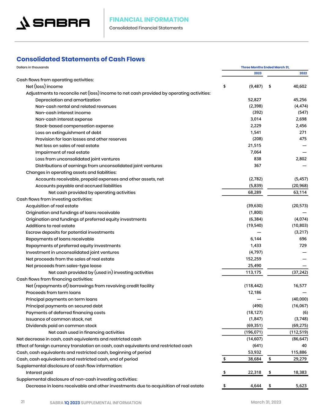 21 SABRA 1Q 2023 SUPPLEMENTAL INFORMATION March 31, 2023 FINANCIAL INFORMATION Consolidated Financial Statements Consolidated Statements of Cash Flows Dollars in thousands Three Months Ended March 31, 2023 2022 Cash flows from operating activities: Net (loss) income $ (9,487) $ 40,602 Adjustments to reconcile net (loss) income to net cash provided by operating activities: Depreciation and amortization 52,827 45,256 Non-cash rental and related revenues (2,398) (4,474) Non-cash interest income (392) (547) Non-cash interest expense 3,014 2,698 Stock-based compensation expense 2,229 2,456 Loss on extinguishment of debt 1,541 271 Provision for loan losses and other reserves (208) 475 Net loss on sales of real estate 21,515 — Impairment of real estate 7,064 — Loss from unconsolidated joint ventures 838 2,802 Distributions of earnings from unconsolidated joint ventures 367 — Changes in operating assets and liabilities: Accounts receivable, prepaid expenses and other assets, net (2,782) (5,457) Accounts payable and accrued liabilities (5,839) (20,968) Net cash provided by operating activities 68,289 63,114 Cash flows from investing activities: Acquisition of real estate (39,630) (20,573) Origination and fundings of loans receivable (1,800) — Origination and fundings of preferred equity investments (6,384) (4,074) Additions to real estate (19,540) (10,803) Escrow deposits for potential investments — (3,217) Repayments of loans receivable 6,144 696 Repayments of preferred equity investments 1,433 729 Investment in unconsolidated joint ventures (4,797) — Net proceeds from the sales of real estate 152,259 — Net proceeds from sales-type lease 25,490 — Net cash provided by (used in) investing activities 113,175 (37,242) Cash flows from financing activities: Net (repayments of) borrowings from revolving credit facility (118,442) 16,577 Proceeds from term loans 12,186 — Principal payments on term loans — (40,000) Principal payments on secured debt (490) (16,067) Payments of deferred financing costs (18,127) (6) Issuance of common stock, net (1,847) (3,748) Dividends paid on common stock (69,351) (69,275) Net cash used in financing activities (196,071) (112,519) Net decrease in cash, cash equivalents and restricted cash (14,607) (86,647) Effect of foreign currency translation on cash, cash equivalents and restricted cash (641) 40 Cash, cash equivalents and restricted cash, beginning of period 53,932 115,886 Cash, cash equivalents and restricted cash, end of period $ 38,684 $ 29,279 Supplemental disclosure of cash flow information: Interest paid $ 22,318 $ 18,383 Supplemental disclosure of non-cash investing activities: Decrease in loans receivable and other investments due to acquisition of real estate $ 4,644 $ 5,623