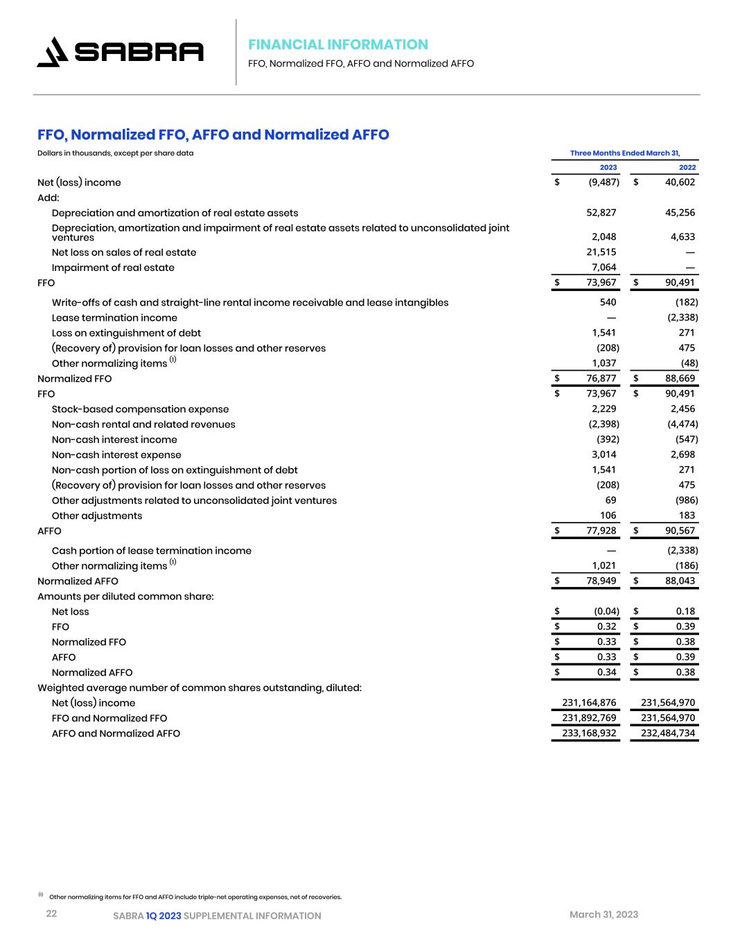 22 SABRA 1Q 2023 SUPPLEMENTAL INFORMATION March 31, 2023 FINANCIAL INFORMATION FFO, Normalized FFO, AFFO and Normalized AFFO (1) Other normalizing items for FFO and AFFO include triple-net operating expenses, net of recoveries. FFO, Normalized FFO, AFFO and Normalized AFFO Dollars in thousands, except per share data Three Months Ended March 31,   2023 2022 Net (loss) income $ (9,487) $ 40,602 Add: Depreciation and amortization of real estate assets 52,827 45,256 Depreciation, amortization and impairment of real estate assets related to unconsolidated joint ventures 2,048 4,633 Net loss on sales of real estate 21,515 — Impairment of real estate 7,064 — FFO $ 73,967 $ 90,491 Write-offs of cash and straight-line rental income receivable and lease intangibles 540 (182) Lease termination income — (2,338) Loss on extinguishment of debt 1,541 271 (Recovery of) provision for loan losses and other reserves (208) 475 Other normalizing items (1) 1,037 (48) Normalized FFO $ 76,877 $ 88,669 FFO $ 73,967 $ 90,491 Stock-based compensation expense 2,229 2,456 Non-cash rental and related revenues (2,398) (4,474) Non-cash interest income (392) (547) Non-cash interest expense 3,014 2,698 Non-cash portion of loss on extinguishment of debt 1,541 271 (Recovery of) provision for loan losses and other reserves (208) 475 Other adjustments related to unconsolidated joint ventures 69 (986) Other adjustments 106 183 AFFO $ 77,928 $ 90,567 Cash portion of lease termination income — (2,338) Other normalizing items (1) 1,021 (186) Normalized AFFO $ 78,949 $ 88,043 Amounts per diluted common share: Net loss $ (0.04) $ 0.18 FFO $ 0.32 $ 0.39 Normalized FFO $ 0.33 $ 0.38 AFFO $ 0.33 $ 0.39 Normalized AFFO $ 0.34 $ 0.38 Weighted average number of common shares outstanding, diluted: Net (loss) income 231,164,876 231,564,970 FFO and Normalized FFO 231,892,769 231,564,970 AFFO and Normalized AFFO 233,168,932 232,484,734