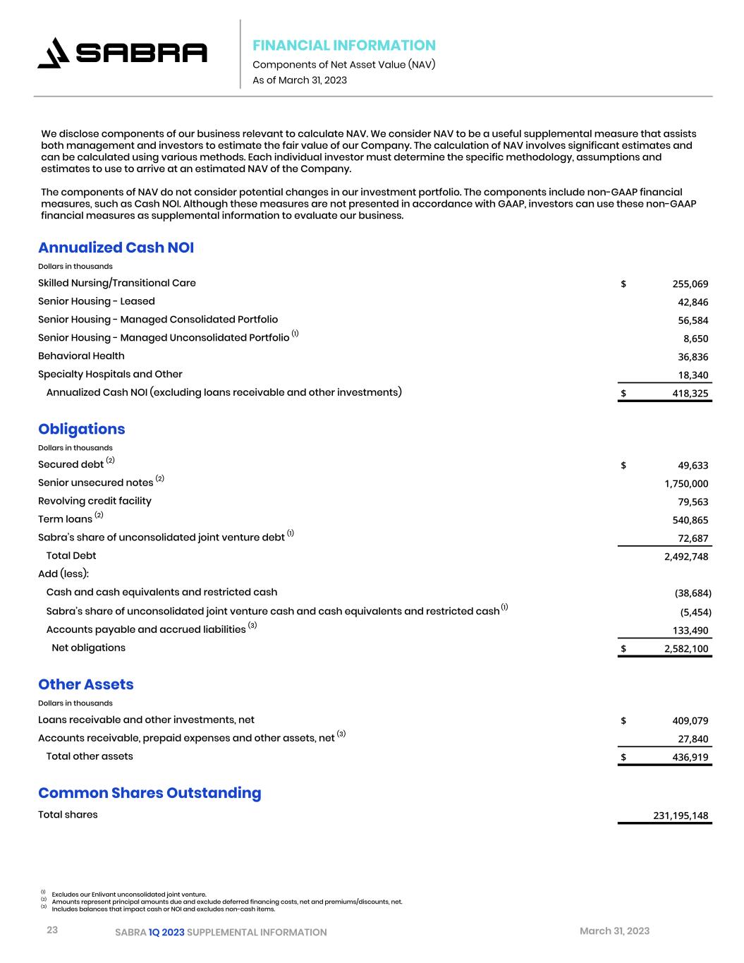 23 SABRA 1Q 2023 SUPPLEMENTAL INFORMATION March 31, 2023 FINANCIAL INFORMATION Components of Net Asset Value (NAV) As of March 31, 2023 (1) Excludes our Enlivant unconsolidated joint venture. (2) Amounts represent principal amounts due and exclude deferred financing costs, net and premiums/discounts, net. (3) Includes balances that impact cash or NOI and excludes non-cash items. Annualized Cash NOI Dollars in thousands Skilled Nursing/Transitional Care $ 255,069 Senior Housing - Leased 42,846 Senior Housing - Managed Consolidated Portfolio 56,584 Senior Housing - Managed Unconsolidated Portfolio (1) 8,650 Behavioral Health 36,836 Specialty Hospitals and Other 18,340 Annualized Cash NOI (excluding loans receivable and other investments) $ 418,325 Obligations Dollars in thousands Secured debt (2) $ 49,633 Senior unsecured notes (2) 1,750,000 Revolving credit facility 79,563 Term loans (2) 540,865 Sabra’s share of unconsolidated joint venture debt (1) 72,687 Total Debt 2,492,748 Add (less): Cash and cash equivalents and restricted cash (38,684) Sabra’s share of unconsolidated joint venture cash and cash equivalents and restricted cash (1) (5,454) Accounts payable and accrued liabilities (3) 133,490 Net obligations $ 2,582,100 Other Assets Dollars in thousands Loans receivable and other investments, net $ 409,079 Accounts receivable, prepaid expenses and other assets, net (3) 27,840 Total other assets $ 436,919 Common Shares Outstanding Total shares 231,195,148 We disclose components of our business relevant to calculate NAV. We consider NAV to be a useful supplemental measure that assists both management and investors to estimate the fair value of our Company. The calculation of NAV involves significant estimates and can be calculated using various methods. Each individual investor must determine the specific methodology, assumptions and estimates to use to arrive at an estimated NAV of the Company. The components of NAV do not consider potential changes in our investment portfolio. The components include non-GAAP financial measures, such as Cash NOI. Although these measures are not presented in accordance with GAAP, investors can use these non-GAAP financial measures as supplemental information to evaluate our business.