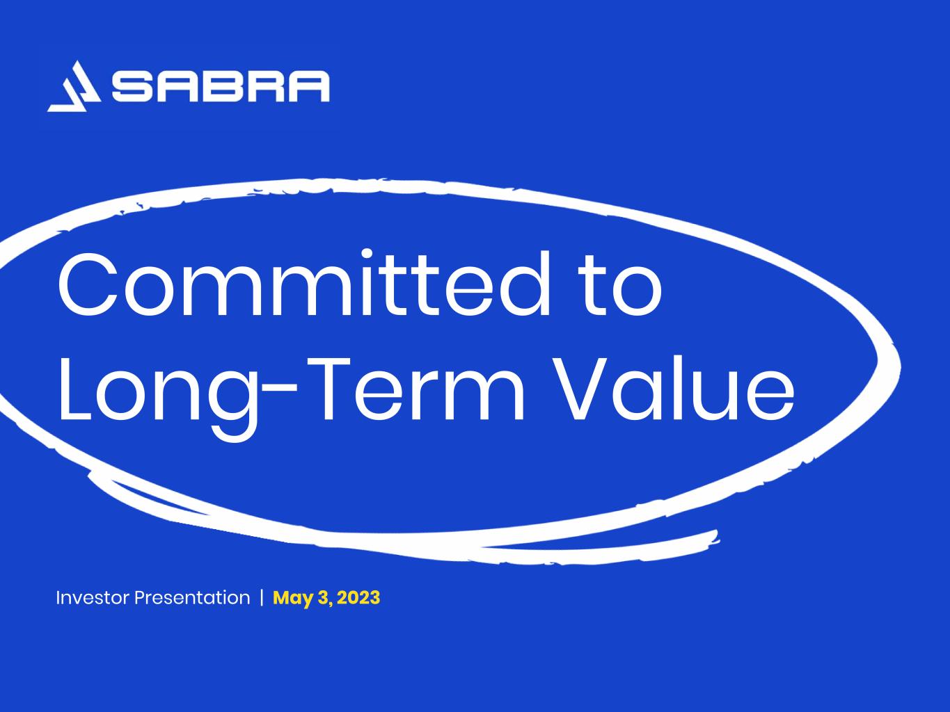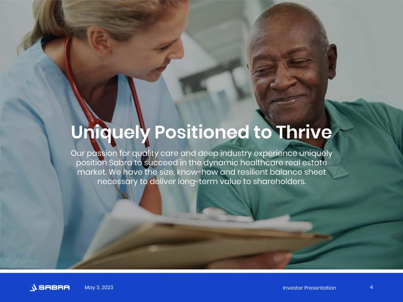 May 3, 2023 Investor Presentation Tenant and Borrower Information This presentation includes information (e.g., EBITDARM Coverage and Occupancy Percentage) regarding certain of our tenants that lease properties from us and our borrowers, most of which are not subject to SEC reporting requirements. The information related to our tenants and borrowers that is provided in this presentation has been provided by, or derived from information provided by, such tenants and borrowers. We have not independently verified this information. We have no reason to believe that such information is inaccurate in any material respect. We are providing this data for informational purposes only. Non-GAAP Financial Measures This presentation contains certain non-GAAP financial measures related to Sabra Health Care REIT, Inc., including Annualized Cash NOI, Net Debt to Adjusted EBITDA and funds from operations (FFO). These measures may be different than non-GAAP financial measures used by other companies, and the presentation of these measures is not intended to be considered in isolation or as a substitute for financial information prepared and presented in accordance with U.S. generally accepted accounting principles (GAAP). An explanation of these non-GAAP financial measures is included under “Definitions” in the Appendix, and reconciliations of these non-GAAP financial measures to the GAAP financial measures we consider most comparable are included on the Investors section of our website at https://ir.sabrahealth.com/investors/financials/quarterly-results. Disclaimers 3