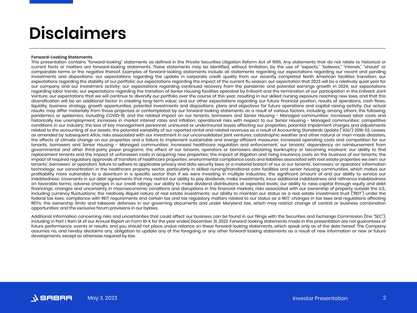 May 3, 2023 Investor Presentation Forward-Looking Statements This presentation contains “forward-looking” statements as defined in the Private Securities Litigation Reform Act of 1995. Any statements that do not relate to historical or current facts or matters are forward-looking statements. These statements may be identified, without limitation, by the use of “expects,” “believes,” “intends,” “should” or comparable terms or the negative thereof. Examples of forward-looking statements include all statements regarding our expectations regarding our recent and pending investments and dispositions; our expectations regarding the update in corporate credit quality from our recently completed North American facilities transition; our expectations regarding the stability of our portfolio; our expectations regarding the impact of the current flu season; our expectation that 2023 will be a relatively quiet year for our company and our investment activity; our expectations regarding continued recovery from the pandemic and potential earnings growth in 2024; our expectations regarding labor trends; our expectations regarding the transition of Senior Housing facilities operated by Enlivant and the termination of our participation in the Enlivant Joint Venture; our expectations that we will continue to diversify our portfolio over the course of this year, resulting in our skilled nursing exposure reaching new lows, and that this diversification will be an additional factor in creating long-term value; and our other expectations regarding our future financial position, results of operations, cash flows, liquidity, business strategy, growth opportunities, potential investments and dispositions, plans and objectives for future operations and capital raising activity. Our actual results may differ materially from those projected or contemplated by our forward-looking statements as a result of various factors, including, among others, the following: pandemics or epidemics, including COVID-19, and the related impact on our tenants, borrowers and Senior Housing - Managed communities; increased labor costs and historically low unemployment; increases in market interest rates and inflation; operational risks with respect to our Senior Housing - Managed communities; competitive conditions in our industry; the loss of key management personnel; uninsured or underinsured losses affecting our properties; potential impairment charges and adjustments related to the accounting of our assets; the potential variability of our reported rental and related revenues as a result of Accounting Standards Update (“ASU”) 2016-02, Leases, as amended by subsequent ASUs; risks associated with our investment in our unconsolidated joint ventures; catastrophic weather and other natural or man-made disasters, the effects of climate change on our properties and a failure to implement sustainable and energy-efficient measures; increased operating costs and competition for our tenants, borrowers and Senior Housing - Managed communities; increased healthcare regulation and enforcement; our tenants’ dependency on reimbursement from governmental and other third-party payor programs; the effect of our tenants, operators or borrowers declaring bankruptcy or becoming insolvent; our ability to find replacement tenants and the impact of unforeseen costs in acquiring new properties; the impact of litigation and rising insurance costs on the business of our tenants; the impact of required regulatory approvals of transfers of healthcare properties; environmental compliance costs and liabilities associated with real estate properties we own; our tenants’, borrowers’ or operators’ failure to adhere to applicable privacy and data security laws, or a material breach of our or our tenants’, borrowers’ or operators’ information technology; our concentration in the healthcare property sector, particularly in skilled nursing/transitional care facilities and senior housing communities, which makes our profitability more vulnerable to a downturn in a specific sector than if we were investing in multiple industries; the significant amount of and our ability to service our indebtedness; covenants in our debt agreements that may restrict our ability to pay dividends, make investments, incur additional indebtedness and refinance indebtedness on favorable terms; adverse changes in our credit ratings; our ability to make dividend distributions at expected levels; our ability to raise capital through equity and debt financings; changes and uncertainty in macroeconomic conditions and disruptions in the financial markets, risks associated with our ownership of property outside the U.S., including currency fluctuations; the relatively illiquid nature of real estate investments; our ability to maintain our status as a real estate investment trust (“REIT”) under the federal tax laws; compliance with REIT requirements and certain tax and tax regulatory matters related to our status as a REIT; changes in tax laws and regulations affecting REITs; the ownership limits and takeover defenses in our governing documents and under Maryland law, which may restrict change of control or business combination opportunities; and the exclusive forum provisions in our bylaws. Additional information concerning risks and uncertainties that could affect our business can be found in our filings with the Securities and Exchange Commission (the “SEC”), including in Part I, Item 1A of our Annual Report on Form 10-K for the year ended December 31, 2022. Forward-looking statements made in this presentation are not guarantees of future performance, events or results, and you should not place undue reliance on these forward-looking statements, which speak only as of the date hereof. The Company assumes no, and hereby disclaims any, obligation to update any of the foregoing or any other forward-looking statements as a result of new information or new o