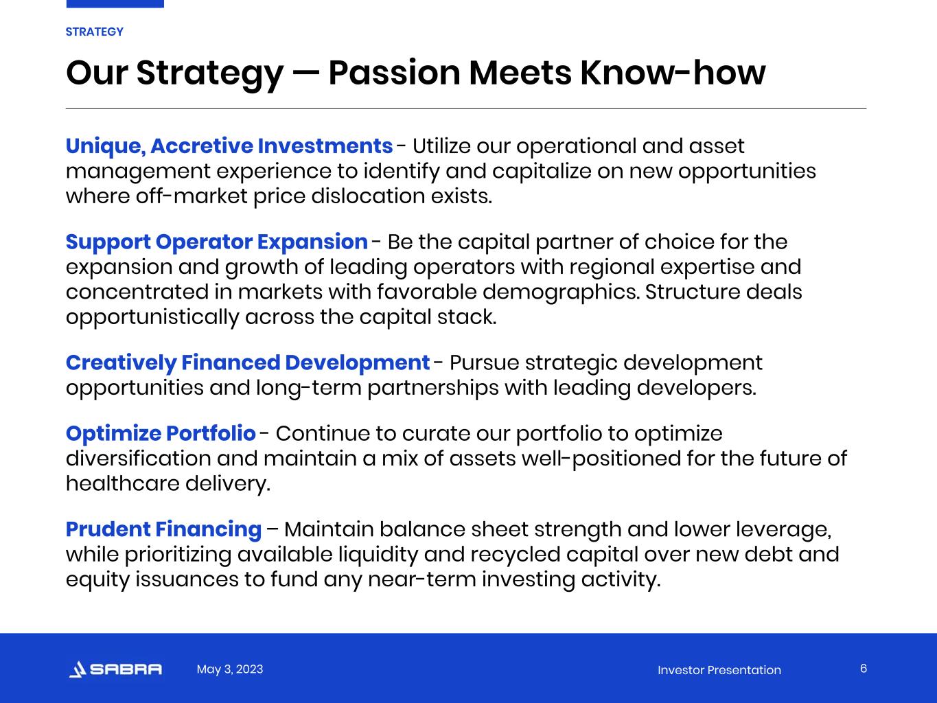 May 3, 2023 Investor Presentation 5 “We know what happens inside our buildings matters most. That’s why we align ourselves with operators who skillfully and compassionately care for the residents and patients in the buildings we own.” -Rick Matros (he/him), Chief Executive Officer STRATEGY