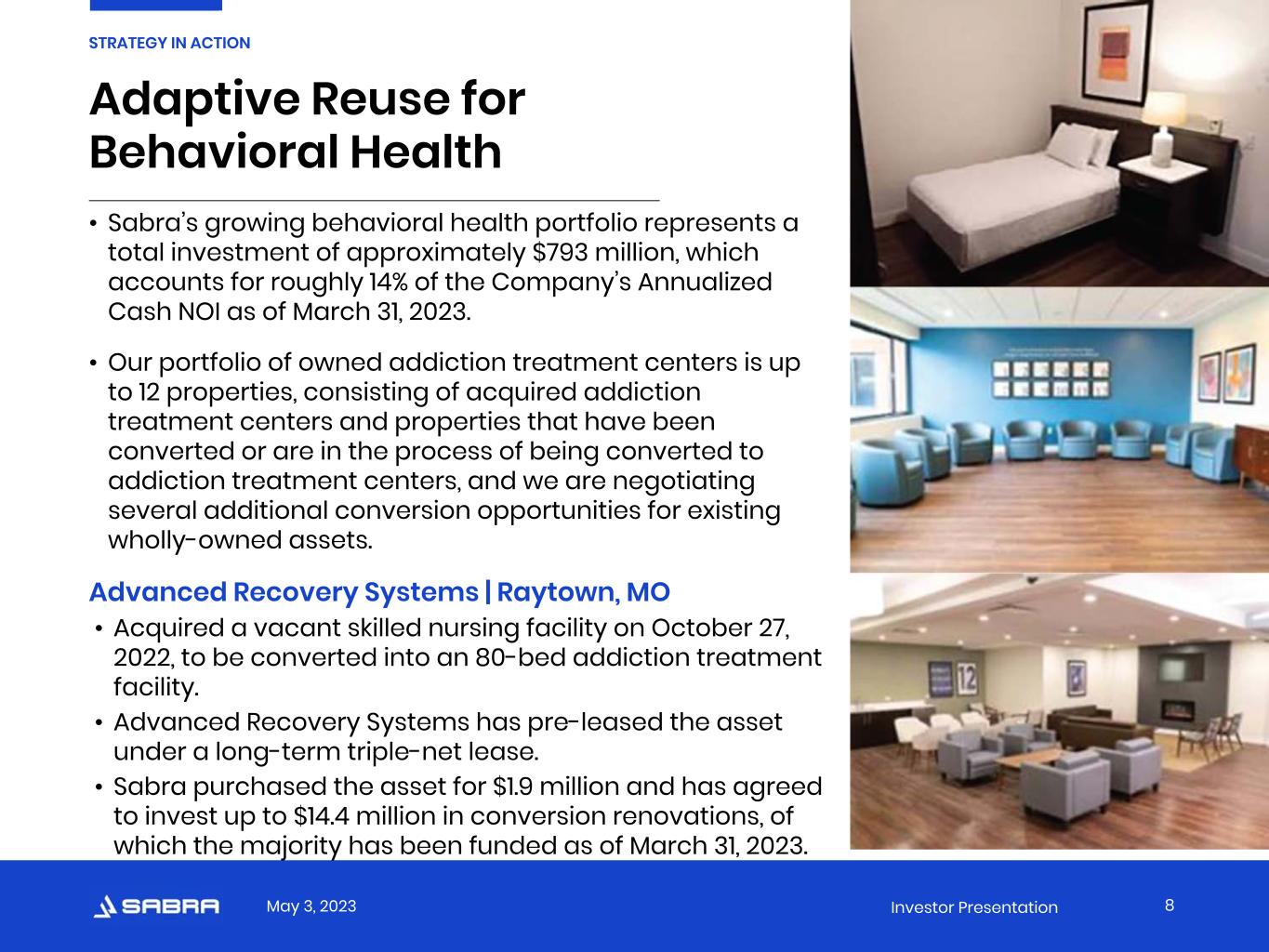 May 3, 2023 Investor Presentation Adaptive Reuse for Behavioral Health 8 STRATEGY IN ACTION • Sabra’s growing behavioral health portfolio represents a total investment of approximately $793 million, which accounts for roughly 14% of the Company’s Annualized Cash NOI as of March 31, 2023. • Our portfolio of owned addiction treatment centers is up to 12 properties, consisting of acquired addiction treatment centers and properties that have been converted or are in the process of being converted to addiction treatment centers, and we are negotiating several additional conversion opportunities for existing wholly-owned assets. Advanced Recovery Systems | Raytown, MO • Acquired a vacant skilled nursing facility on October 27, 2022, to be converted into an 80-bed addiction treatment facility. • Advanced Recovery Systems has pre-leased the asset under a long-term triple-net lease. • Sabra purchased the asset for $1.9 million and has agreed to invest up to $14.4 million in conversion renovations, of which the majority has been funded as of March 31, 2023.