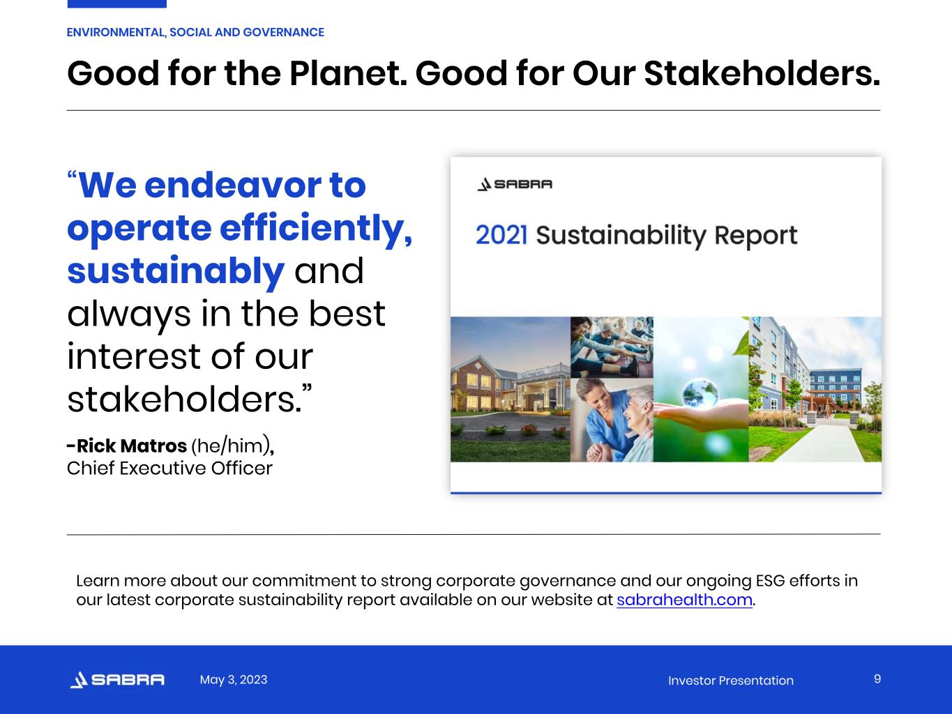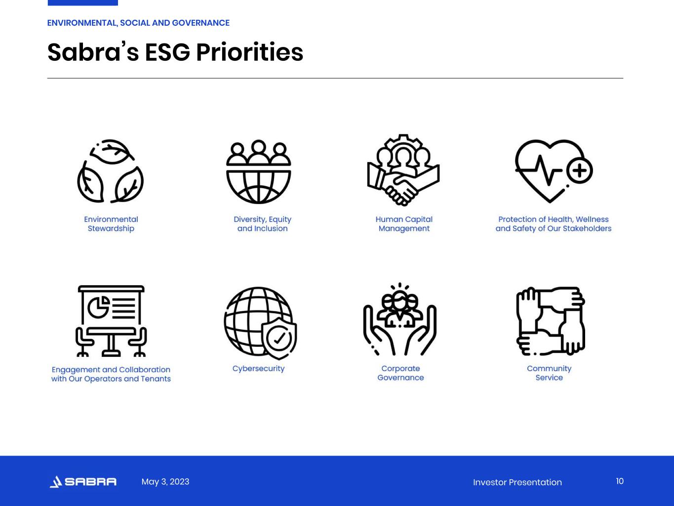 May 3, 2023 Investor Presentation Good for the Planet. Good for Our Stakeholders. Learn more about our commitment to strong corporate governance and our ongoing ESG efforts in our latest corporate sustainability report available on our website at sabrahealth.com. “We endeavor to operate efficiently, sustainably and always in the best interest of our stakeholders.” -Rick Matros (he/him), Chief Executive Officer 9 ENVIRONMENTAL, SOCIAL AND GOVERNANCE