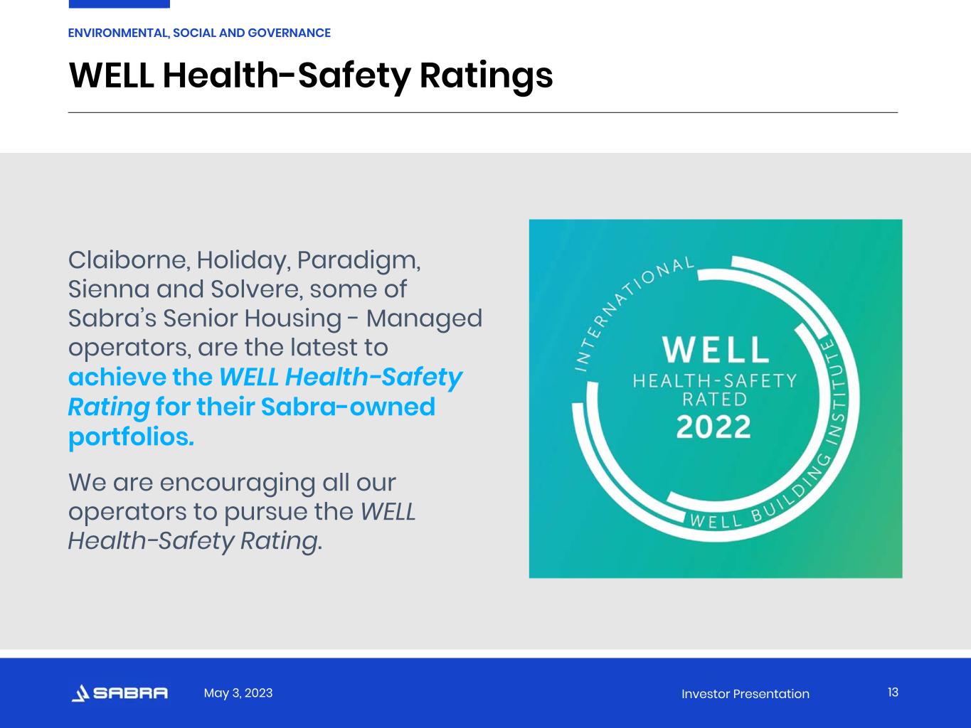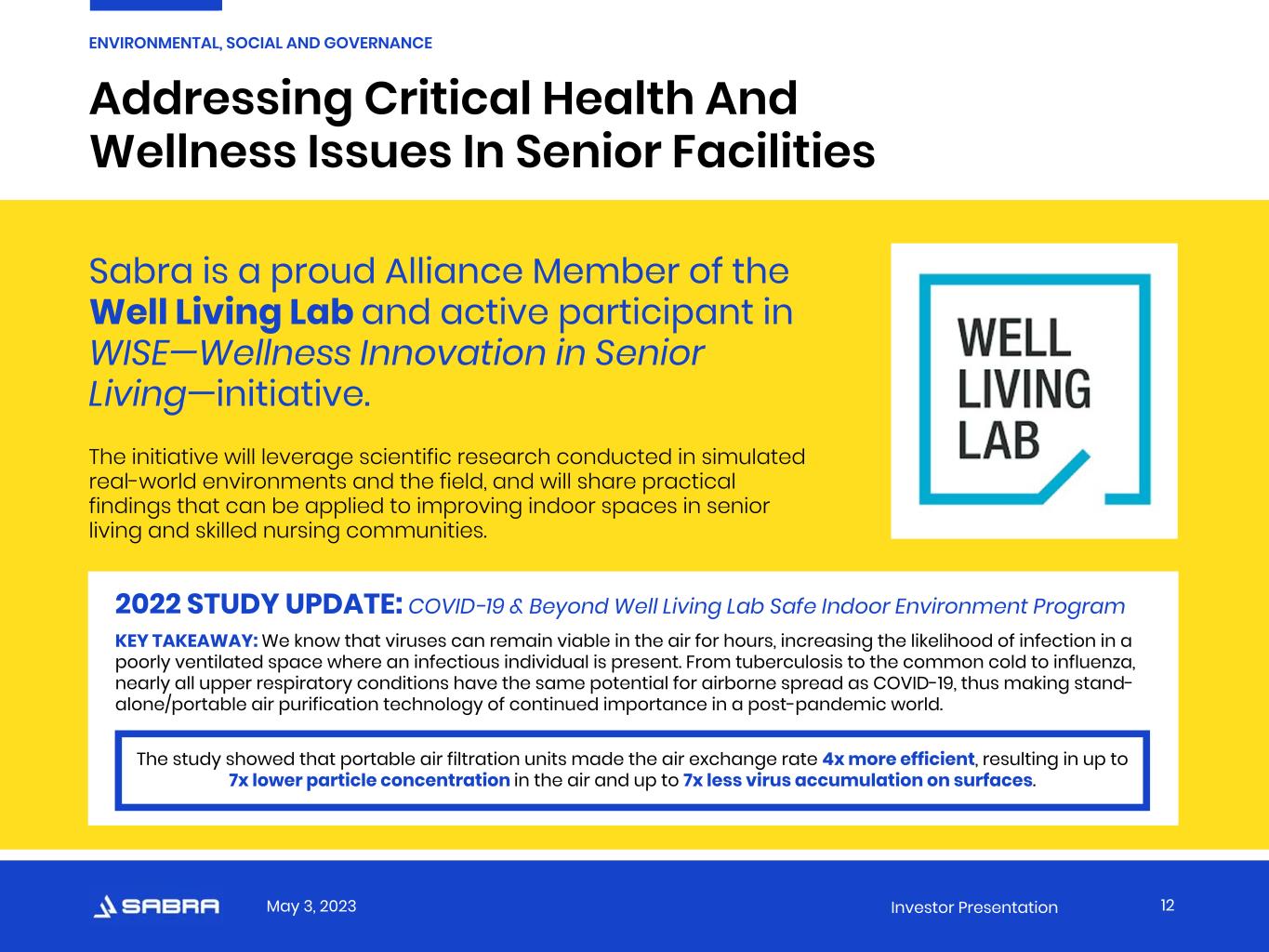 May 3, 2023 Investor Presentation Addressing Critical Health And Wellness Issues In Senior Facilities  Sabra is a proud Alliance Member of the Well Living Lab and active participant in WISE—Wellness Innovation in Senior Living—initiative. The initiative will leverage scientific research conducted in simulated real-world environments and the field, and will share practical findings that can be applied to improving indoor spaces in senior living and skilled nursing communities.   12 ENVIRONMENTAL, SOCIAL AND GOVERNANCE 2022 STUDY UPDATE: COVID-19 & Beyond Well Living Lab Safe Indoor Environment Program KEY TAKEAWAY: We know that viruses can remain viable in the air for hours, increasing the likelihood of infection in a poorly ventilated space where an infectious individual is present. From tuberculosis to the common cold to influenza, nearly all upper respiratory conditions have the same potential for airborne spread as COVID-19, thus making stand- alone/portable air purification technology of continued importance in a post-pandemic world. The study showed that portable air filtration units made the air exchange rate 4x more efficient, resulting in up to 7x lower particle concentration in the air and up to 7x less virus accumulation on surfaces.