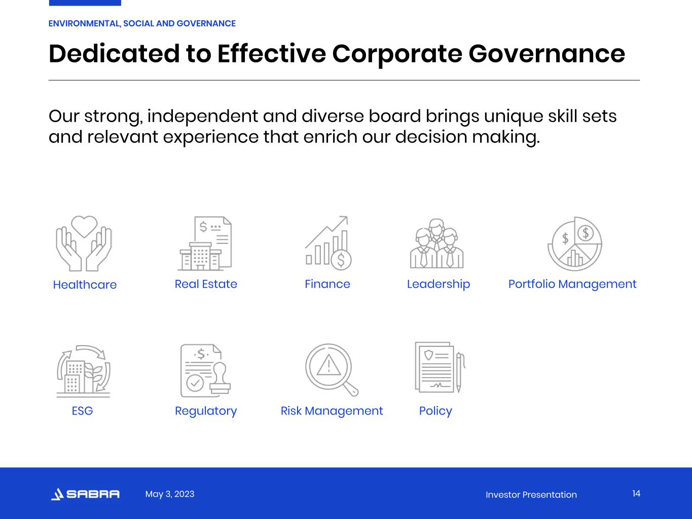 May 3, 2023 Investor Presentation WELL Health-Safety Ratings Claiborne, Holiday, Paradigm, Sienna and Solvere, some of Sabra’s Senior Housing - Managed operators, are the latest to achieve the WELL Health-Safety Rating for their Sabra-owned portfolios.  We are encouraging all our operators to pursue the WELL Health-Safety Rating. 13 ENVIRONMENTAL, SOCIAL AND GOVERNANCE