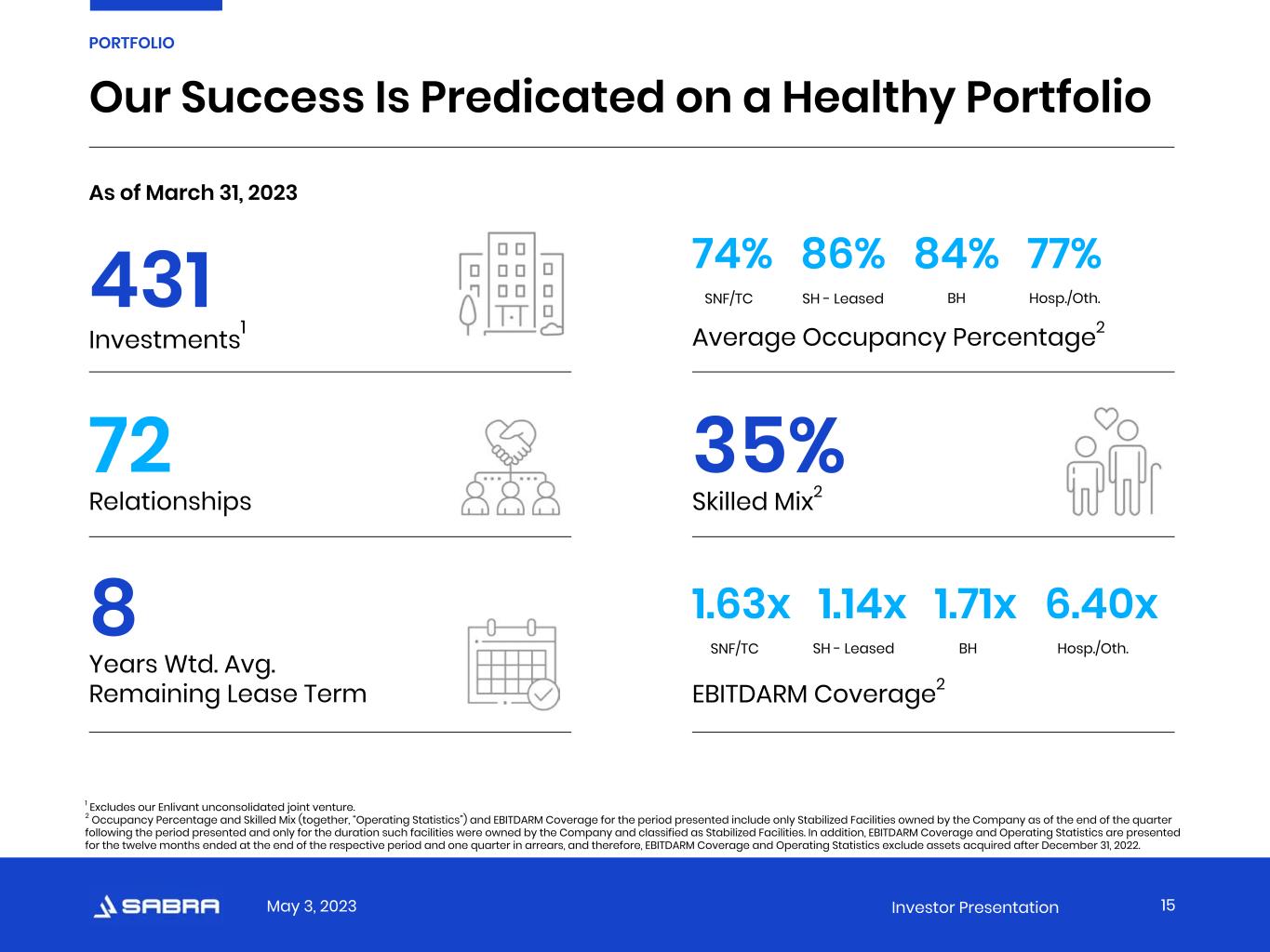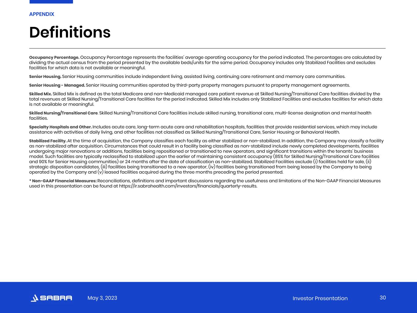 May 3, 2023 Investor Presentation Occupancy Percentage. Occupancy Percentage represents the facilities’ average operating occupancy for the period indicated. The percentages are calculated by dividing the actual census from the period presented by the available beds/units for the same period. Occupancy includes only Stabilized Facilities and excludes facilities for which data is not available or meaningful. Senior Housing. Senior Housing communities include independent living, assisted living, continuing care retirement and memory care communities. Senior Housing - Managed. Senior Housing communities operated by third-party property managers pursuant to property management agreements. Skilled Mix. Skilled Mix is defined as the total Medicare and non-Medicaid managed care patient revenue at Skilled Nursing/Transitional Care facilities divided by the total revenues at Skilled Nursing/Transitional Care facilities for the period indicated. Skilled Mix includes only Stabilized Facilities and excludes facilities for which data is not available or meaningful. Skilled Nursing/Transitional Care. Skilled Nursing/Transitional Care facilities include skilled nursing, transitional care, multi-license designation and mental health facilities. Specialty Hospitals and Other. Includes acute care, long-term acute care and rehabilitation hospitals, facilities that provide residential services, which may include assistance with activities of daily living, and other facilities not classified as Skilled Nursing/Transitional Care, Senior Housing or Behavioral Health. Stabilized Facility. At the time of acquisition, the Company classifies each facility as either stabilized or non-stabilized. In addition, the Company may classify a facility as non-stabilized after acquisition. Circumstances that could result in a facility being classified as non-stabilized include newly completed developments, facilities undergoing major renovations or additions, facilities being repositioned or transitioned to new operators, and significant transitions within the tenants’ business model. Such facilities are typically reclassified to stabilized upon the earlier of maintaining consistent occupancy (85% for Skilled Nursing/Transitional Care facilities and 90% for Senior Housing communities) or 24 months after the date of classification as non-stabilized. Stabilized Facilities exclude (i) facilities held for sale, (ii) strategic disposition candidates, (iii) facilities being transitioned to a new operator, (iv) facilities being transitioned from being leased by the Company to being operated by the Company and (v) leased facilities acquired during the three months preceding the period presented. * Non-GAAP Financial Measures: Reconciliations, definitions and important discussions regarding the usefulness and limitations of the Non-GAAP Financial Measures used in this presentation can be found at https://ir.sabrahealth.com/investors/financials/quarterly-results. APPENDIX Definitions 30