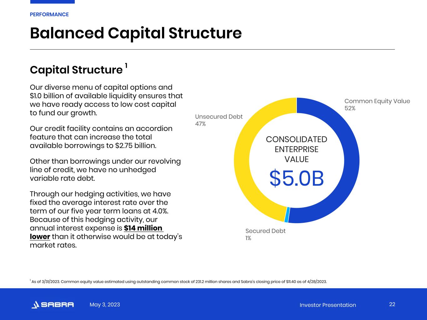 May 3, 2023 Investor Presentation “Our strong balance sheet and ready access to capital allows us to thoughtfully finance investment opportunities and drive value for our shareholders.” –Michael Costa, Chief Financial Officer 21 PERFORMANCE