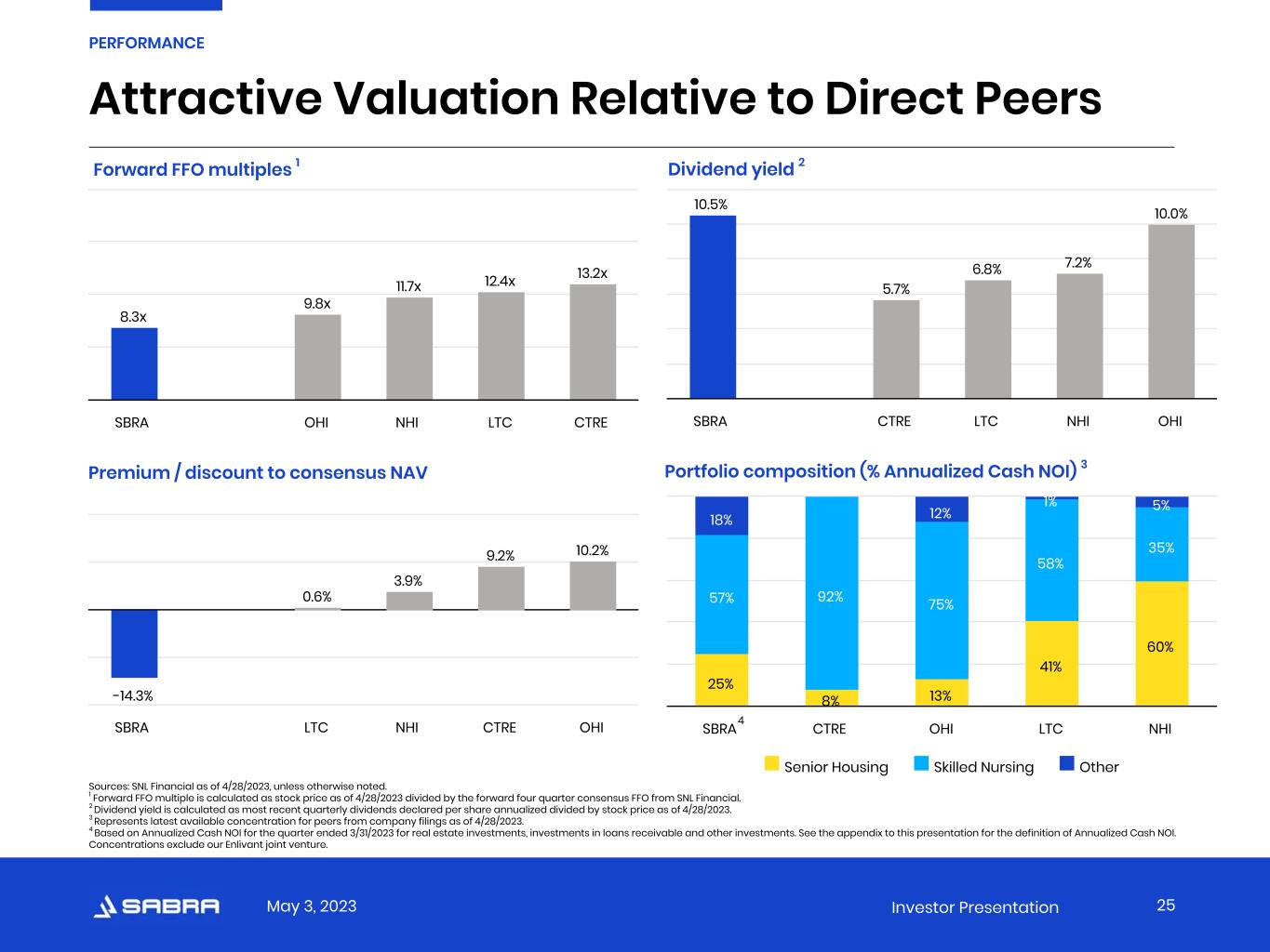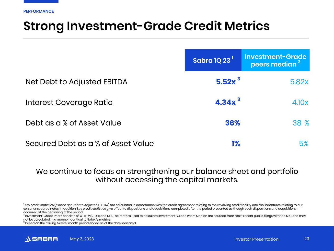 May 3, 2023 Investor Presentation   Sabra 1Q 23 1 Investment-Grade peers median 2 Net Debt to Adjusted EBITDA 5.52x 3 5.82x Interest Coverage Ratio 4.34x 3 4.10x Debt as a % of Asset Value 36% 38 % Secured Debt as a % of Asset Value 1% 5% Strong Investment-Grade Credit Metrics 1 Key credit statistics (except Net Debt to Adjusted EBITDA) are calculated in accordance with the credit agreement relating to the revolving credit facility and the indentures relating to our senior unsecured notes. In addition, key credit statistics give effect to dispositions and acquisitions completed after the period presented as though such dispositions and acquisitions occurred at the beginning of the period. 2 Investment-Grade Peers consists of WELL, VTR, OHI and NHI. The metrics used to calculate Investment-Grade Peers Median are sourced from most recent public filings with the SEC and may not be calculated in a manner identical to Sabra’s metrics. 3 Based on the trailing twelve-month period ended as of the date indicated. 23 PERFORMANCE We continue to focus on strengthening our balance sheet and portfolio without accessing the capital markets.