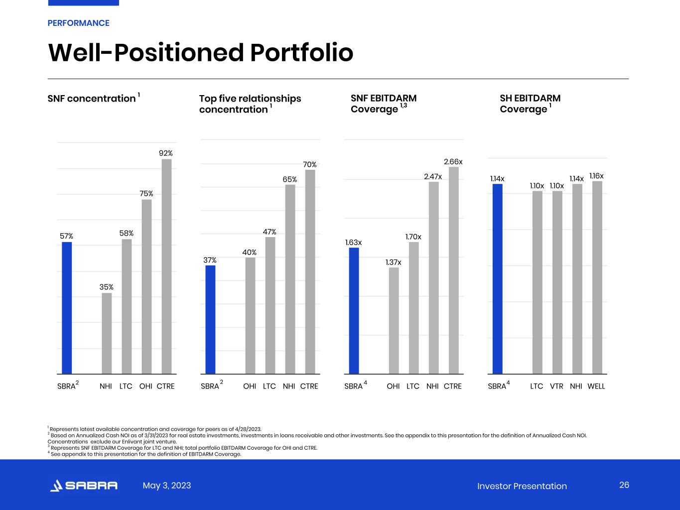 May 3, 2023 Investor Presentation Attractive Valuation Relative to Direct Peers Forward FFO multiples 1 Dividend yield 2 Premium / discount to consensus NAV Portfolio composition (% Annualized Cash NOI) 3 Sources: SNL Financial as of 4/28/2023, unless otherwise noted. 1 Forward FFO multiple is calculated as stock price as of 4/28/2023 divided by the forward four quarter consensus FFO from SNL Financial. 2 Dividend yield is calculated as most recent quarterly dividends declared per share annualized divided by stock price as of 4/28/2023. 3 Represents latest available concentration for peers from company filings as of 4/28/2023. 4 Based on Annualized Cash NOI for the quarter ended 3/31/2023 for real estate investments, investments in loans receivable and other investments. See the appendix to this presentation for the definition of Annualized Cash NOI. Concentrations exclude our Enlivant joint venture. 25 PERFORMANCE 8.3x 9.8x 11.7x 12.4x 13.2x SBRA OHI NHI LTC CTRE 10.5% 5.7% 6.8% 7.2% 10.0% SBRA CTRE LTC NHI OHI -14.3% 0.6% 3.9% 9.2% 10.2% SBRA LTC NHI CTRE OHI 25% 8% 13% 41% 60% 57% 92% 75% 58% 35% 18% 12% 1% 5% Senior Housing Skilled Nursing Other SBRA CTRE OHI LTC NHI4
