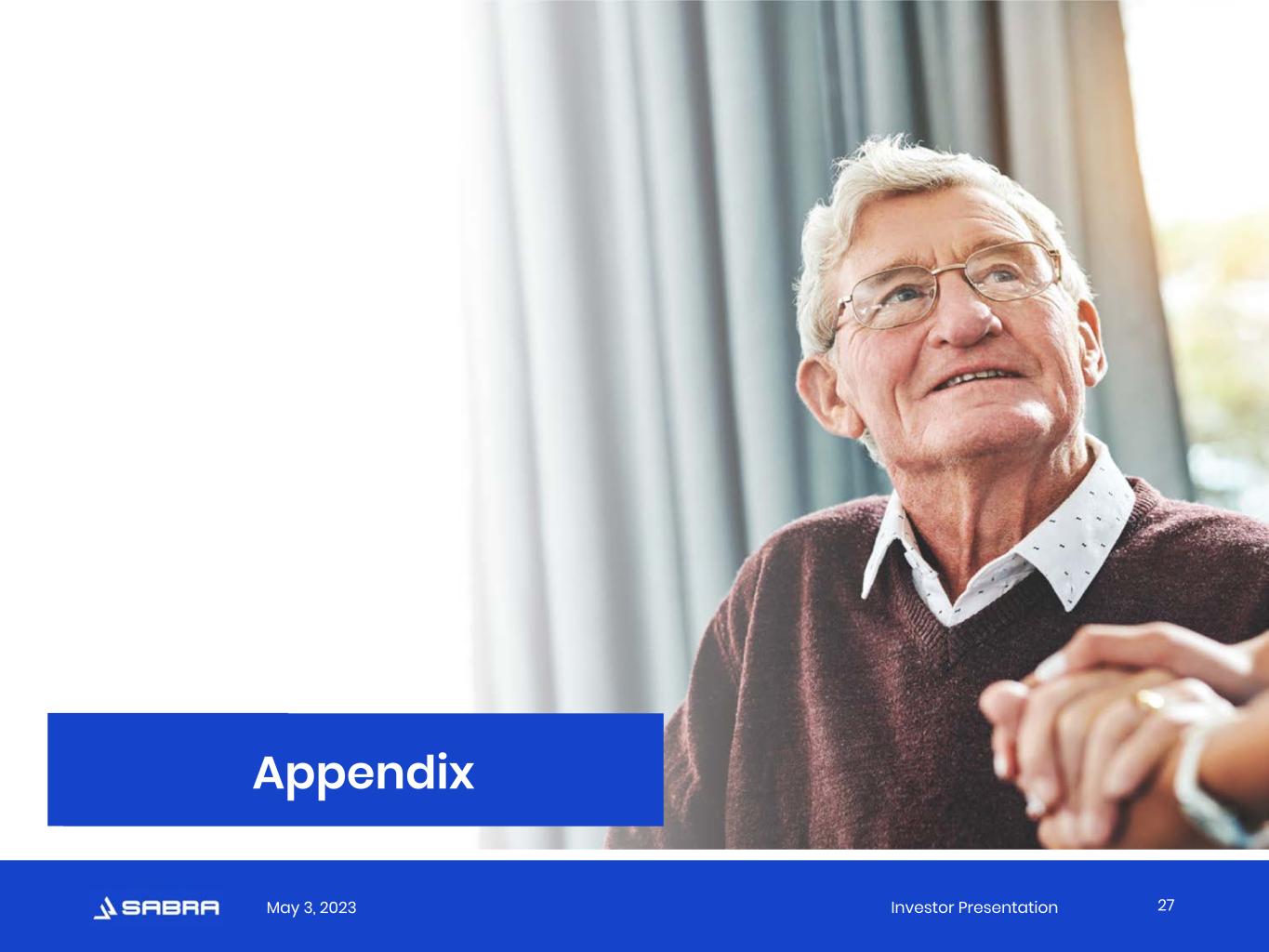 May 3, 2023 Investor Presentation Well-Positioned Portfolio SNF concentration 1 1 Represents latest available concentration and coverage for peers as of 4/28/2023. 2 Based on Annualized Cash NOI as of 3/31/2023 for real estate investments, investments in loans receivable and other investments. See the appendix to this presentation for the definition of Annualized Cash NOI. Concentrations exclude our Enlivant joint venture. 3 Represents SNF EBITDARM Coverage for LTC and NHI; total portfolio EBITDARM Coverage for OHI and CTRE. 4 See appendix to this presentation for the definition of EBITDARM Coverage. Top five relationships concentration 1 SNF EBITDARM Coverage 1,3 SH EBITDARM Coverage 1 26 PERFORMANCE 57% 35% 58% 75% 92% SBRA NHI LTC OHI CTRE 37% 40% 47% 65% 70% SBRA OHI LTC NHI CTRE 1.63x 1.37x 1.70x 2.47x 2.66x SBRA OHI LTC NHI CTRE 1.14x 1.10x 1.10x 1.14x 1.16x SBRA LTC VTR NHI WELL2 2 4 4