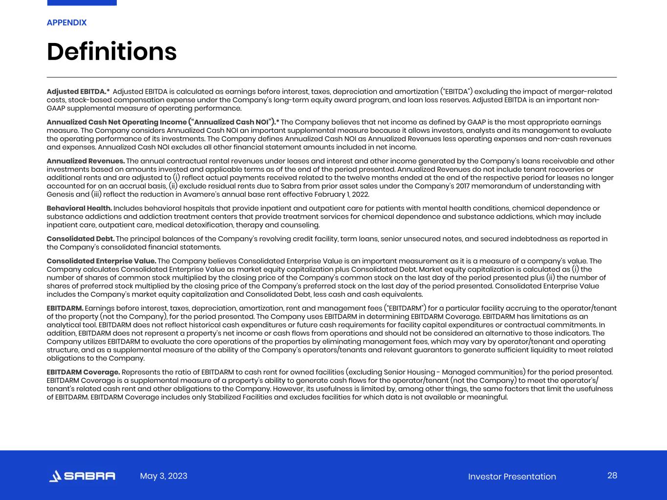 May 3, 2023 Investor Presentation Adjusted EBITDA.* Adjusted EBITDA is calculated as earnings before interest, taxes, depreciation and amortization (“EBITDA”) excluding the impact of merger-related costs, stock-based compensation expense under the Company's long-term equity award program, and loan loss reserves. Adjusted EBITDA is an important non- GAAP supplemental measure of operating performance. Annualized Cash Net Operating Income (“Annualized Cash NOI”).* The Company believes that net income as defined by GAAP is the most appropriate earnings measure. The Company considers Annualized Cash NOI an important supplemental measure because it allows investors, analysts and its management to evaluate the operating performance of its investments. The Company defines Annualized Cash NOI as Annualized Revenues less operating expenses and non-cash revenues and expenses. Annualized Cash NOI excludes all other financial statement amounts included in net income. Annualized Revenues. The annual contractual rental revenues under leases and interest and other income generated by the Company’s loans receivable and other investments based on amounts invested and applicable terms as of the end of the period presented. Annualized Revenues do not include tenant recoveries or additional rents and are adjusted to (i) reflect actual payments received related to the twelve months ended at the end of the respective period for leases no longer accounted for on an accrual basis, (ii) exclude residual rents due to Sabra from prior asset sales under the Company’s 2017 memorandum of understanding with Genesis and (iii) reflect the reduction in Avamere’s annual base rent effective February 1, 2022. Behavioral Health. Includes behavioral hospitals that provide inpatient and outpatient care for patients with mental health conditions, chemical dependence or substance addictions and addiction treatment centers that provide treatment services for chemical dependence and substance addictions, which may include inpatient care, outpatient care, medical detoxification, therapy and counseling. Consolidated Debt. The principal balances of the Company’s revolving credit facility, term loans, senior unsecured notes, and secured indebtedness as reported in the Company’s consolidated financial statements. Consolidated Enterprise Value. The Company believes Consolidated Enterprise Value is an important measurement as it is a measure of a company’s value. The Company calculates Consolidated Enterprise Value as market equity capitalization plus Consolidated Debt. Market equity capitalization is calculated as (i) the number of shares of common stock multiplied by the closing price of the Company’s common stock on the last day of the period presented plus (ii) the number of shares of preferred stock multiplied by the closing price of the Company’s preferred stock on the last day of the period presented. Consolidated Enterprise Value includes the Company’s market equity capitalization and Consolidated Debt, less cash and cash equivalents. EBITDARM. Earnings before interest, taxes, depreciation, amortization, rent and management fees (“EBITDARM”) for a particular facility accruing to the operator/tenant of the property (not the Company), for the period presented. The Company uses EBITDARM in determining EBITDARM Coverage. EBITDARM has limitations as an analytical tool. EBITDARM does not reflect historical cash expenditures or future cash requirements for facility capital expenditures or contractual commitments. In addition, EBITDARM does not represent a property’s net income or cash flows from operations and should not be considered an alternative to those indicators. The Company utilizes EBITDARM to evaluate the core operations of the properties by eliminating management fees, which may vary by operator/tenant and operating structure, and as a supplemental measure of the ability of the Company’s operators/tenants and relevant guarantors to generate sufficient liquidity to meet related obligations to the Company. EBITDARM Coverage. Represents the ratio of EBITDARM to cash rent for owned facilities (excluding Senior Housing - Managed communities) for the period presented. EBITDARM Coverage is a supplemental measure of a property’s ability to generate cash flows for the operator/tenant (not the Company) to meet the operator’s/ tenant’s related cash rent and other obligations to the Company. However, its usefulness is limited by, among other things, the same factors that limit the usefulness of EBITDARM. EBITDARM Coverage includes only Stabilized Facilities and excludes facilities for which data is not available or meaningful. Definitions 28 APPENDIX