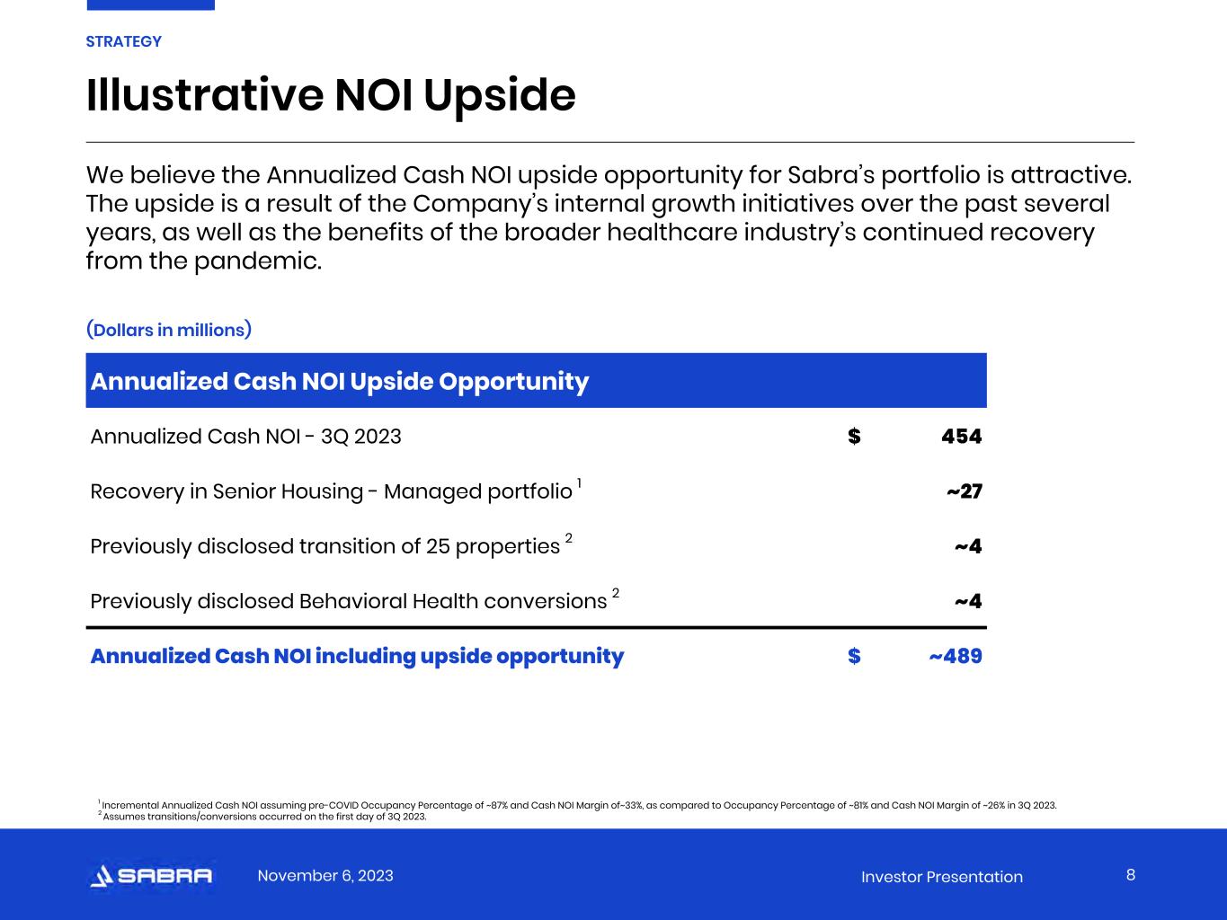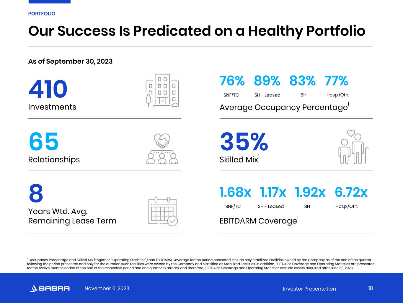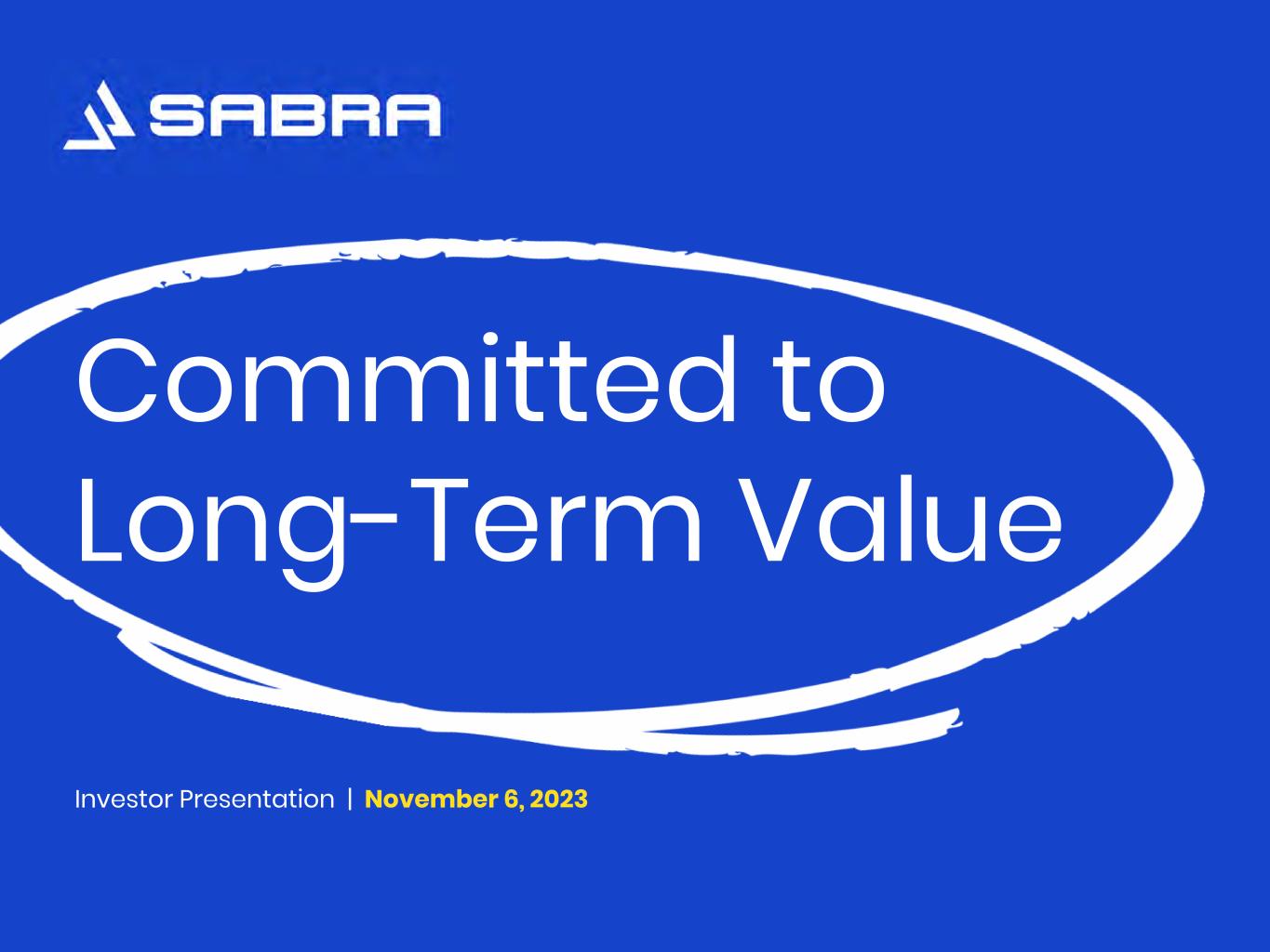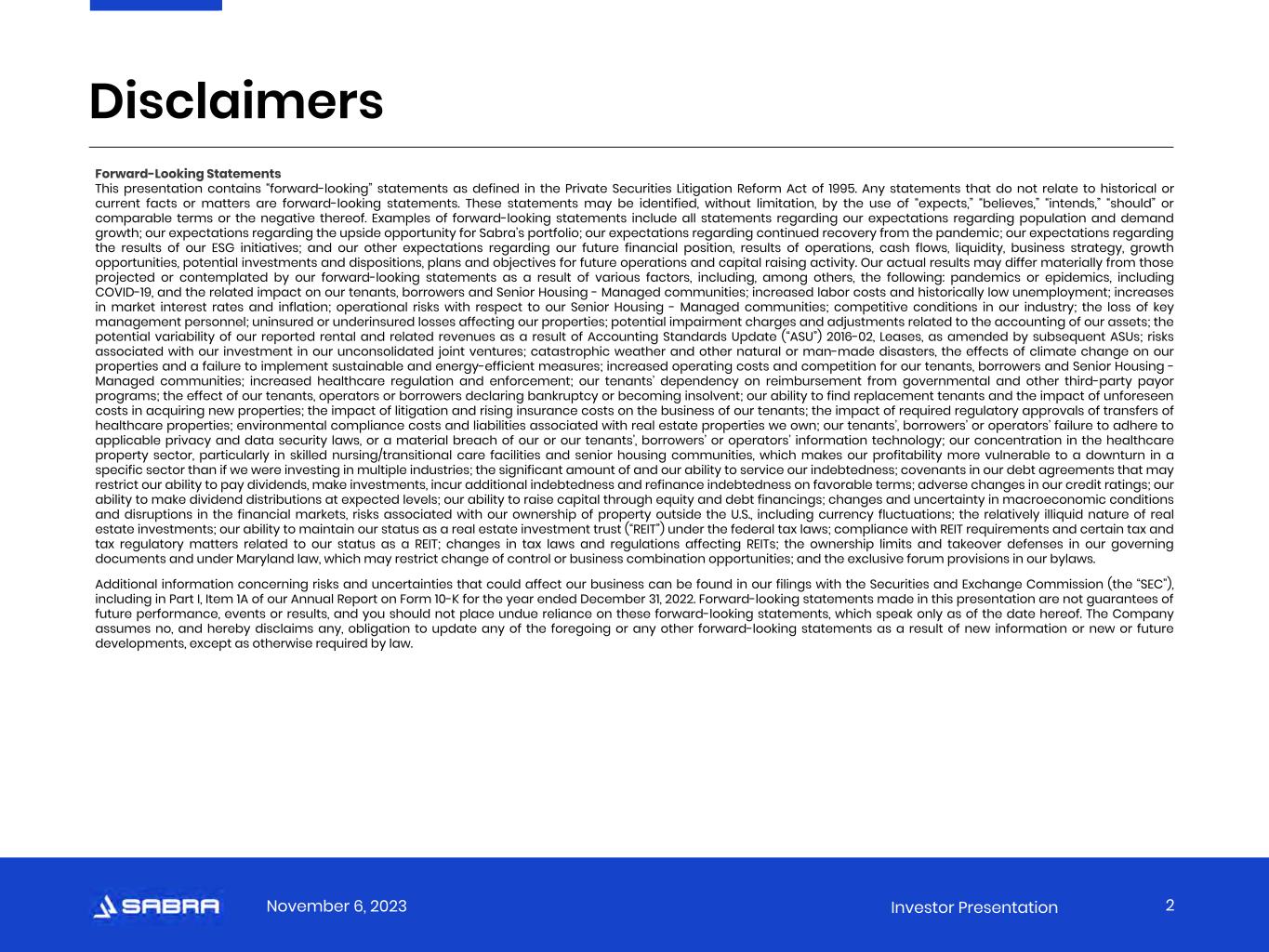 November 6, 2023 Investor Presentation Forward-Looking Statements This presentation contains “forward-looking” statements as defined in the Private Securities Litigation Reform Act of 1995. Any statements that do not relate to historical or current facts or matters are forward-looking statements. These statements may be identified, without limitation, by the use of “expects,” “believes,” “intends,” “should” or comparable terms or the negative thereof. Examples of forward-looking statements include all statements regarding our expectations regarding population and demand growth; our expectations regarding the upside opportunity for Sabra’s portfolio; our expectations regarding continued recovery from the pandemic; our expectations regarding the results of our ESG initiatives; and our other expectations regarding our future financial position, results of operations, cash flows, liquidity, business strategy, growth opportunities, potential investments and dispositions, plans and objectives for future operations and capital raising activity. Our actual results may differ materially from those projected or contemplated by our forward-looking statements as a result of various factors, including, among others, the following: pandemics or epidemics, including COVID-19, and the related impact on our tenants, borrowers and Senior Housing - Managed communities; increased labor costs and historically low unemployment; increases in market interest rates and inflation; operational risks with respect to our Senior Housing - Managed communities; competitive conditions in our industry; the loss of key management personnel; uninsured or underinsured losses affecting our properties; potential impairment charges and adjustments related to the accounting of our assets; the potential variability of our reported rental and related revenues as a result of Accounting Standards Update (“ASU”) 2016-02, Leases, as amended by subsequent ASUs; risks associated with our investment in our unconsolidated joint ventures; catastrophic weather and other natural or man-made disasters, the effects of climate change on our properties and a failure to implement sustainable and energy-efficient measures; increased operating costs and competition for our tenants, borrowers and Senior Housing - Managed communities; increased healthcare regulation and enforcement; our tenants’ dependency on reimbursement from governmental and other third-party payor programs; the effect of our tenants, operators or borrowers declaring bankruptcy or becoming insolvent; our ability to find replacement tenants and the impact of unforeseen costs in acquiring new properties; the impact of litigation and rising insurance costs on the business of our tenants; the impact of required regulatory approvals of transfers of healthcare properties; environmental compliance costs and liabilities associated with real estate properties we own; our tenants’, borrowers’ or operators’ failure to adhere to applicable privacy and data security laws, or a material breach of our or our tenants’, borrowers’ or operators’ information technology; our concentration in the healthcare property sector, particularly in skilled nursing/transitional care facilities and senior housing communities, which makes our profitability more vulnerable to a downturn in a specific sector than if we were investing in multiple industries; the significant amount of and our ability to service our indebtedness; covenants in our debt agreements that may restrict our ability to pay dividends, make investments, incur additional indebtedness and refinance indebtedness on favorable terms; adverse changes in our credit ratings; our ability to make dividend distributions at expected levels; our ability to raise capital through equity and debt financings; changes and uncertainty in macroeconomic conditions and disruptions in the financial markets, risks associated with our ownership of property outside the U.S., including currency fluctuations; the relatively illiquid nature of real estate investments; our ability to maintain our status as a real estate investment trust (“REIT”) under the federal tax laws; compliance with REIT requirements and certain tax and tax regulatory matters related to our status as a REIT; changes in tax laws and regulations affecting REITs; the ownership limits and takeover defenses in our governing documents and under Maryland law, which may restrict change of control or business combination opportunities; and the exclusive forum provisions in our bylaws. Additional information concerning risks and uncertainties that could affect our business can be found in our filings with the Securities and Exchange Commission (the “SEC”), including in Part I, Item 1A of our Annual Report on Form 10-K for the year ended December 31, 2022. Forward-looking statements made in this presentation are not guarantees of future performance, events or results, and you should not place undue reliance on these forward-looking statements, which speak only as of the date hereof. The Company assumes no, and hereby disclaims any, obligation to update any of the foregoing or any other forward-looking statements as a result of new information or new or future developments, except as otherwise required by law. Disclaimers 2