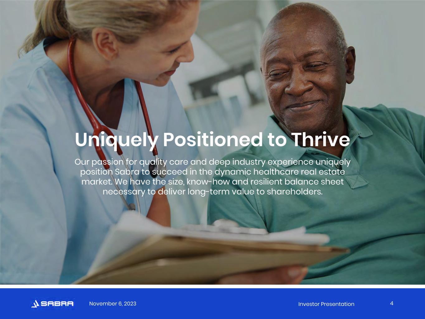 November 6, 2023 Investor Presentation Tenant and Borrower Information This presentation includes information (e.g., EBITDARM Coverage and Occupancy Percentage) regarding certain of our tenants that lease properties from us and our borrowers, most of which are not subject to SEC reporting requirements. The information related to our tenants and borrowers that is provided in this presentation has been provided by, or derived from information provided by, such tenants and borrowers. We have not independently verified this information. We have no reason to believe that such information is inaccurate in any material respect. We are providing this data for informational purposes only. Non-GAAP Financial Measures This presentation contains certain non-GAAP financial measures related to Sabra Health Care REIT, Inc., including Annualized Cash NOI, Net Debt to Adjusted EBITDA and funds from operations (FFO). These measures may be different than non-GAAP financial measures used by other companies, and the presentation of these measures is not intended to be considered in isolation or as a substitute for financial information prepared and presented in accordance with U.S. generally accepted accounting principles (GAAP). An explanation of these non-GAAP financial measures is included under “Definitions” in the Appendix, and reconciliations of these non-GAAP financial measures to the GAAP financial measures we consider most comparable are included on the Investors section of our website at https://ir.sabrahealth.com/investors/financials/quarterly-results. Disclaimers 3
