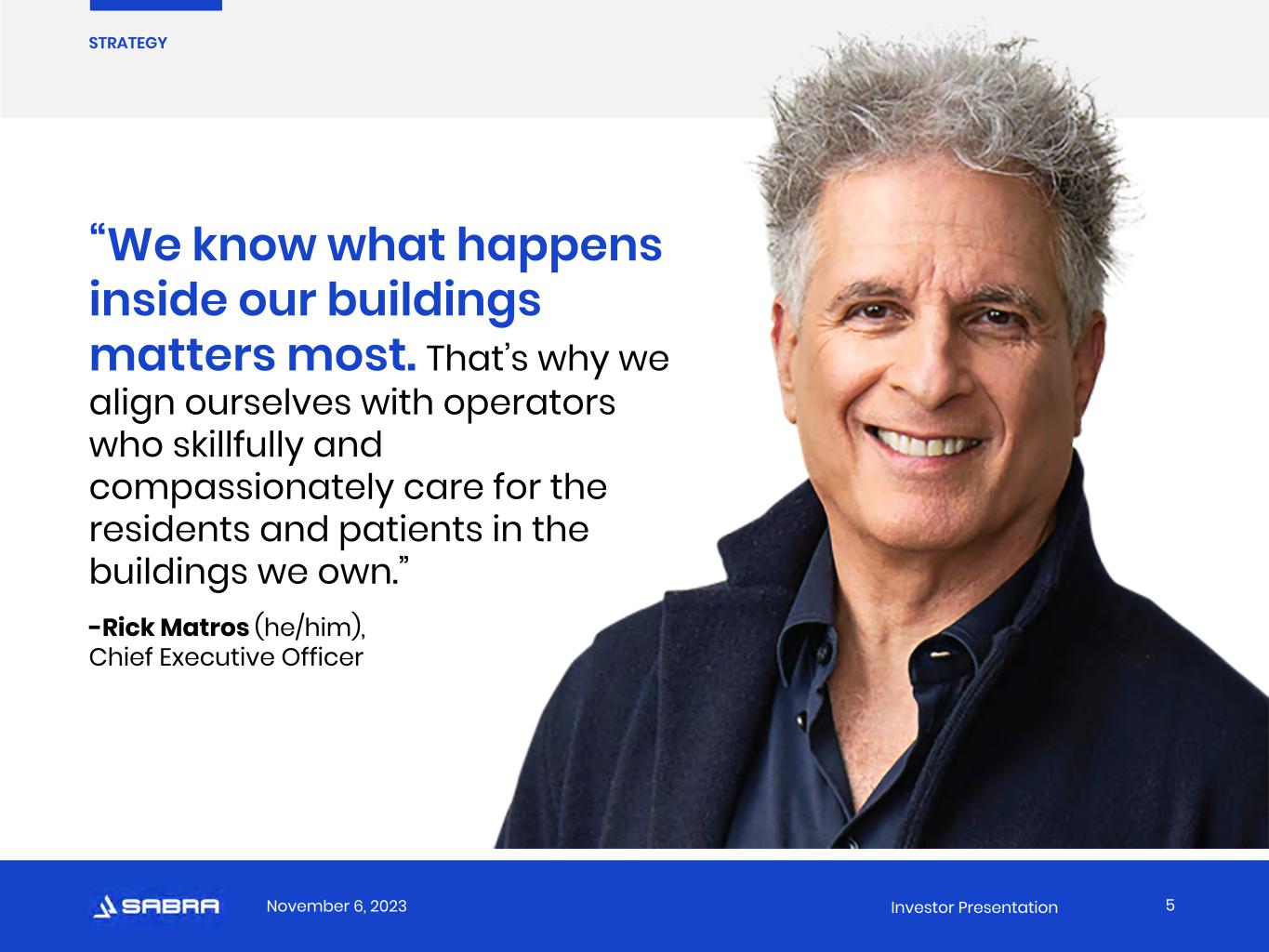 LOREM IPSUM Heading November 6, 2023 Investor Presentation Our passion for quality care and deep industry experience uniquely position Sabra to succeed in the dynamic healthcare real estate market. We have the size, know-how and resilient balance sheet necessary to deliver long-term value to shareholders. Uniquely Positioned to Thrive 4