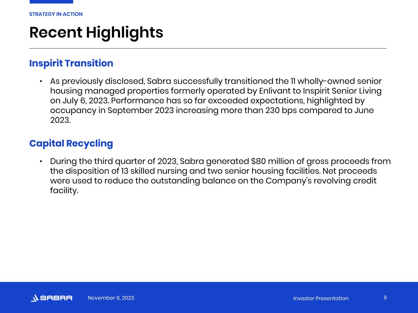 November 6, 2023 Investor Presentation Illustrative NOI Upside 8 STRATEGY We believe the Annualized Cash NOI upside opportunity for Sabra’s portfolio is attractive. The upside is a result of the Company’s internal growth initiatives over the past several years, as well as the benefits of the broader healthcare industry’s continued recovery from the pandemic. Annualized Cash NOI Upside Opportunity Annualized Cash NOI - 3Q 2023 $ 454 Recovery in Senior Housing - Managed portfolio 1 ~27 Previously disclosed transition of 25 properties 2 ~4 Previously disclosed Behavioral Health conversions 2 ~4 Annualized Cash NOI including upside opportunity $ ~489 (Dollars in millions) 1 Incremental Annualized Cash NOI assuming pre-COVID Occupancy Percentage of ~87% and Cash NOI Margin of~33%, as compared to Occupancy Percentage of ~81% and Cash NOI Margin of ~26% in 3Q 2023. 2 Assumes transitions/conversions occurred on the first day of 3Q 2023.